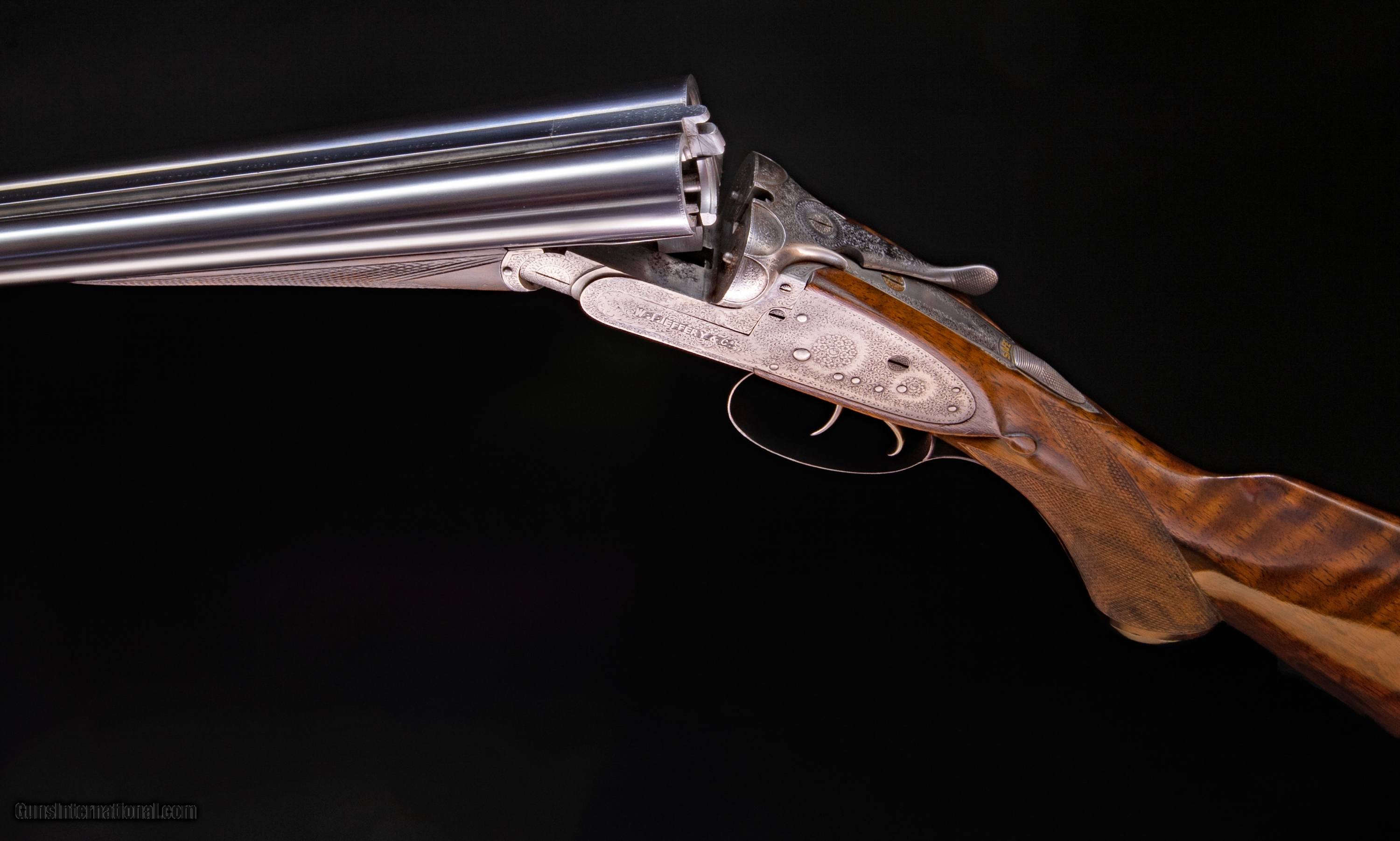 Description: Hammerless Sidelocks - We are very pleased to offer this wonderful opportunity for a quality 16g. London sidelock as they are hard for us to find. This fine double is tight on face and field ready and comes in its maker\'s case. *** Note: To see this gun with high resolution photos and a zoom-in feature, go to the vintagedoubles main site and search for the gun ID: 5096 or browse the main site to see our full gun collection. SOLD Manufacturer: W.J. Jeffery of London cased sidelock 16g. with long LOP Model: None Serial Number: 9206 Ejectors: Yes Barrels: 28 Barrel Type: Steel Action: Sidelock ejector Gauge Info: 16 gauge Stock Comb: 1 7/16 Stock Heel: 2 Stock Cast: 3/8 LOP: 15 1/4 to checkered Weight: 6 lbs. 2 oz. Choke Left: .008 Choke Right: .002 Proof:Nitro: 2 1/2 Minimum Wall Thickness Left: .029 Minimum Wall Thickness Right: .030 |