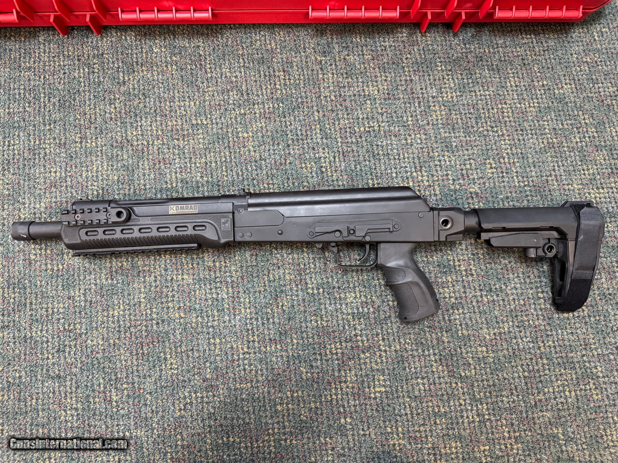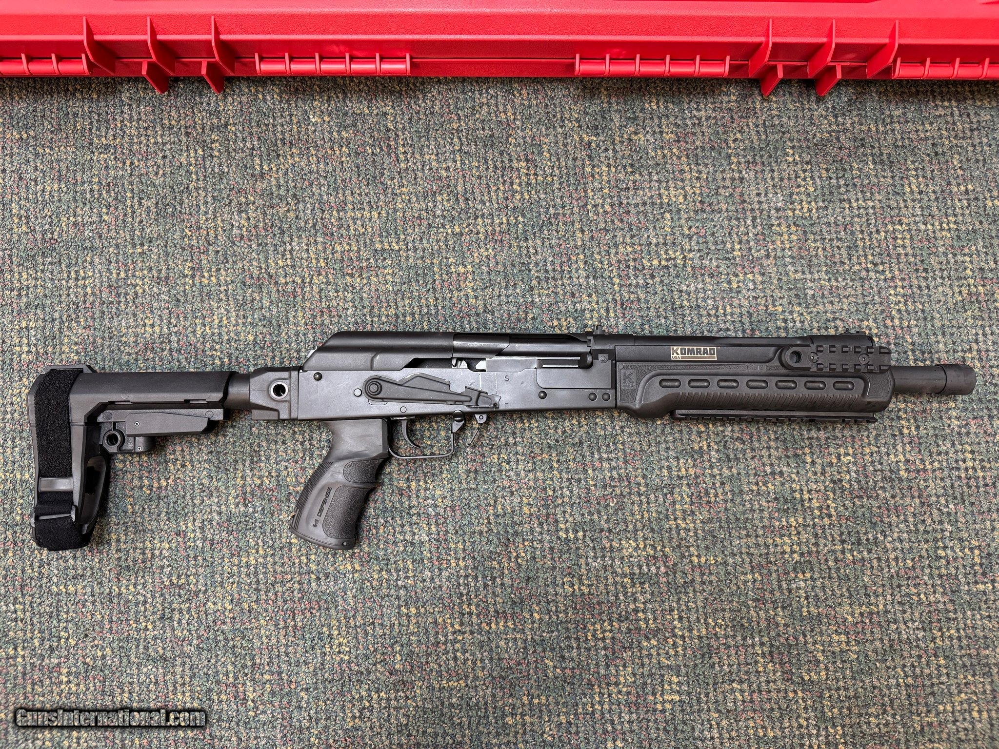 Description: Guns Listing ID: 520935 Kalashnikov USA, KOMRAD, Non-NFA Firearm, Semi-automatic, AK-Pattern, 12 Gauge 3\", 12.5\" Barrel, OAL 31.5\", Black Finish, SBA3 Brace, CAA Pistol Grip and Forward Grip, 5x Mags -Firearm is in excellent condition -5x Mags (3x 10 round, 2x 5rd) -Comes with Original Hardcase SOLD Manufacturer: KALASHNIKOV Model: KOMRAD KS-12 Condition: Used - Non-Certified Barrels: 12.5 Action: SEMI AUTOMATIC Gauge Info: 12 GA |