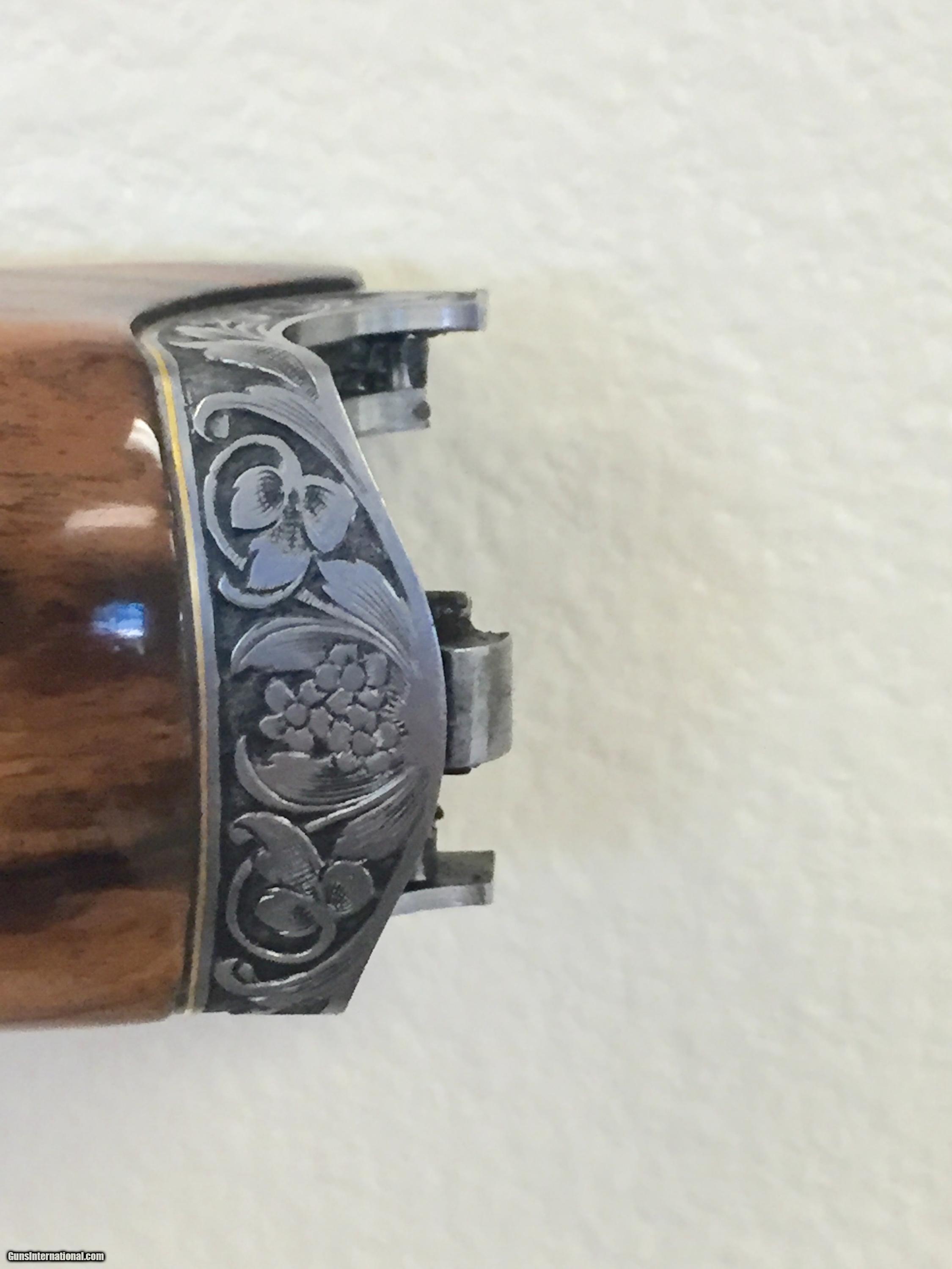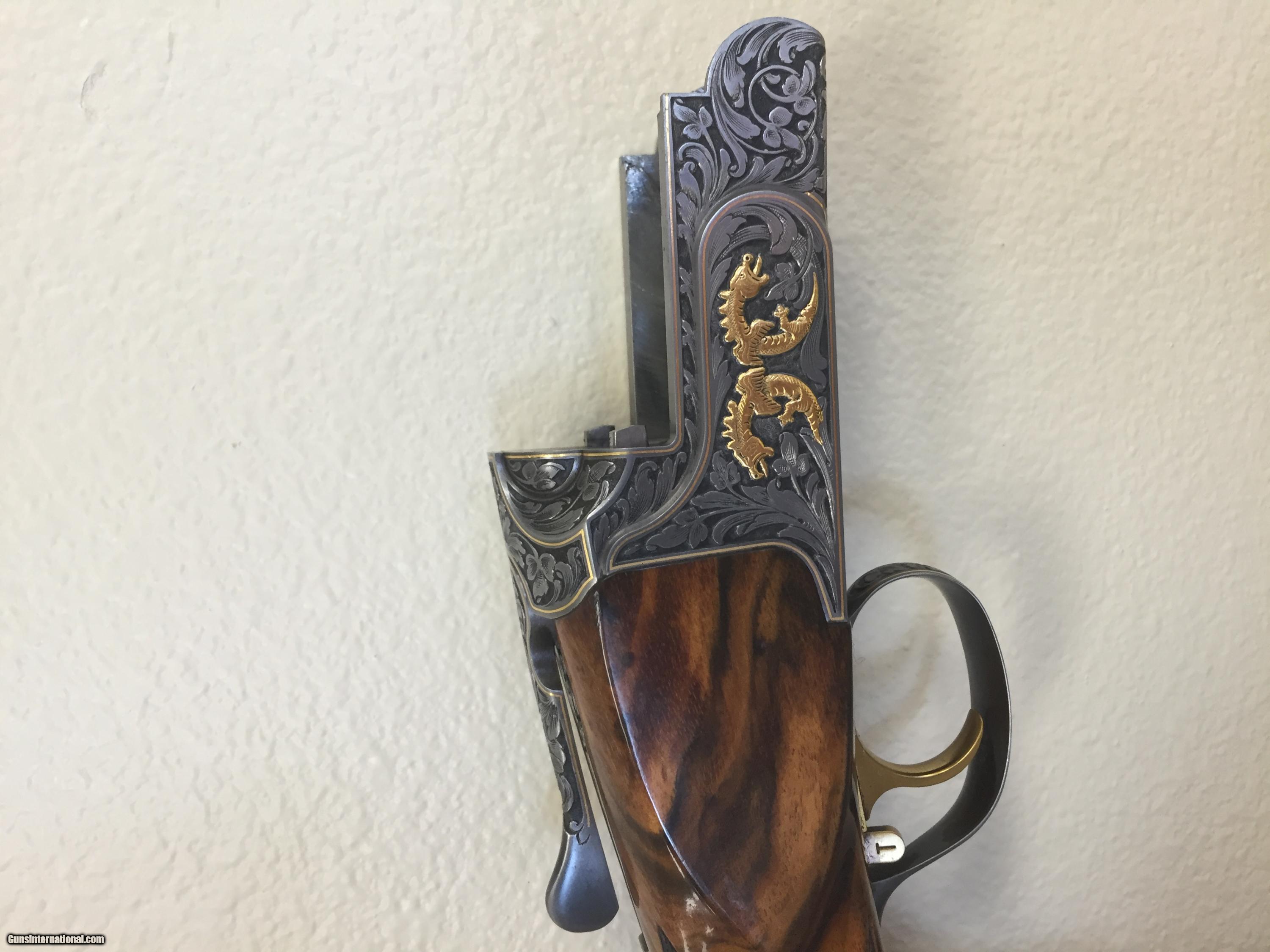 Description: Kolar skeet exhibition custom gold model. One of only two produced with gold dragons. Factory engraved by Dennis Zietz in a custom 17/18 Kolar engraving pattern. Wood is French Walnut. Gun has a 2 digit serial number, as Kolar reserved its first hundred serial numbers for limited units. Complete with full set of Kolar AAA small gauge tubes with five chokes in each gauge. 12 gauge bbl. has recessed chokes. Has an adjustable Todd Nelson soft comb and adjustable butt. Gun has been regularly serviced by Kolar, and is tight. Trigger is adjustable for length of pull. Barrel is a 28" step rib model with a high polish blue finish. Metal would rate 98-99% and wood has a few normal use minor dings. Comes with all paper work, tools, etc. in a Nasco case. SOLD Bore: 750 Ejectors: Automatic Metal Condition: excellent Wood Condition: very good Bore Condition: excellent Barrels: 1 Barrel Type: OU Triggers: single pull Gauge Info: 12 ga Stock: exhibition Stock Comb: adjustable Butt Pad: adjustable LOP: 14.25 in Rib: step Engraving: exhibition custom 18 Extras: AAA Tube Tubes |