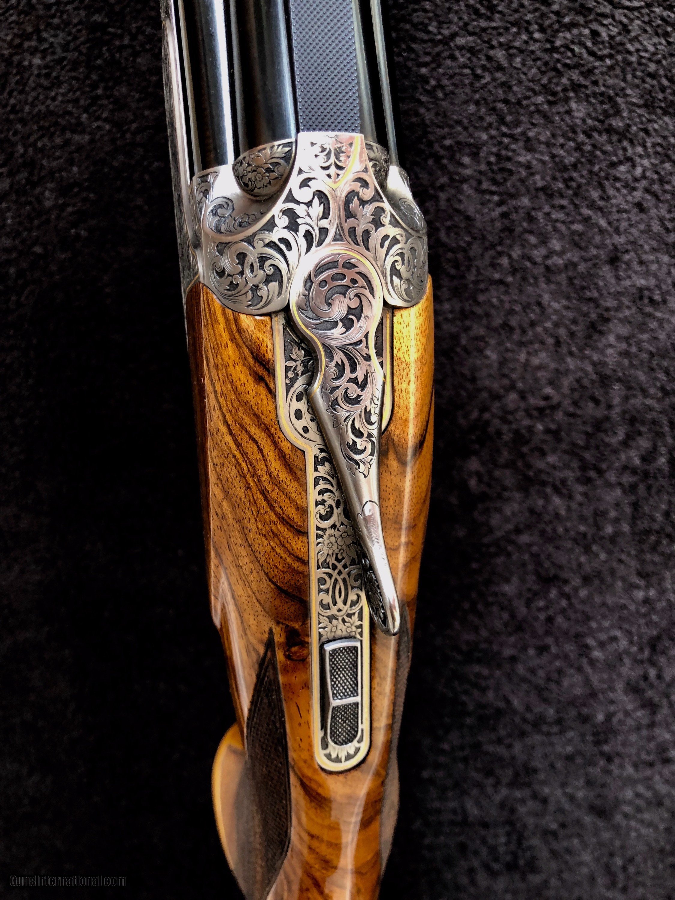 Description: Selling my personal custom engraved one of a kind Kolar. Serial #4922. Gun started off as a plain blued receiver and had the gun custom engraved by master engraver Valentini in Brescia Italy. Deep relief engraving that is exquisite with deep floral and gold gargoyle on the bottom. Followed by a gold line border around the entire receiver with a pierced top lever with flower The buyer will have a choice on what style barrel they would like with the gun. The gun can be sold with a 32 inch ramp tapered max lite or 30 inch ramp tapered max lite barrel. I also can sell the gun with a 32 inch low profile adjustable rib .750 barrel OR a 30 inch step rib barrel. Which ever barrel the buyer chooses, barrel will come with full set of choke tubes Stock set is a one of kind English walnut from Wenig. Dimensions off ramp tapered rib 1.30 x 1.30 x 1.35 Length of pull 15.25 Right hand palm swell 5/8 cast off at the toe Gun comes with Negrini case and all the books, tools and factory accessories. Truly a one of a kind custom Kolar that is top of the line in every way. Condition is pristine. SOLD |