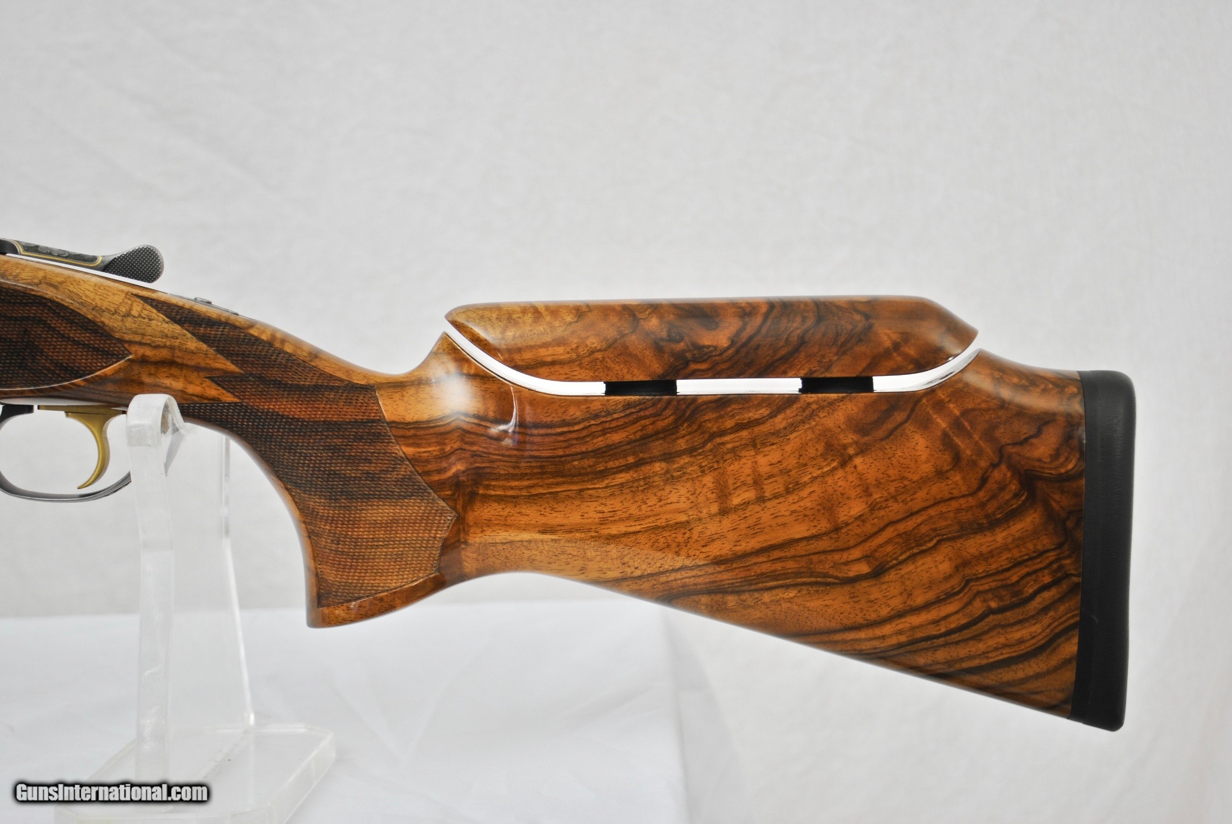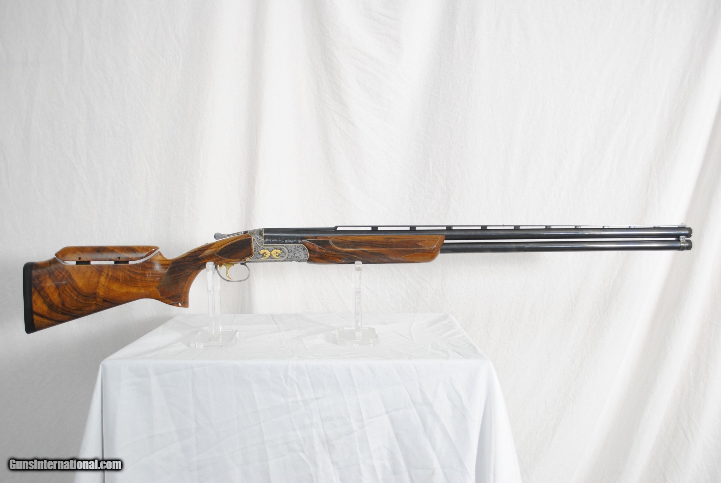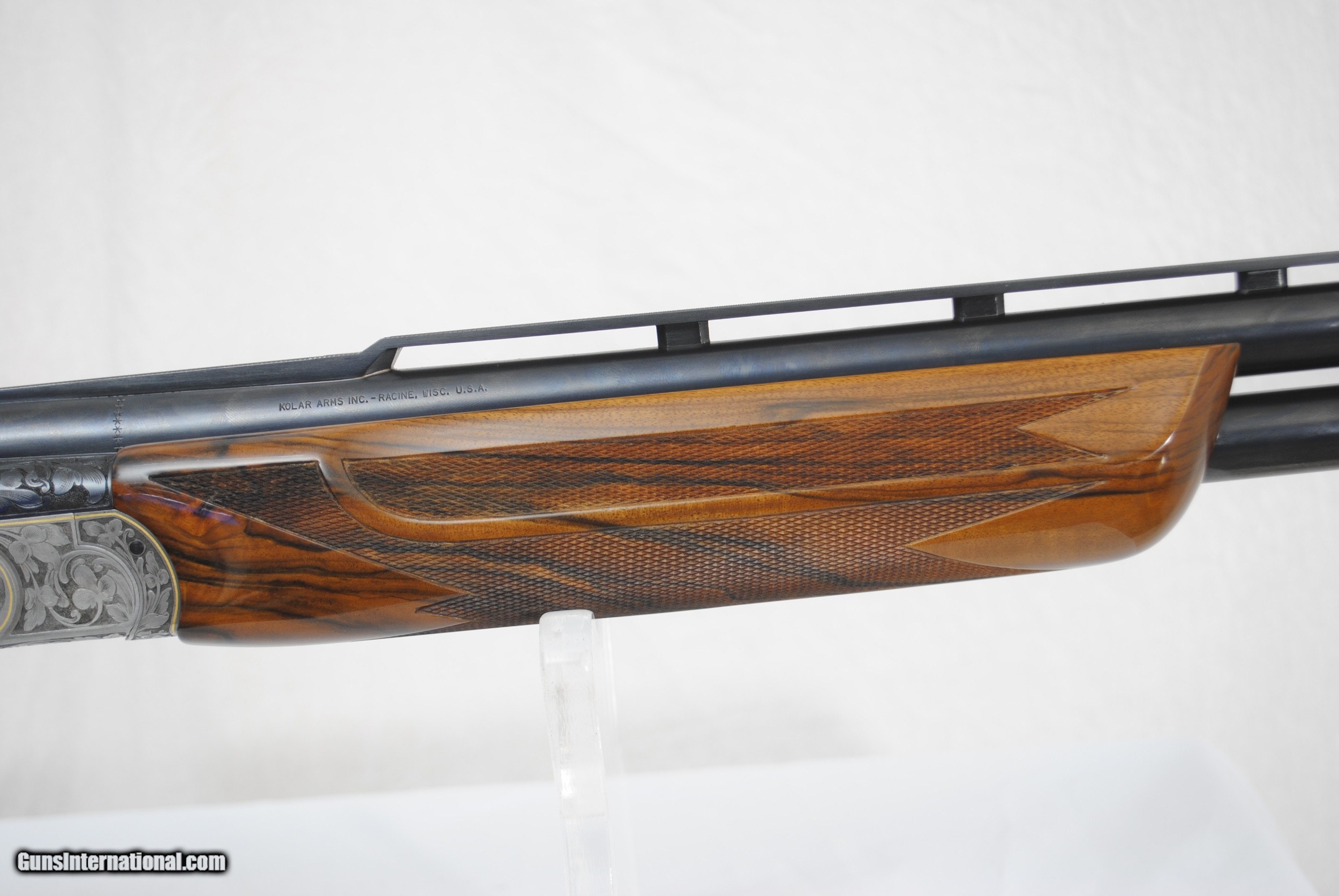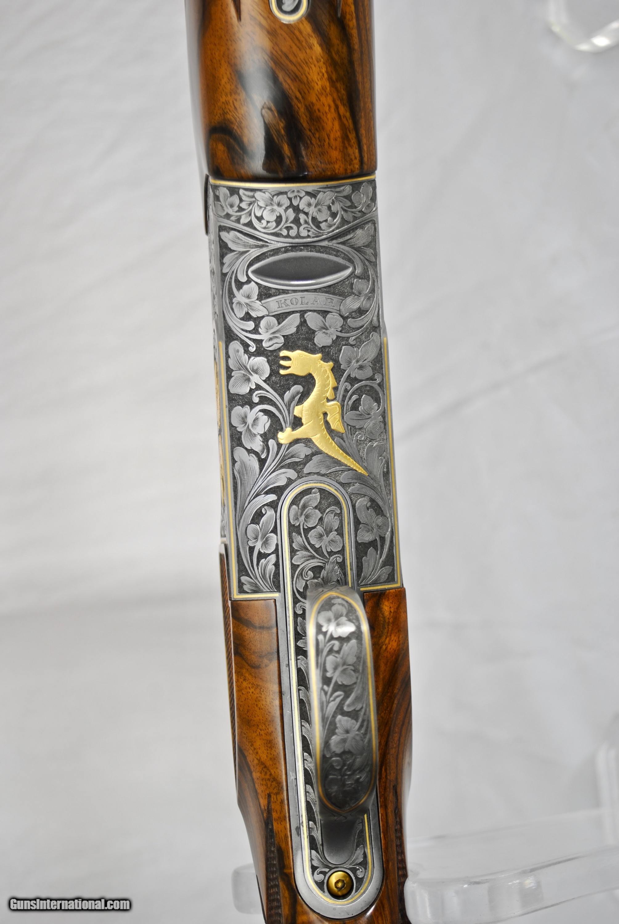 Description: Here is an Exhibition Grade Kolar Trap with Gold Gargoyales. Barrels are 32" with two Kolar Choke tubes (Imp Mod and Full) and a complete set of Muller Choke Tubes. Currently gun has a double release trigger, however parts are included to convert back to pull triggers. Bores measure as original at .740. This gun is in mint condition having recently been purchased from a local estate. Round count at most is a few hundred shells. Overall weight is 9.64 LBS. Extra parts as shown. Well figured stock has a palm swell for right hand. Adjustable comb with dimensions as shown of 14 1/2" LOP/Drop at Comb - 1 5/16"/Drop at Heel 2 5/8". Shipping is $100. Cased as shown. Here is a chance to own the finest American Made Shotgun. For inquiries please call Guy - 407-721-3748 SOLD |