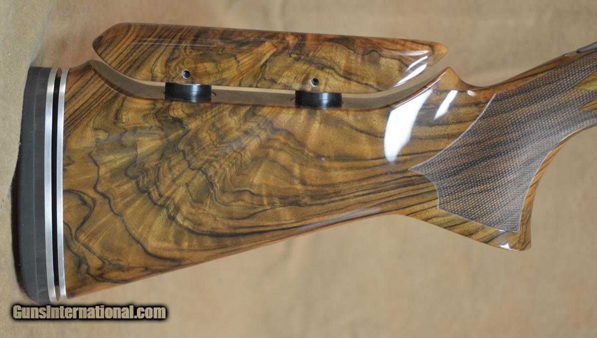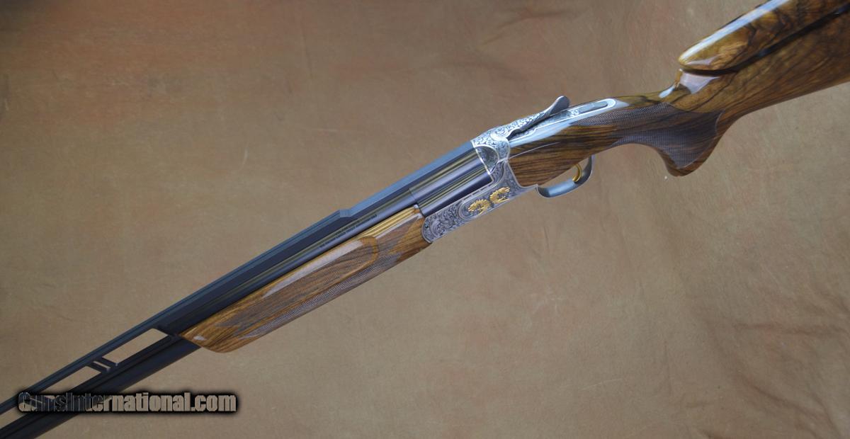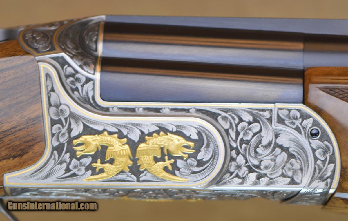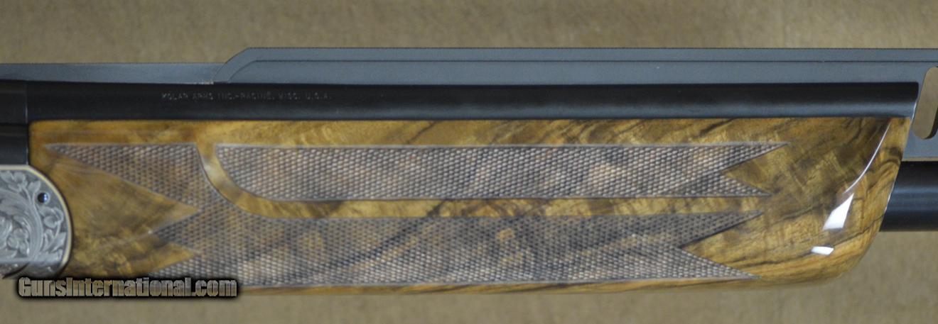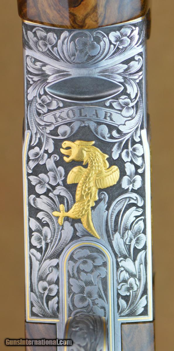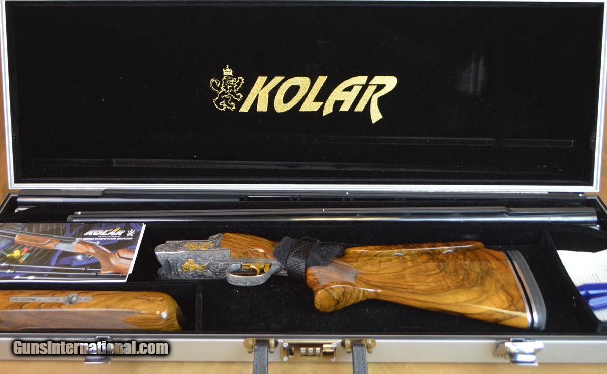 Description: Kolar Custom Gold Trap Combo 12GA with 30" O/U barrels, factory choke tubed with Stepped tapered rib, 34" UnSingle factory choke tubed barrel, stepped tapered rib. Outstanding factory scroll engraved receiver with gold borders, gold inlayed gargoyles. Outstanding factory Right-Hand Monte Carlo adj. comb stock, adj. butt plate. Overall outstanding condition with minor handling marks in stock and forearm. Includes parts for double release trigger, pull triggers installed. Factory Americase, chokes and tools. SOLD |