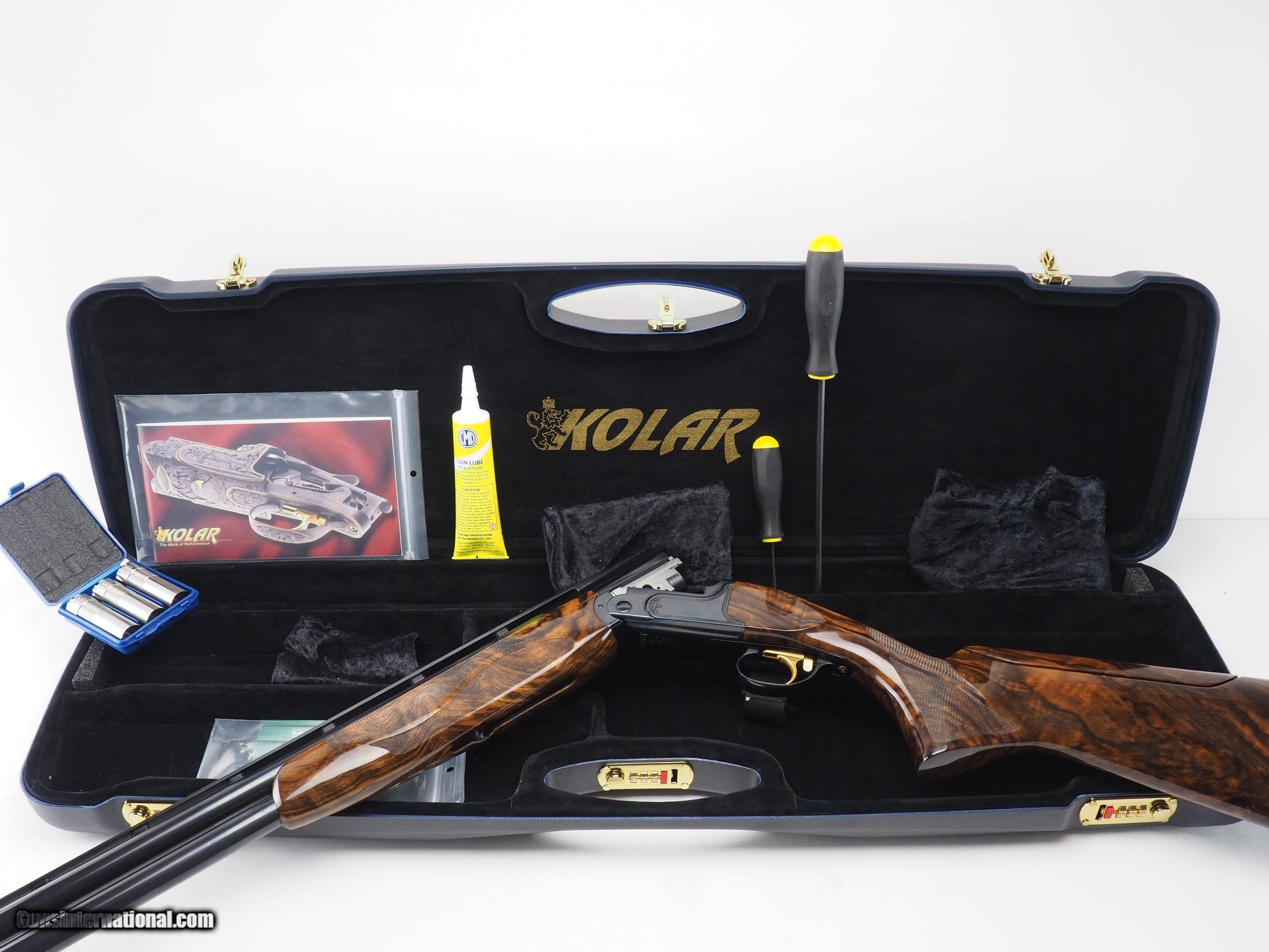 Description: Say good evening to the Midnight Special version of the Kolar Max Lite Sporting, featuring deep-polished and blued metalwork, gold trigger blade/body, and $2,000.00 wood upgrade for a truly timeless look. The Ramp Taper rib paired with the F1 (flat rib) stock gives sporting clays shooters much needed downward adjustament in the comb, which many guns these days lack. This gun is brand new and comes complete in the factory Kolar case with all the chokes and accessories. Make: Kolar Model: Max Lite Sporting Gauge: 12ga Barrel length: 32” Hand: right hand Rib: Ramp Taper (mid rib) Stock: F1 (usually found on flat rib guns) LOP: 14 3/4" Drop at comb: 1 13/16" Drop at heel: 2 3/16" Comb offset: 1/8" Toe-out: 1/4” Wood upgrade amount: $2,000.00 Chokes: 5x factory titanium of your choice Case: Kolar factory (by Negrini) SOLD |