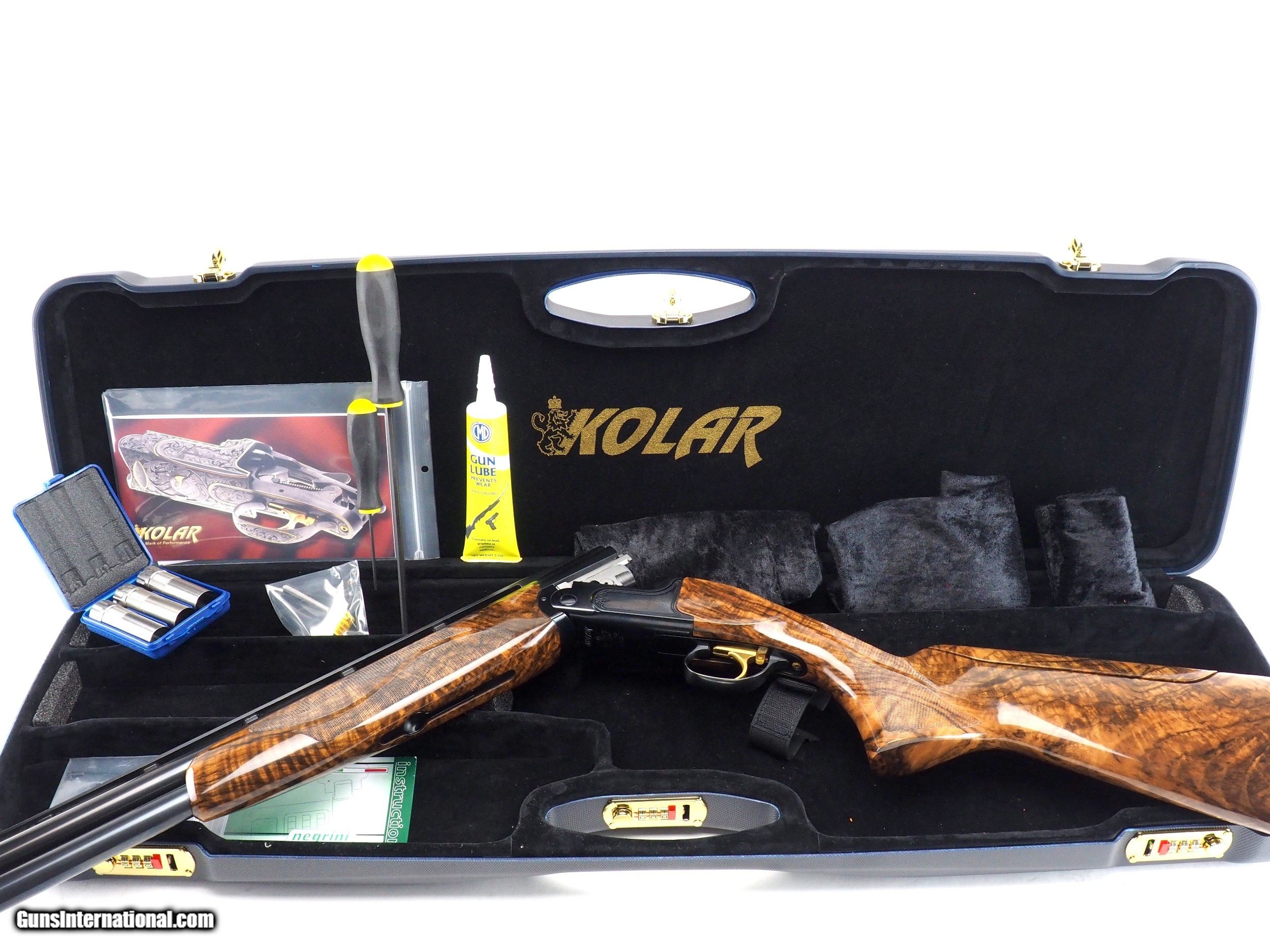 Description: Say good evening to the Midnight Special version of the Kolar Max Lite Sporting, featuring deep-polished and blued metalwork, gold trigger blade/body, and $4000.00 wood upgrade for a truly timeless look. The Ramp Taper rib paired with the F1 (flat rib) stock gives sporting clays shooters much needed downward adjustament in the comb, which many guns these days lack. This gun is brand new and comes complete in the factory Kolar case with all the chokes and accessories. Make: Kolar Model: Max Lite Sporting Gauge: 12ga Barrel length: 32” Hand: right hand Rib: Ramp Taper (mid rib) Stock: F1 (usually found on flat rib guns) LOP: 14 3/4" Drop at comb: 1 13/16" Drop at heel: 2 3/16" Comb offset: 1/8" Toe-out: 1/4” Wood upgrade amount: $4000.00 Chokes: 5x factory titanium of your choice Case: Kolar factory (by Negrini) SOLD |