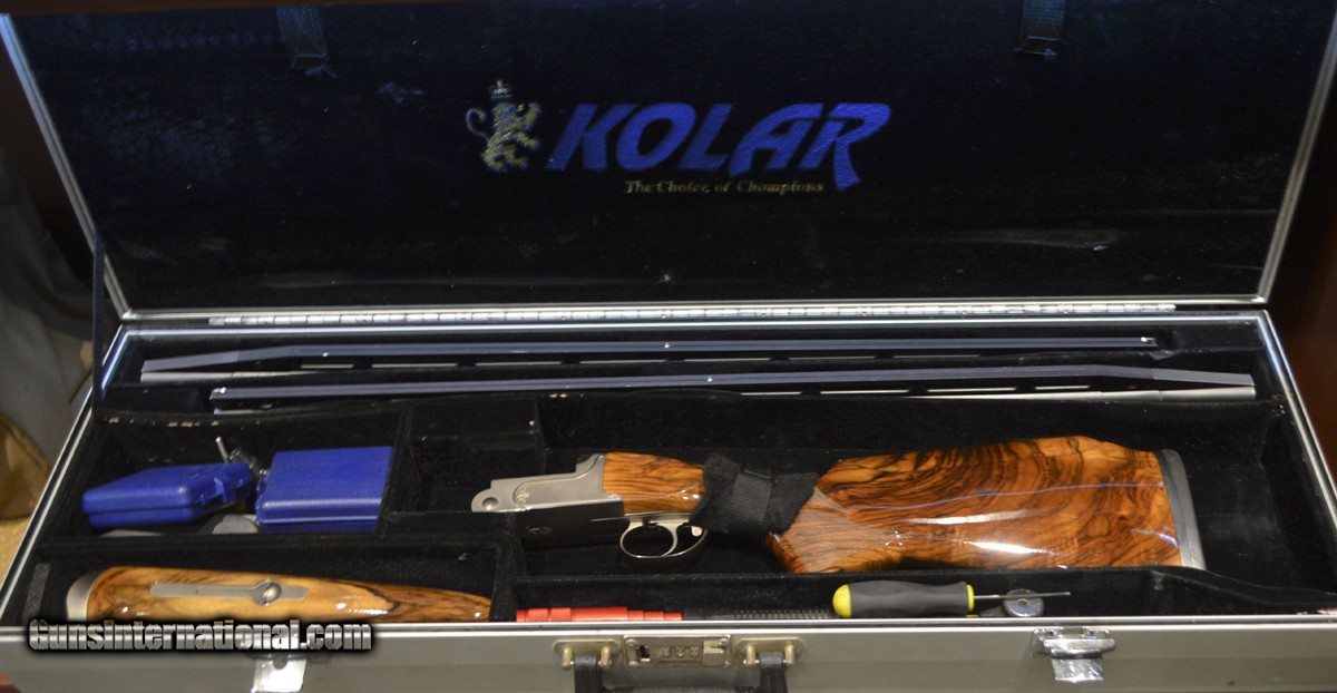 Description: Pre-Owned Kolar Carrier Barrel Skeet Combo 12GA with 30" factory Choke tubed adj. rib (.735 Bore) barrels, additional 30" carrier barrel with adj. rib and full set of Kolar AAA Max (20/28/.410) sub-gauge tubes. Factory nickel finished receiver with removable selective trigger. Factory adj. comb Monte Carlo stock with right-hand rollover and slim forearm. Fully refinished and re-checkered, wood is stunning! Includes Americase, tools. SOLD |