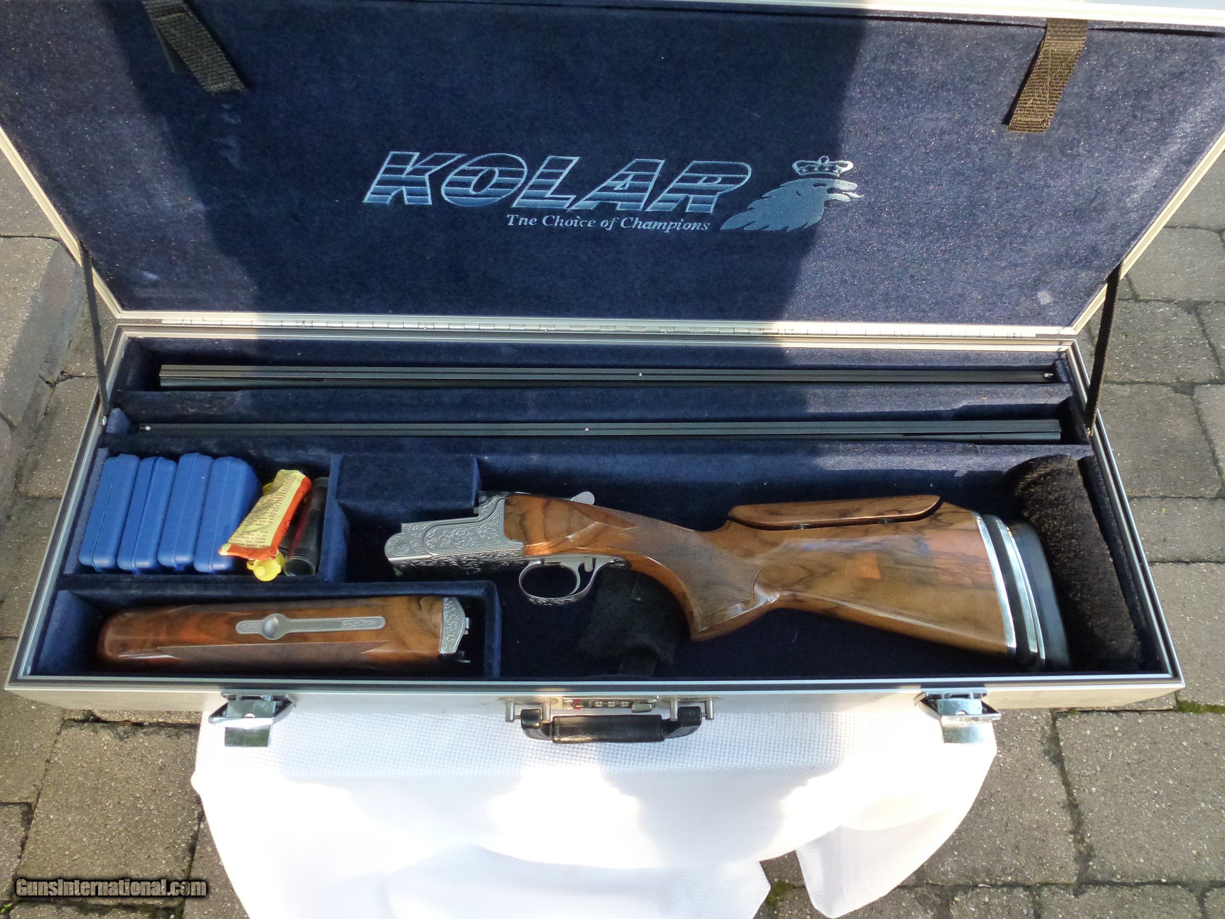 Description: Kolar Skeet/Sporting Combo 12 ga. 30" .740 bore flat rib standard weight barrels additional Carrier Barrels with Kolar AAA sub-gauge tubes. Factory Grade 2 endgraved nickel finished receiver. Beavertail forearm. Upgraded wood, adjustable comb, Gracoil, includes Americase, tools and chokes. Comes with many extra chokes for all gauges. Lightly used in excellent condition. SOLD SOLD Manufacturer: Kolar Model: Skeet/Sporting Combo Bore: 12 Chambers: 2.75 Ejectors: yes Condition: excellent Metal Condition: excellent Wood Condition: excellent Bore Condition: excellent Barrels: 30 Barrel Type: over/under Triggers: single/selective Gauge Info: 12 Rib: flat Finish: Nickel Chokes: yes Engraving: Grade 2 Extras: chokes Case: yes Item Location: IL |