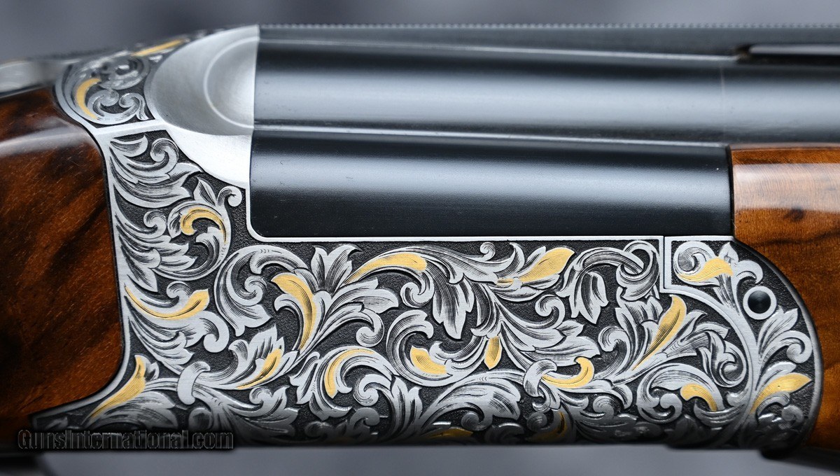Description: New Kolar Upland Grand Round Body Sporter 12ga. Features factory extended titanium choke tube 32" barrels with flat sporting rib. Engraved receiver featuring deep scroll patterns with gold highlights, upland game scene and removable selectable trigger hand engraved by Italian master engraver at Bottega Giovanelli. Outstanding right hand Sporting stock with adjustable comb and Round forend. Comes in factory leather trim case. Pacific Sporting Arms is the largest dealer in high grade shotguns in the world. SOLD Shotgun Gauge: 12 Gauge |