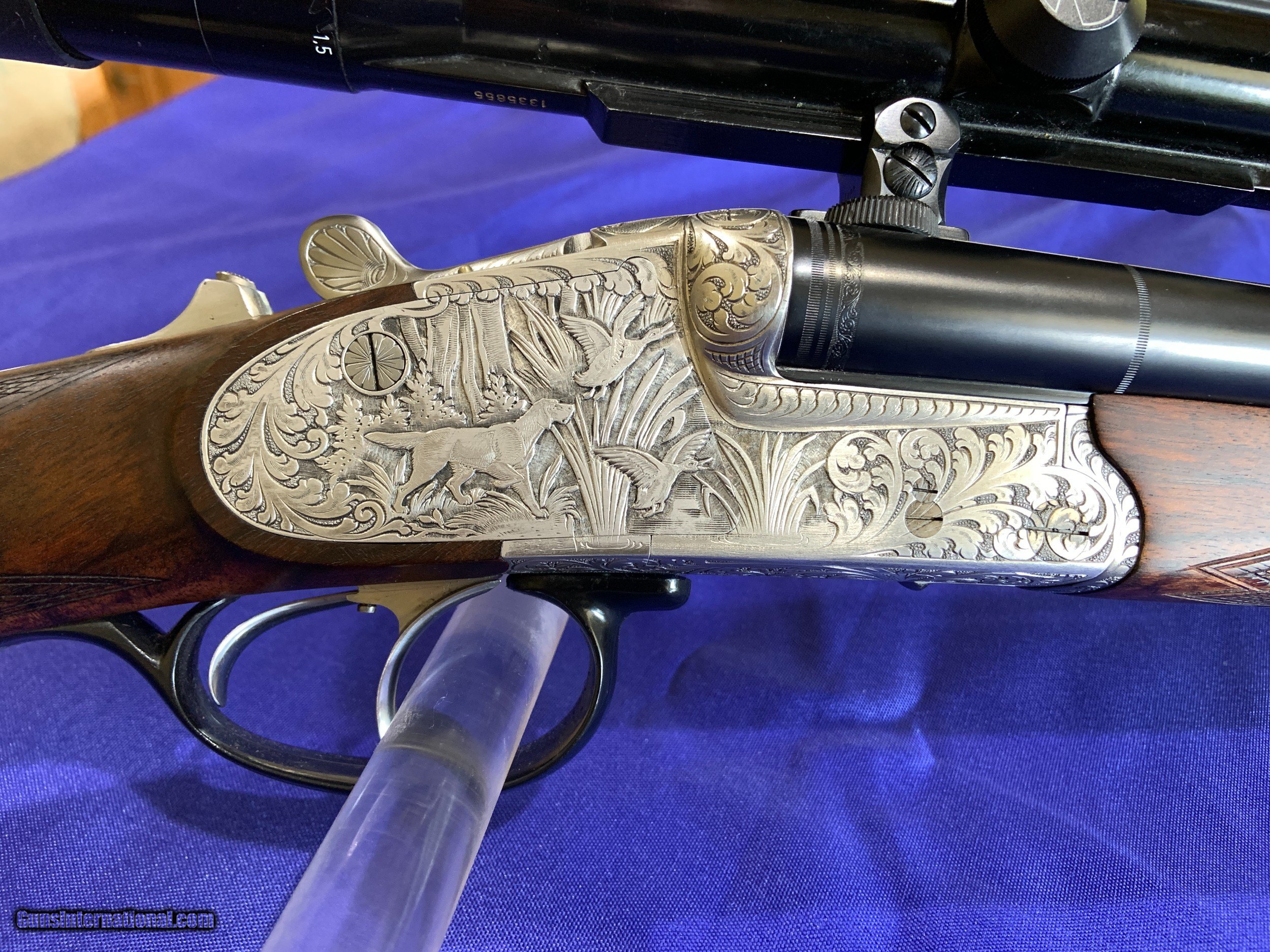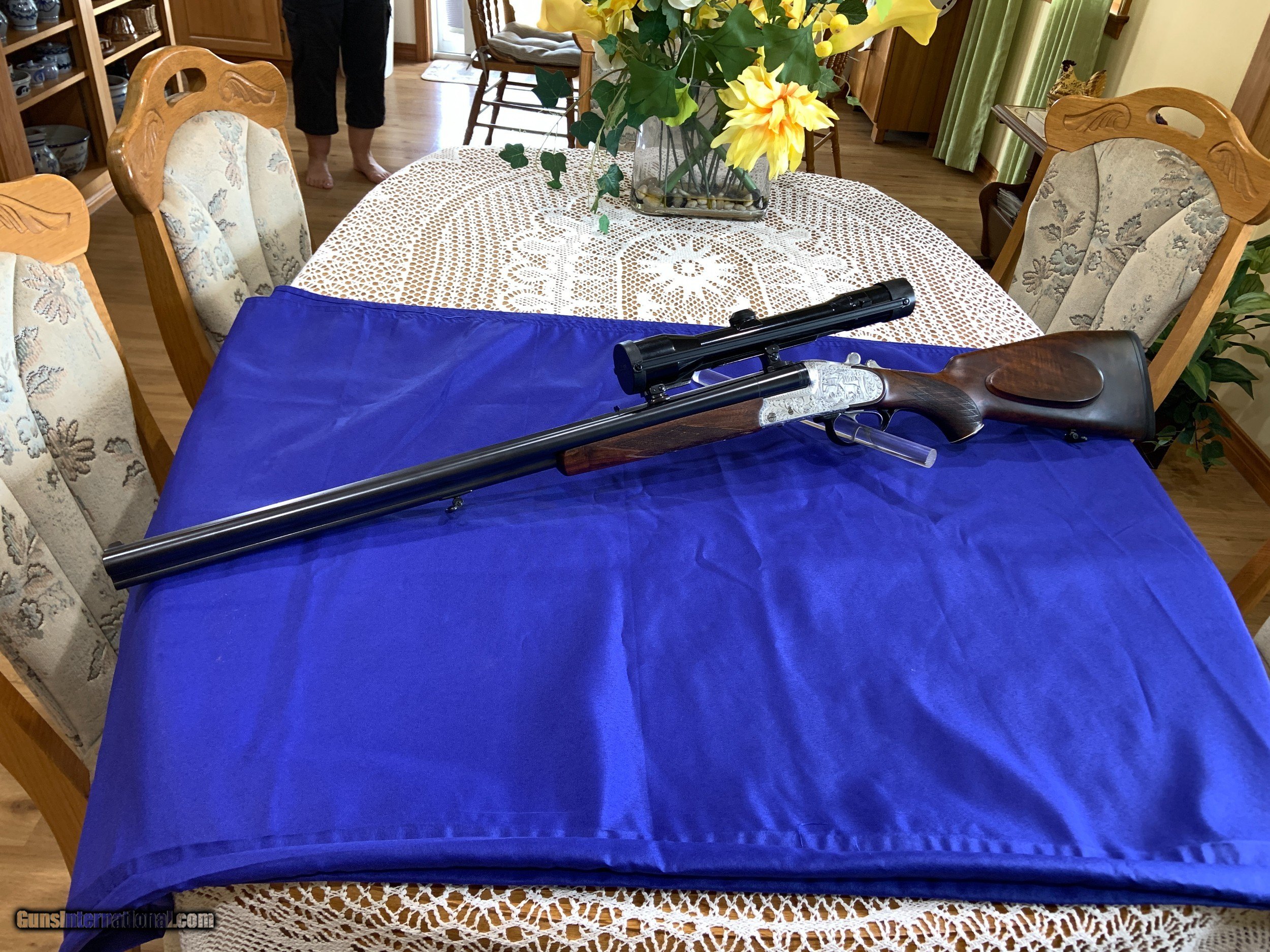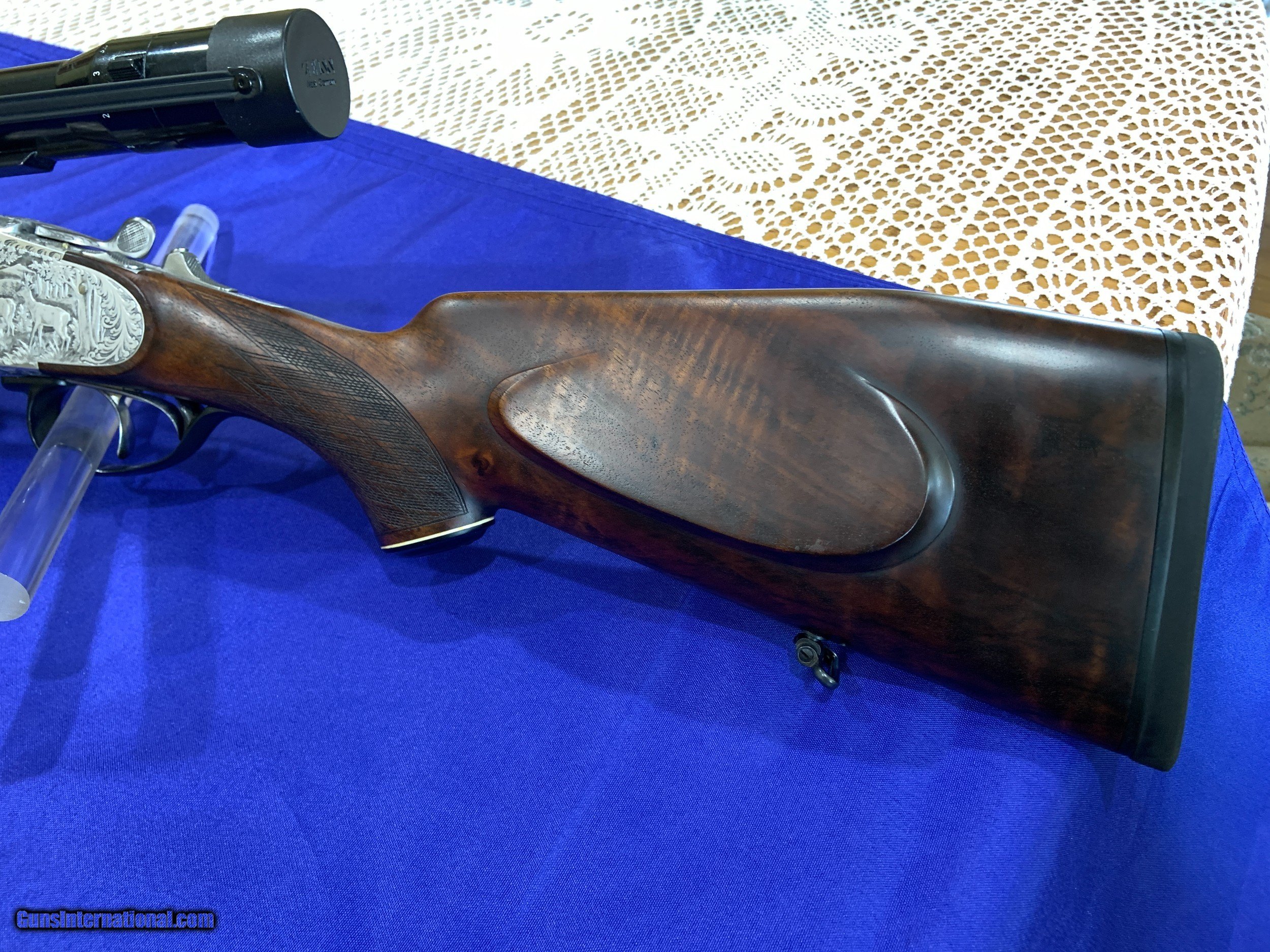 Description: Pending Sale! I am reducing the size of my Krieghoff collection and am offering several fine examples for sale here. These guns were purchased by me while stationed in Germany. Extras: Self Cocker, .set front trigger, 22 Hornet insert in right shotgun barrel. Proof Date: 1975 High Grade Wood Stock Rubber Butt Plate Double Trigger with Front being articulated set trigger. Cal. 7X65R / 16ga. / .22 Hornet Insert Chokes Full Pull: 14 3/8 Barrel: 25 in. Weight: 8lbs 10 oz.with scope and mounts. Engraving: Left Side Two Reh w/game scene fill. Right Side dog and two ducks w/game scene fill. Bottom Scroll. Scope: Zeiss Classic Diavari Z 1.5-6 X 42T German No. 1 Suhler Claw Mounts Asking Price $11.000 This Krieghoff is in great condition, 99% Blue. Wood is dark oiled finish in great condition. See pictures below. It has been fired very little as it has been a part of my collection since about 1986. I have never fired it. Today's value is in excess of $ 18.000. This is a fine example of a great drilling. It will definitely make some collector very happy. This is truly a great value for an investment or just a beautiful gun to hunt with. Complete picture file available on request. Fixed insured shipping cost of $60.00 to the lower 48 States Item will ship via Fed Ex insured to your FFL when funds clear. Thanks for looking! SOLD Rifle Caliber: 7x65mmR Shotgun Gauge: 16 Gauge Manufacturer: Krieghoff Model: Neptune Barrel Length: 25 in. Ejectors: Yes Condition: Excellant Metal Condition: Excellant Wood Condition: Excellant Bore Condition: Excellant Barrels: 25 in. Triggers: Set front trigger LOP: 14 3/8 in. Weight: 8 lbs 10 oz Manufacture Date: 1975 Engraving: Animal Extras: Self Cocker / Handspanner |