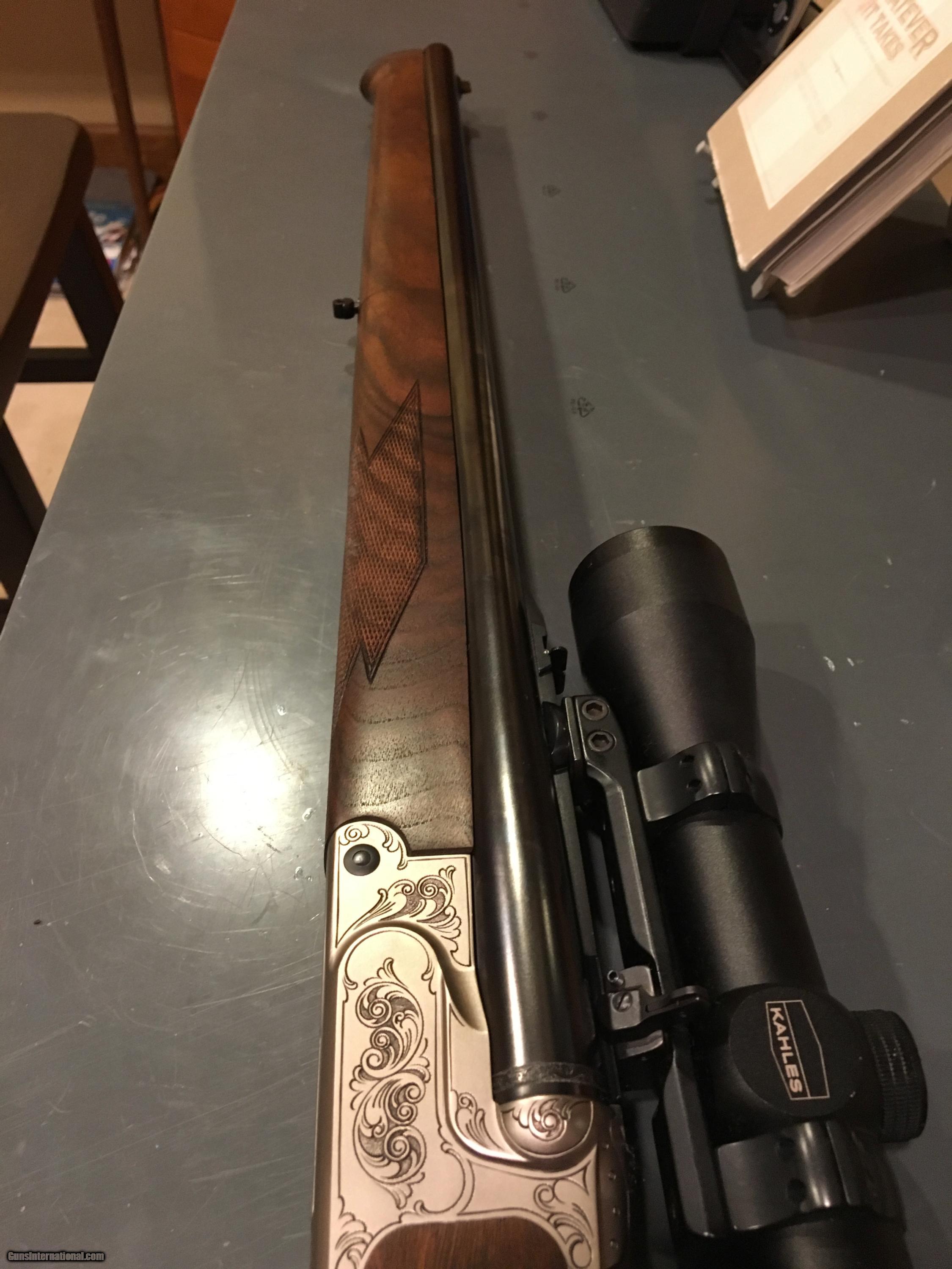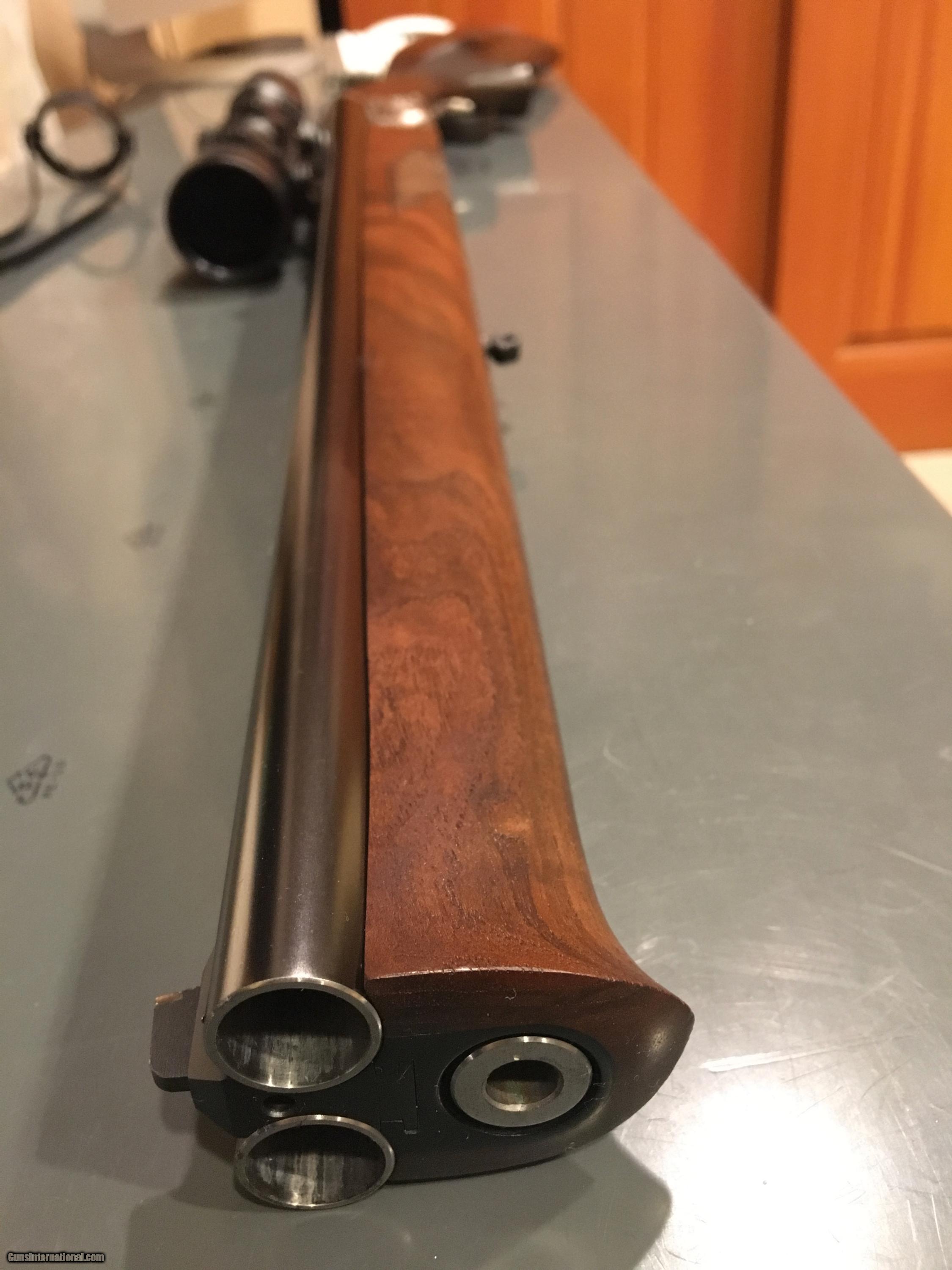 Description: Krieghoff Quadro Steingass 20X20 over 308,with Kahles 1X6 X42 scope and German twist mount (can be taken off easily and put back on in a few seconeds without losing zero), extremly rare, full stock, short and handy. It has a unique way of cocking it that you can have 3 rounds i the Chamber and it is always safe and not cocked until u push the lever forward, which at that time it is cocked. A feature that your friends will appreciate as much as you do, the gun can not ever go off since it is not ever cocked. 21.5 inch barrels The Steingass Drilling was an idea of Staatsforster Steingass - a lightweight three-barrel combination gun in a small frame, short barrels, and full wood shock.Krieghoff has installed their new Thermo TS Stabil system into the full wood stock of the Steingass Drilling - a marriage of form and function.The rifle barrel is "free floating" and adjustable. taken from drilling hot line site. only one box fired on the 20 guage, in perfect shape, i have never seen one for sale. $14750 to 10500 or offer on hold for the Gentelman from TEXAS SOLD |