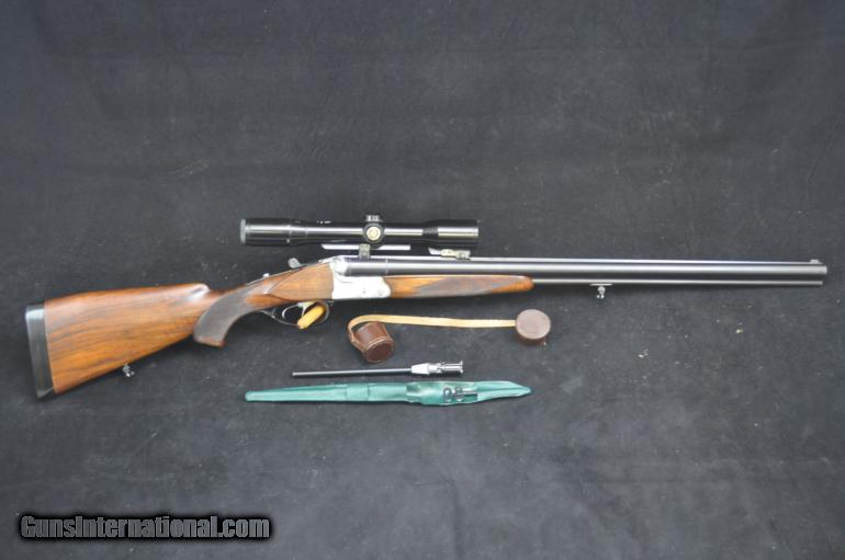 Description: Drilling in 16 gauge SxS upper, 7x65R(rimmed) rifle under with arabesque scroll engraved Dural Aluminum receiver. A 22 mag. insert included to fit into 16 gauge chamber. Hensoldt Wetzlar lightweight variable scope (1.5-6x) with tri-post reticle and lever mount. Double triggers with select fire switch on top tang and safety on side of receiver. Semi-pistol grip stock with cheekpiece, hard plastic butt pad and european sling swivels (3/4 inch). SOLD |