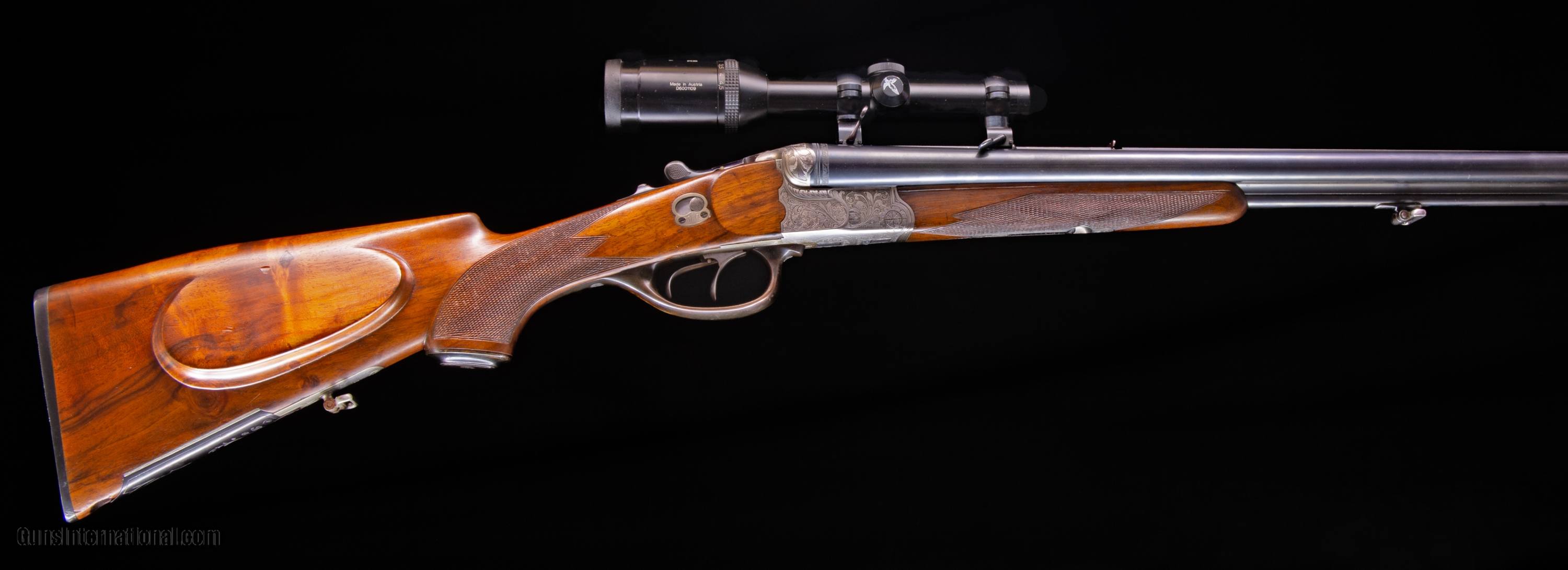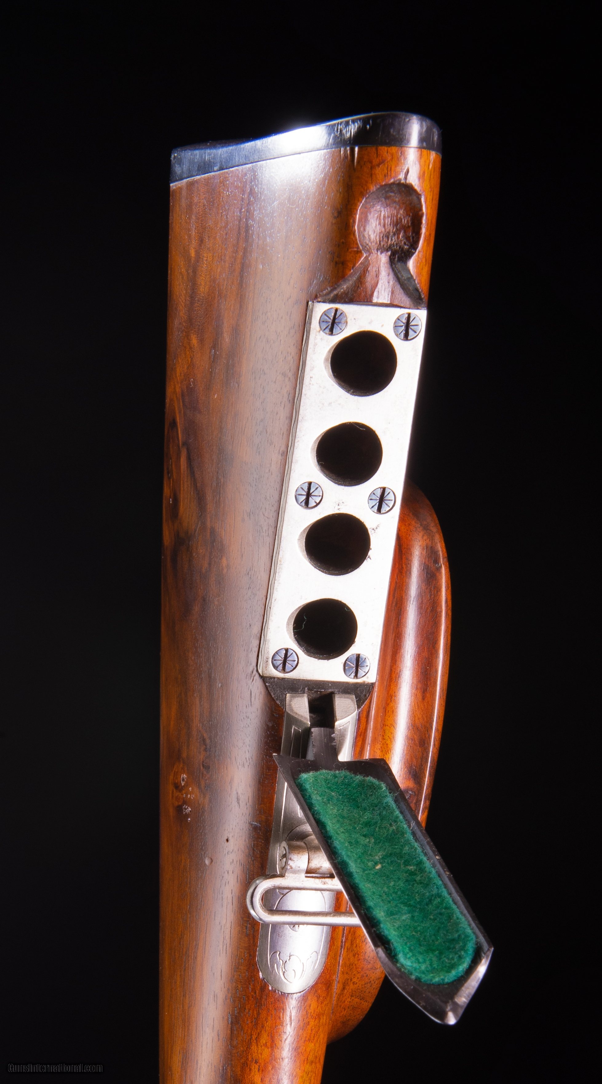 Description: Drillings, Double Rifles, and Rifles - This is a beautiful and high condition drilling that would be a joy to own and hunt with. There is a cheek piece on the right side but the gun has no cast off so shoots well for a right handed person also. Mirror bores and tight as a vault.