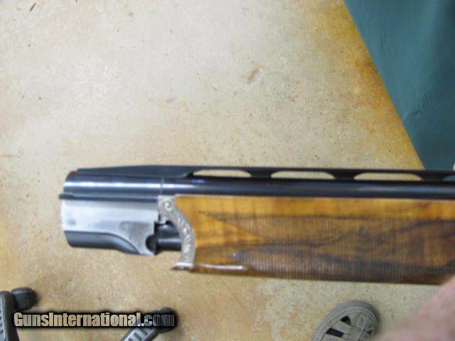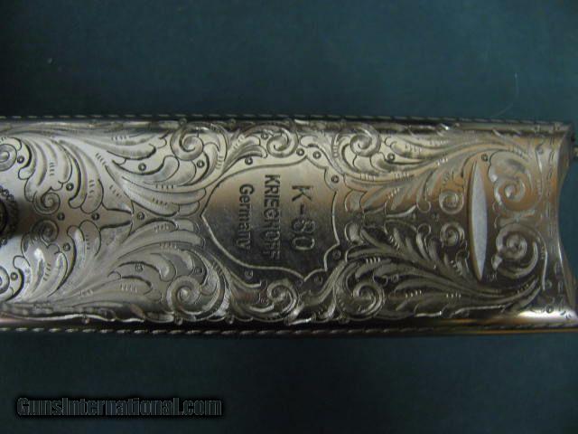 Description: 6261 Krieghoff K 80 SUPER SCROLL 12 gauge 30 inch ported barrells & Kolar 20 ga 28ga 410ga tube set,Americased, palm swell,unmatched barrel s/n, 5cks for 12ga 5cks for 20ga 3 cks for 410g,knock out, 3 wrenches, Kickeze pad at 14lop,seldom used, AS NEW IN CASE. FANCY WALNUT. SUPER EXCELLENT ENGRAVED SILVER RECEIVER. SOLD |