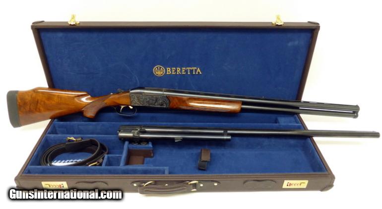 Heinrich Krieghoff 32 12 Gauge shotgun. San Remo grade 2-barrel trap set, with 30” extra full modified over/under barrels and 32” full choke single barrel. The receiver has full coverage deep relief scroll and game scene engraving and is in excellent condition. The barrels show some wear to the finish, overall very good condition with excellent bores. The Monte Carlo stock has a Kick-Eez recoil pad and 14 3/4” lop, and is in very good condition. A nice set, in a custom leather case.
