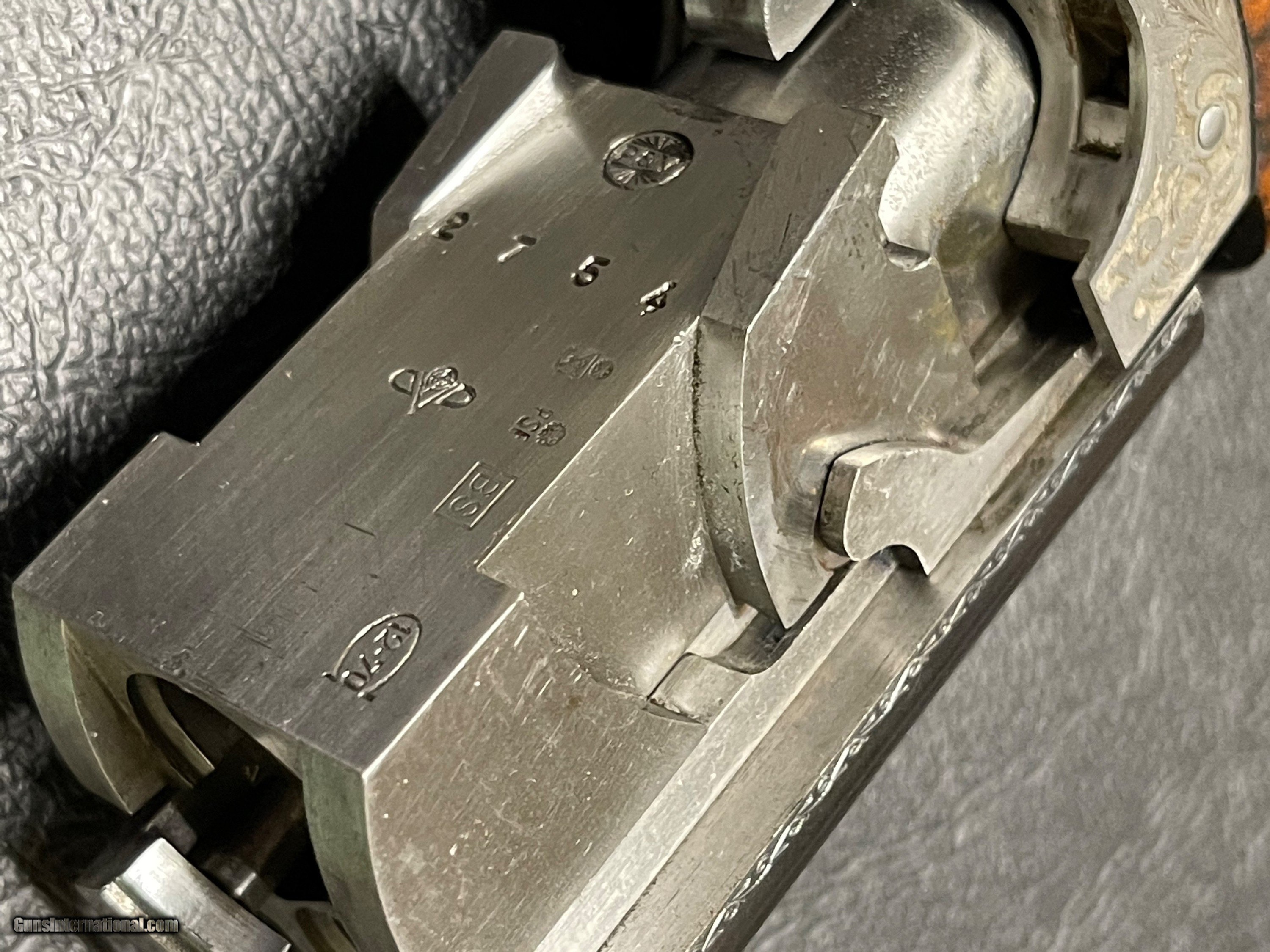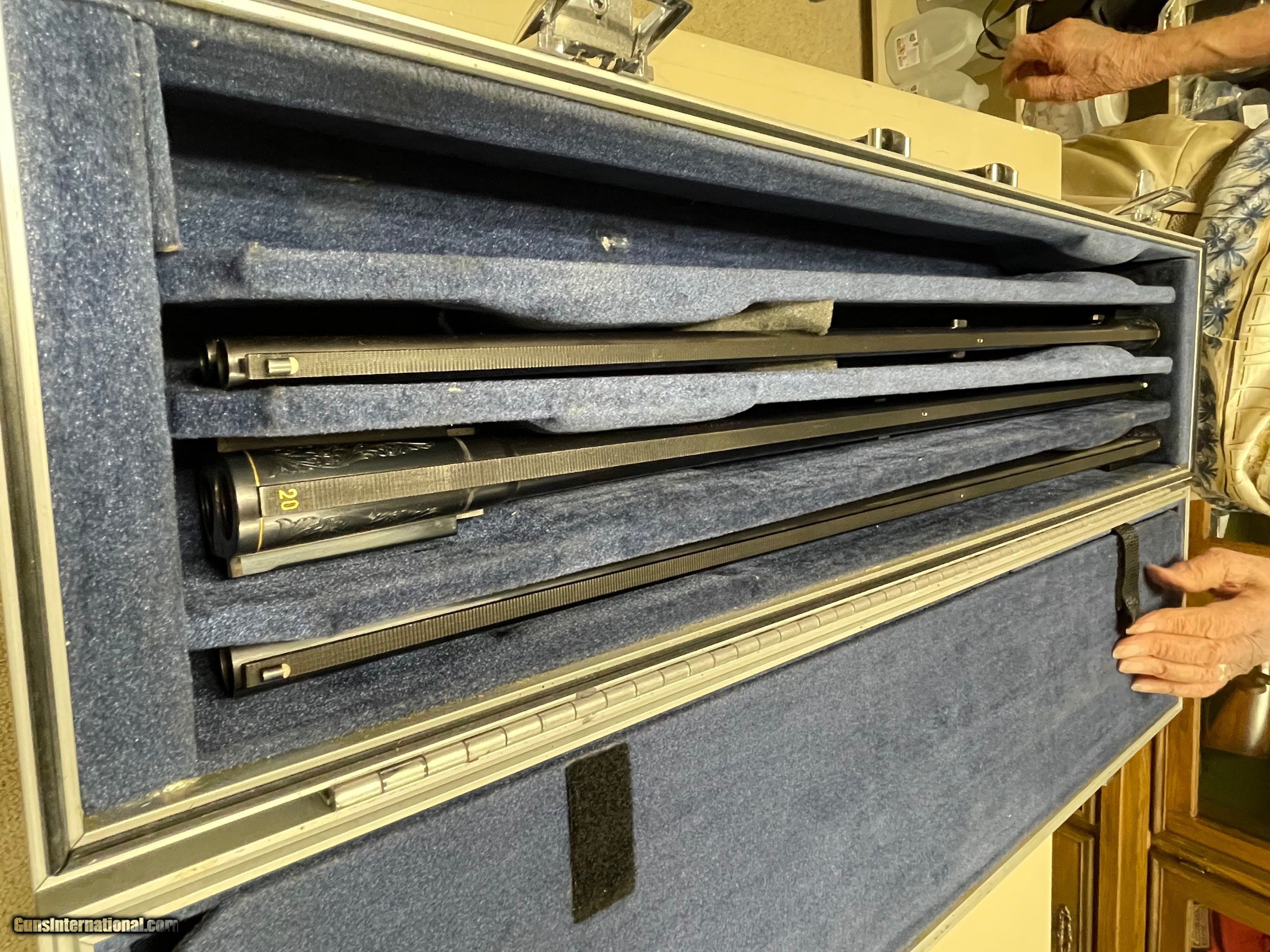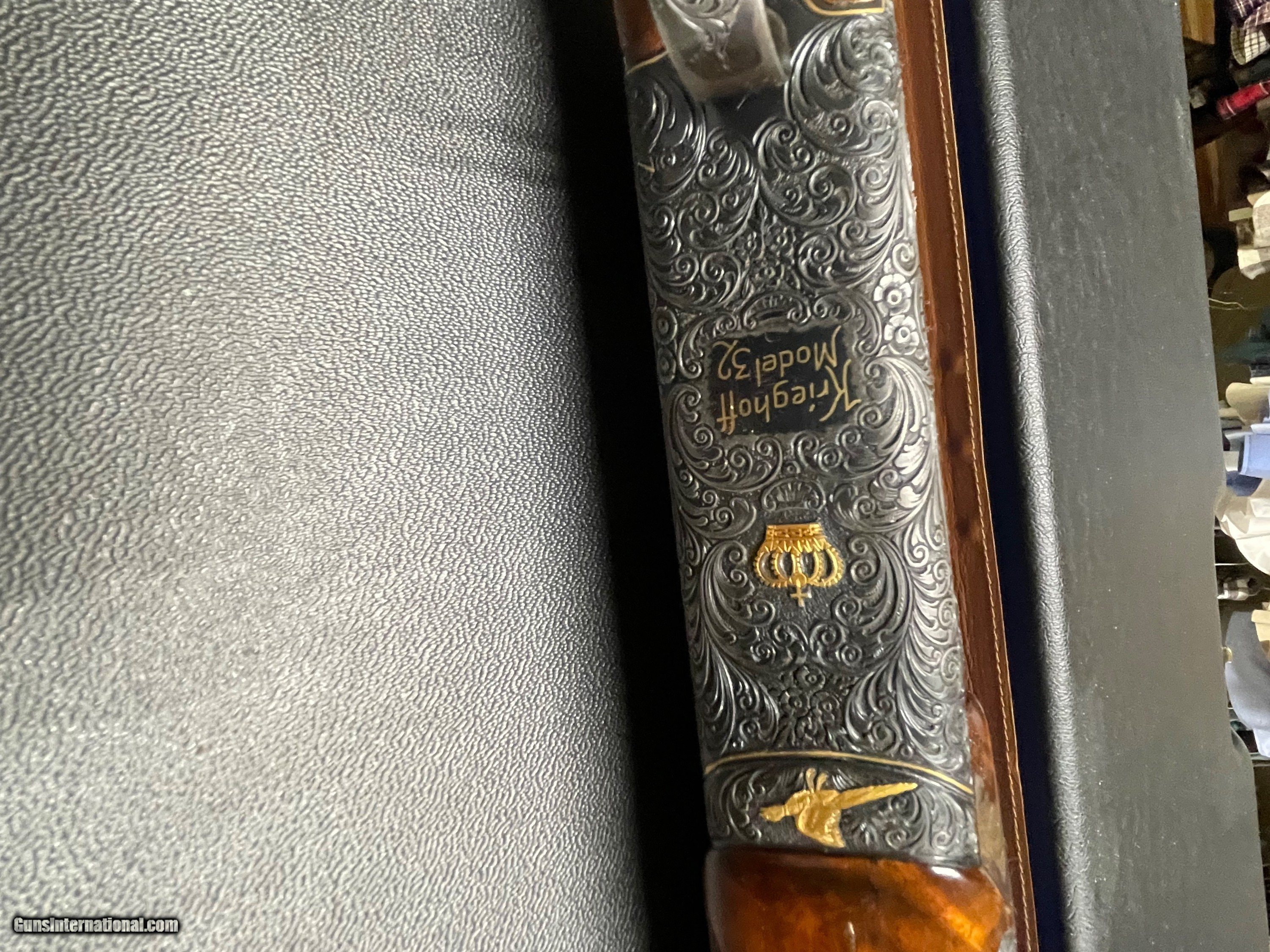 Description: K32 Super Crown skeet set with 12, 20, 28, and 410 skeet barrels and also has a Live Pigeon barrel with choke tubes for Sporting Clays. Has original K22 triggers. This was his skeet gun and has approximately 5,000 rounds through it. It was sent back to Kreighoff in 2019 for check up and any repairs that might be needed. This one also has a diamond inlaid in the silver for inlay on the right side. Beautiful guns in excellent condition. For serious buyers I'll be glad to send additional pictures or videos. SOLD Model: K32 Barrel Length: 30 Bore: Excellent Chambers: Excellent Ejectors: Excellent Condition: Excellent Metal Condition: Excellent Wood Condition: Minor dents from use and storage Bore Condition: Excellent Barrels: Excellent Barrel Type: Over/under Triggers: Selective Extras: 4 extra barrels Case: Factory aluminum Item Location: Hot Springs, Ar |