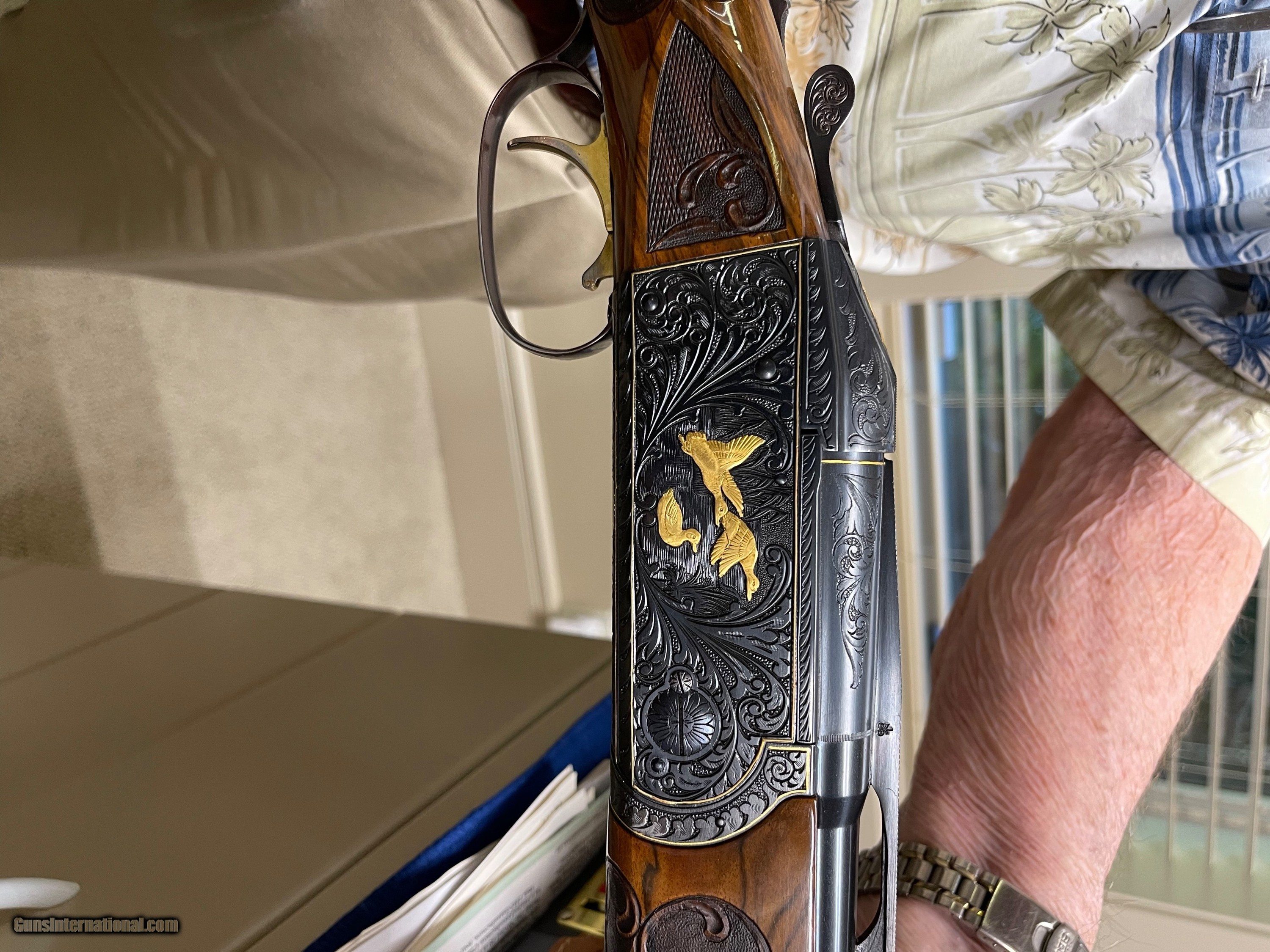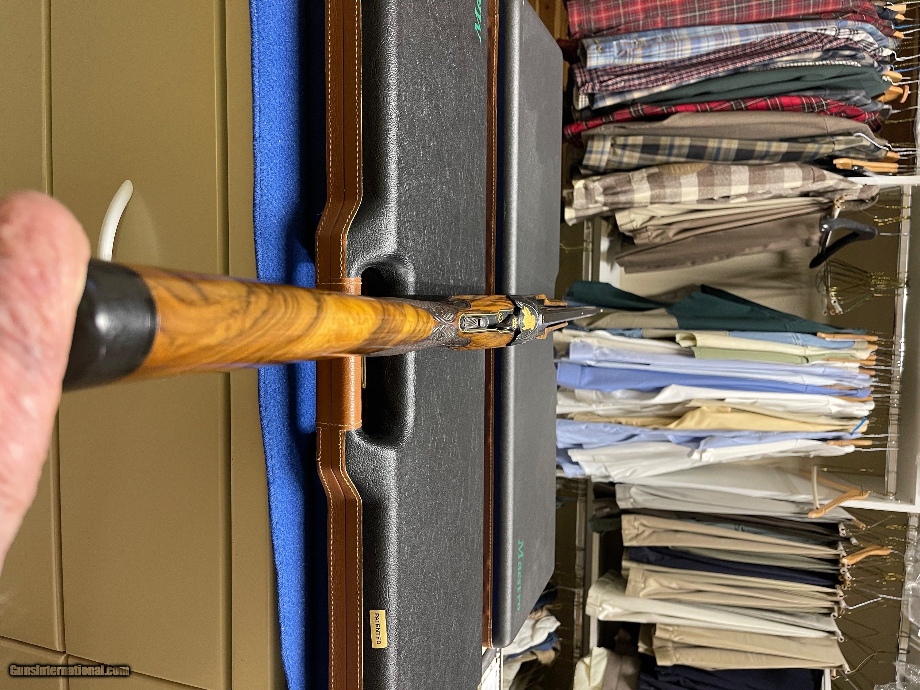 Description: I just found out that the 20,28 and 410 barrels are matched each other, but do not match the receiver and fore end. Only the 12 is matched to the original gun. Therefore it is reduced to $15,000. This was originally a factory San Remo grade skeet set with four barrels fixed chokes. The original owner had the engraving and inlays upgraded to, what we believe is Super crown grade. The 12 and 20 gauge barrels were fitted for Briley chokes and the 28 and 410 barrels are the original fixed sleet. Absolutely beautiful gun. Shops in factory aluminum cases. Estimated 250 rounds fired. SOLD Manufacturer: Kreighoff Model: San Remo Chambers: Excellent Ejectors: Yes Condition: Excellent Wood Condition: Excellent Bore Condition: Excellent Barrels: Excellent Action: Excellent Triggers: Selective Stock: Excellent Stock Dimensions: 14 3/8 x 1 3/8 x 2 1/4 Stock Cast: Cast on Fore End: Excellent Finish: Excellent Case: Factory aluminum Item Location: Hot Springs, Ar |