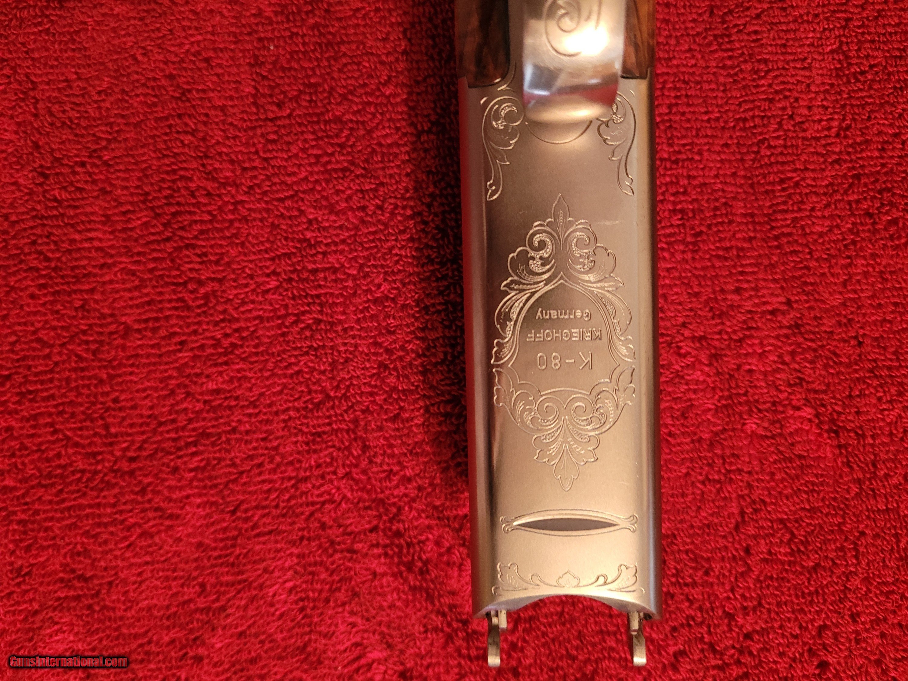 Description: Exception k80 less than a 1000 rounds shot through it, safe Queen. Condition, like new, 30" barrels, 6 krieghoff choke tubes, wide rib, 18.6mm barrels. $8995.00 Compare to new. Sold pending funds. SOLD Shotgun Gauge: 12 Gauge Manufacturer: Kreigoff Model: K80 Barrel Length: 30 Bore: 12 gauge Condition: Near new Metal Condition: Excellent Wood Condition: Excellent Bore Condition: Excellent Action: O/U Stock: Adjustable Rib: Wide Chokes: 6 original k80 Engraving: Kreigoff scroll Case: K80 Item Location: Reno |
