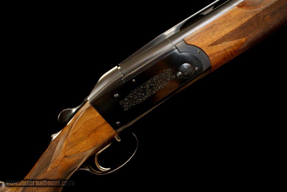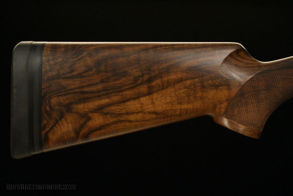 Description: Krieghoff 32/80 Target Set, custom build of a model 32 with internals and wood replaced with K80 parts by Krieghoff, 12 bore, 3" chambers, original 32" barrel with extended Briley screw-in chokes, additional Krieghoff 32" carrier barrel made for full length sub-gauge Briley tube sets which are also included in .410, 28, and 20 bores, tube sets have chokes sets, second tube set barrel made to replicate the original 12 bore barrel's weight with tube sets installed, 8 lbs. 14 oz., 14 5/16" LOP over a pad, 1 3/8" DAC, 2" DAH, 1/8" cast off, vent rib, single selective trigger, lockable safety, pistol grip. Basically, Krieghoff made this a a K80 gun but with the preferred lighter 32 receiver. Excellent condition with a little blue loss on bottom of receiver. Includes original Krieghoff case and a Briley case that holds gun, both barrels and tube sets. A very attractive gun that cost about $15k to put together. SOLD |