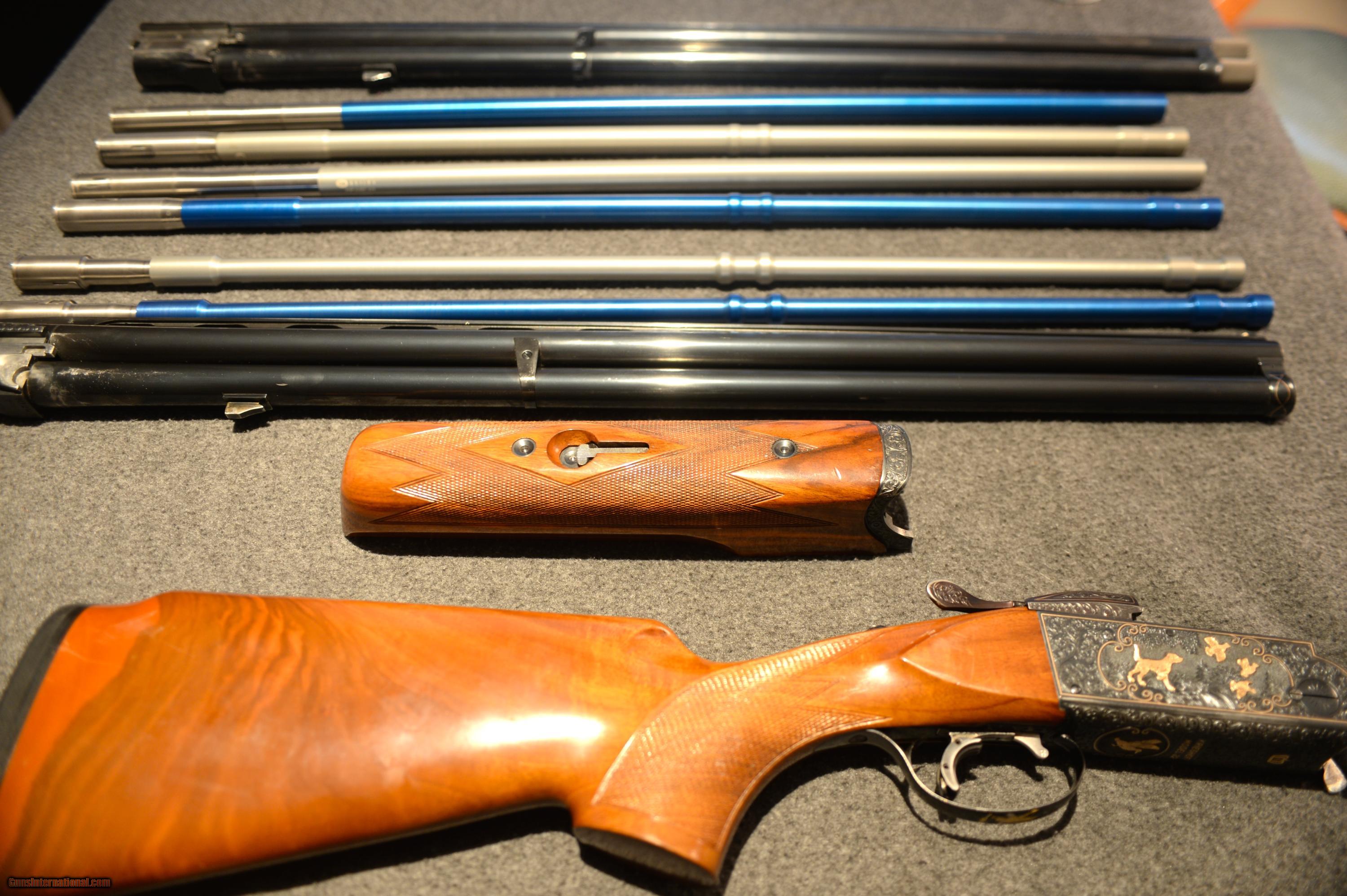 Description: Gun left the Factory as a Grade 1 Four Barrel Skeet Set. It now has been engraved with a crown grade style. This was confirmed with Krieghoff Germany via serial number. Has had trap/sporting clays 30" barrel made with Briley multi gauge insets. Specialty features: Briley choke and barrel inserts for 30" barrel Appraisal per Krieghoff/Germany, SOLD Manufacturer: Krieghoff Model: 32 four barrel skeet set grade 1 Serial Number: 10293 Condition: excellent Action: top break boxlock Gauge Info: .410, 28, 20 & 12 Finish: blued with gold inlay |