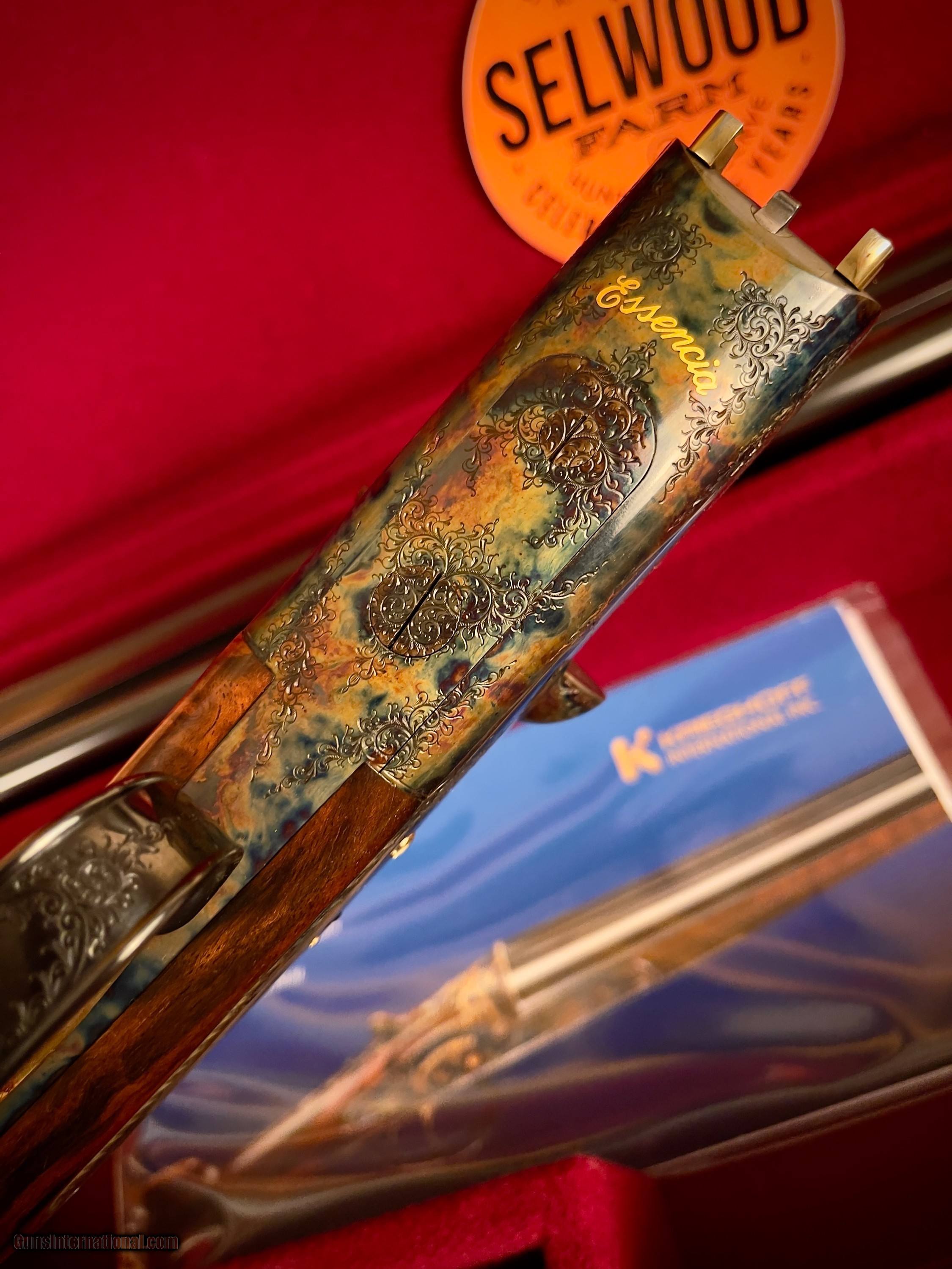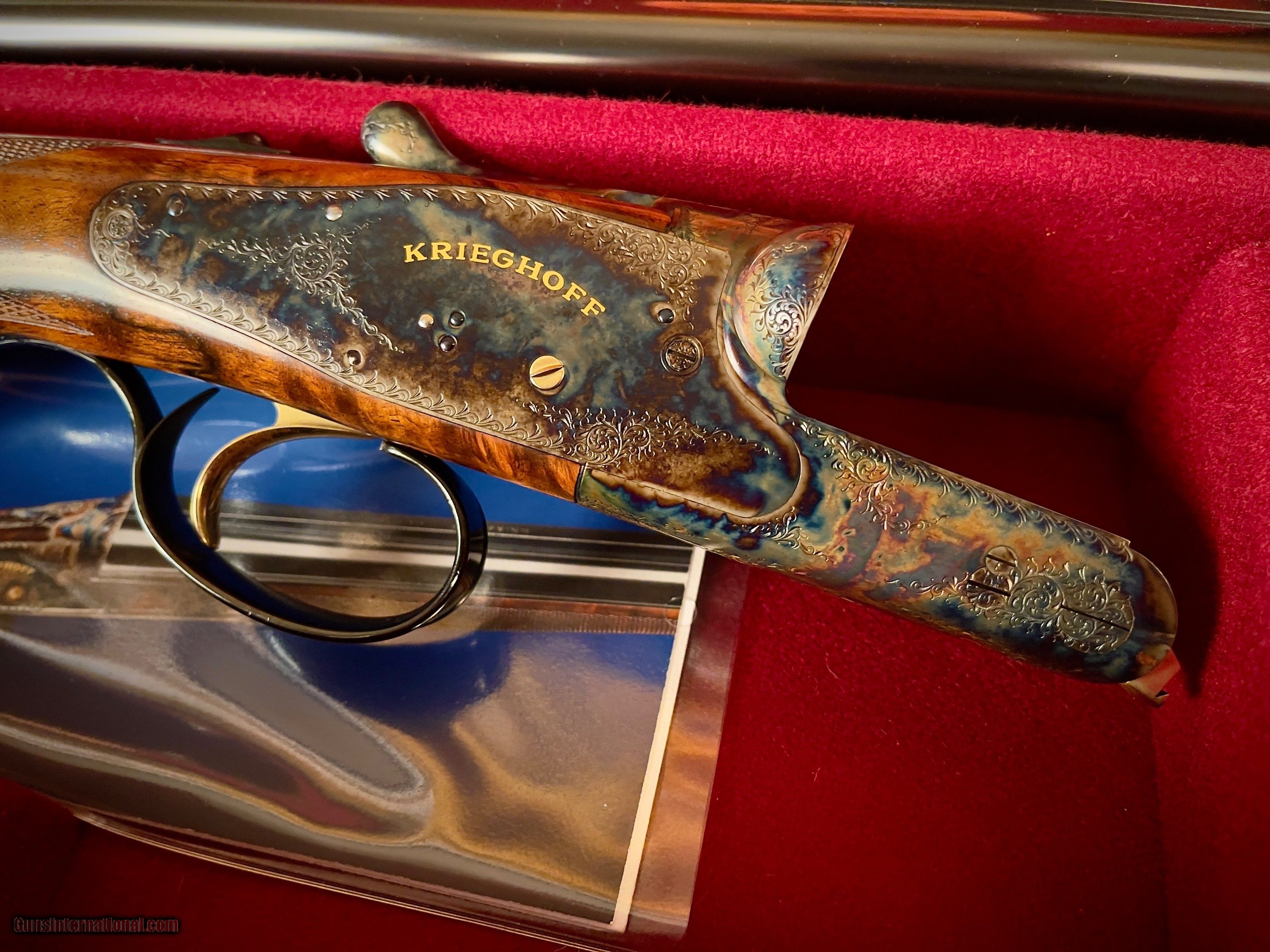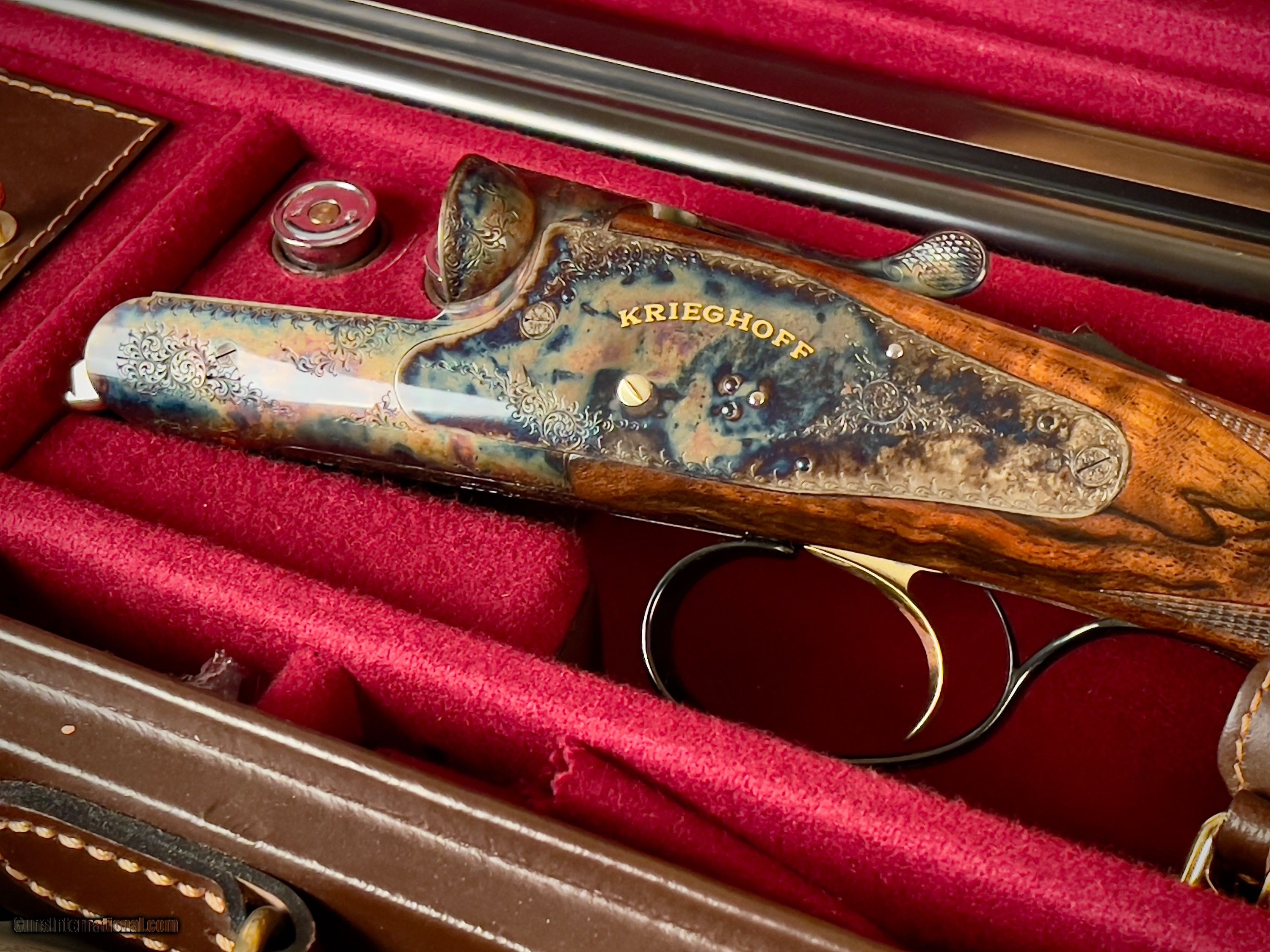 Description: Krieghoff, in partnership with German master gunsmith Jens Ziegenhahn, proudly offers a hand-built shotgun of the highest quality, worthy of the name Krieghoff. Available in 20g, the gun is missing the ornate ‘Continental’ look one might expect from a fourth-generation German gunmaker; instead, its elegant lines more closely resemble traditional British ‘best’ sidelock guns. One hundred percent German-made, the gun was developed to explore opportunities in the upper price segment for a Krieghoff game gun—a significant step for a company that has been a world leader in competition shotguns. The Essencia series’ sidelock shotguns are a highlight for traditionalists, internationally successful. With their pure elegance, first-class craftsmanship and proven technology, these masterpieces of the art of gunmaking fall into the same category as the highly coveted “best” English or Italian guns. The genuine back action sidelocks and triggers are gold plated, while the color-case hardened receiver is engraved with English scrolls. The elegant round body action and the Holland & Holland style ejectors ensure responsiveness and easy handling. Feel free to reach out to discuss further on a price out the door with shipping to a FFL of your choice. Also ask about our new inventory arriving daily. We have high end Krieghoff inventory as well has Rizzini. SOLD Shotgun Gauge: 20 Gauge Manufacturer: Krieghoff Model: Essencia Barrel Length: 30” Bore: Excellent Chambers: 2 3/4 Ejectors: Yes Condition: Excellent Metal Condition: Excellent Wood Condition: Above average / very good Bore Condition: Excellent Barrel Type: SXS Action: Side lock Triggers: Single Stock: POW Stock Drop: 1 1/2 Stock Heel: 2 1/4 Fore End: Beaver Butt Pad: Checkered LOP: 14.75 Finish: Color case harden Chokes: Fixed Choke Left: Mod Choke Right: IC Case: Tweed hard case |