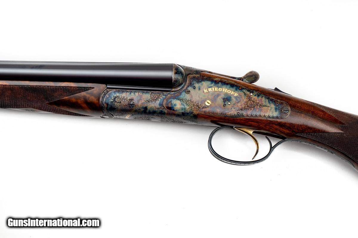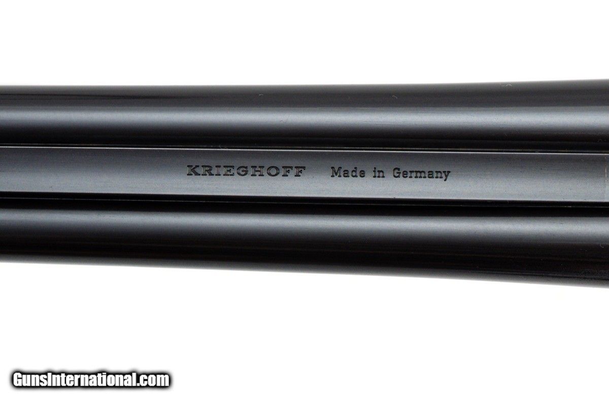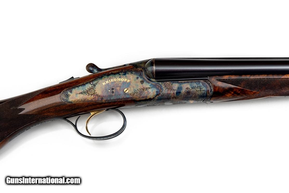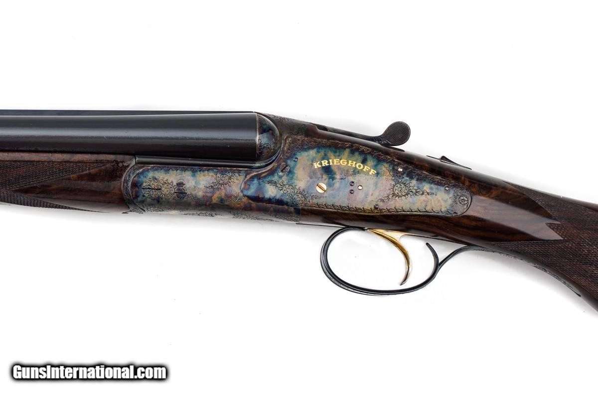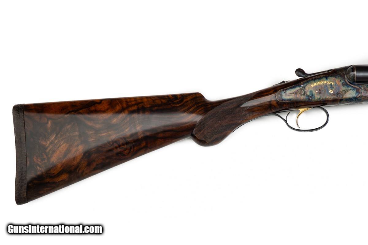 Description: MATCHED PAIR, 2 BARREL SET - 20 GAUGE: 30" BARRELS, 3", GUN #1: FULL AND FULL, GUN #2: IMPROVED MODIFIED AND FULL: 28 GUAGE: 30" BARRELS, 2-3/4", MODIFIED AND IMPROVED MODIFIED (BOTH), SINGLE INERTIA TRIGGERS, EJECTORS, CONCEALED THIRD FASTENER, DISC SET STRIKERS, GOLD-PLATED COCKING INDICATORS, NON-AUTOMATIC SAFETY, PRINCE OF WALES GRIP, SPLINTER FOREND, LEATHER PAD, GUN #1: 6 LBS 9 OZ AND GUN #2: 6 LBS 12 OZ 1-3/8" DAC, 2-1/8" DAH, 15-1/8" LOP A matched pair round body game guns with two-barrel sets in 20 and 28-gauge. The 20-gauge barrels are 30" with 3" chambers, tapered smooth concave game ribs, brass bead front sights and choked Full & Full in Gun #1 and Improved Modified & Full in Gun #2. The 28-gauge barrels are 30" with 2-3/4" chambers, tapered smooth concave game ribs, brass bead front sights and both Gun #1 and Gun #2 are choked Modified & Improved Modified. Top of the ribs on both barrels are marked "KRIEGHOFF Made in Germany". The action bodies and lockplates are adorned with English Arabesque scrolls and "KRIEGHOFF' engraved in gold on both sides of the action bodies. The bottoms of the action bodies are engraved 'Essencia' in gold script. The sidelock actions are fitted with a concealed third fastener, disc-set strikers, gold-plated cocking indicators, non-automatic checkered slide safeties and gold washed single non-selective inertia triggers that are protected by engraved double-sided rolled edge trigger guards. Gold-Inlaid "1" on top levers, rib near breeches and bottom of fore-end irons. Highly figured deluxe Turkish walnut stocks with Krieghoff's Prince-Of-Wales grip, Splinter fore-ends with Anson style push button releases, engraved center diamonds and escutcheons. 15-1/8" LOP to leather covered recoil pads. Gun #1 weighs 6 Lbs. 9 Oz. and Gun #2 weights 6 Lbs. 12 Oz. The shotguns are presented in the maker's leather trunk cases with canvas covers and accessories.