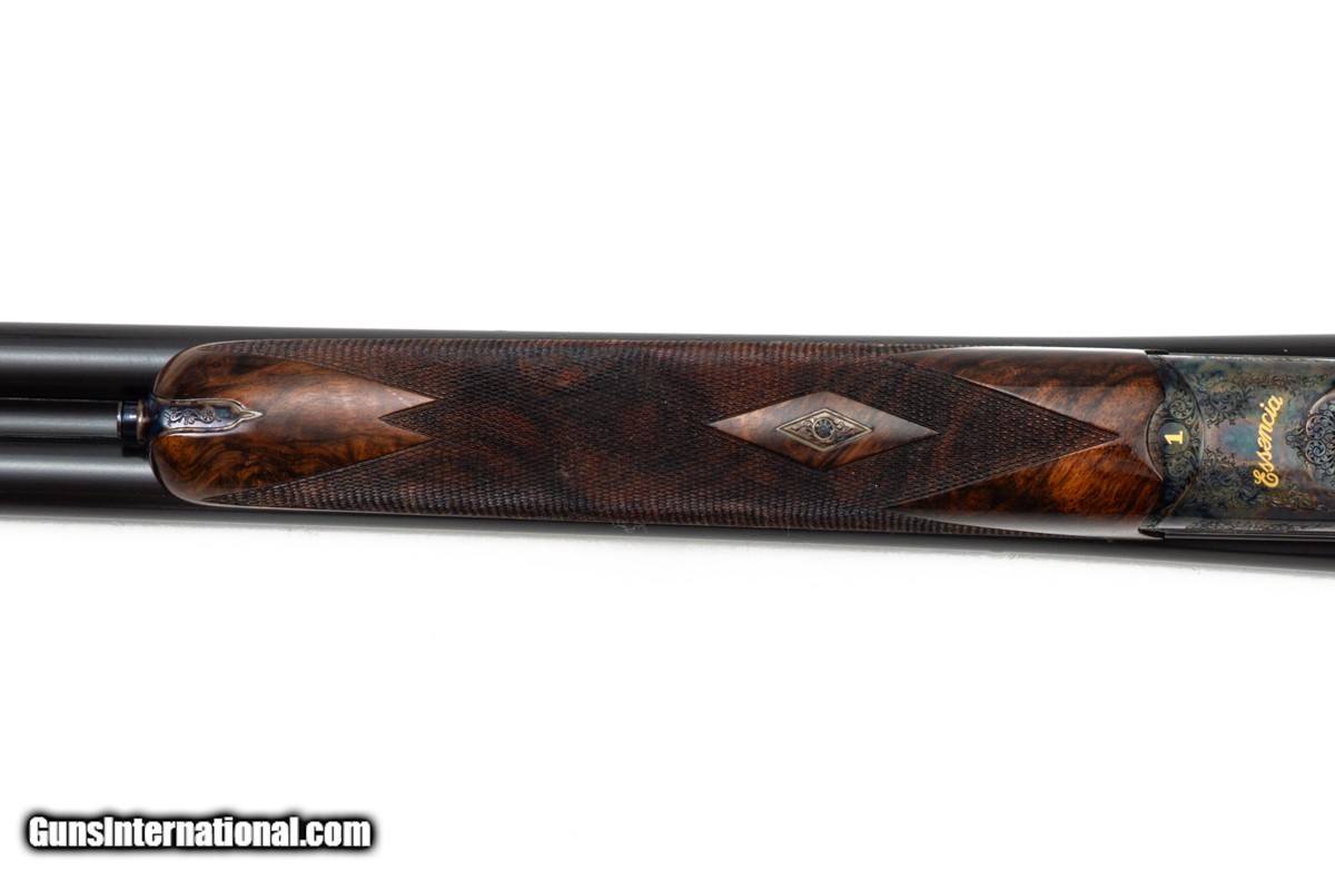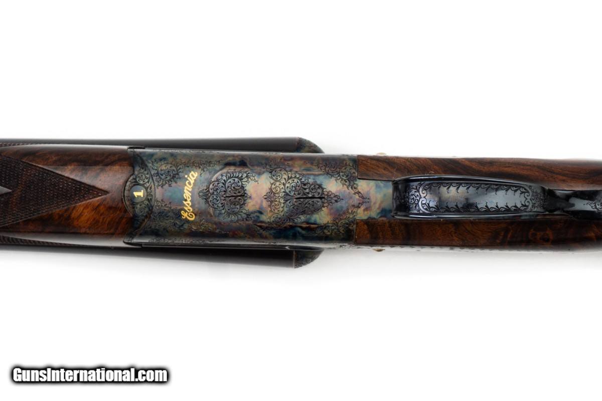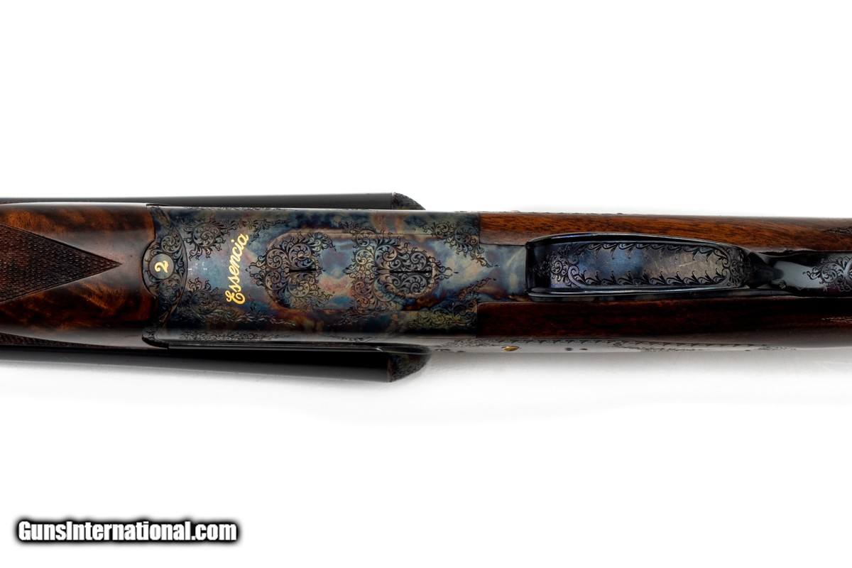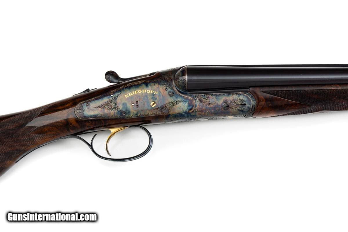 Description: MATCHED PAIR, 2 BARREL SET - 20 GAUGE: 30" BARRELS, 3", GUN #1: FULL AND FULL, GUN #2: IMPROVED MODIFIED AND FULL: 28 GUAGE: 30" BARRELS, 2-3/4", MODIFIED AND IMPROVED MODIFIED (BOTH), SINGLE INERTIA TRIGGERS, EJECTORS, CONCEALED THIRD FASTENER, DISC SET STRIKERS, GOLD-PLATED COCKING INDICATORS, NON-AUTOMATIC SAFETY, PRINCE OF WALES GRIP, SPLINTER FOREND, LEATHER PAD, GUN #1: 6 LBS 9 OZ AND GUN #2: 6 LBS 12 OZ 1-3/8" DAC, 2-1/8" DAH, 15-1/8" LOP A matched pair round body game guns with two-barrel sets in 20 and 28-gauge. The 20-gauge barrels are 30" with 3" chambers, tapered smooth concave game ribs, brass bead front sights and choked Full & Full in Gun #1 and Improved Modified & Full in Gun #2. The 28-gauge barrels are 30" with 2-3/4" chambers, tapered smooth concave game ribs, brass bead front sights and both Gun #1 and Gun #2 are choked Modified & Improved Modified. Top of the ribs on both barrels are marked "KRIEGHOFF Made in Germany". The action bodies and lockplates are adorned with English Arabesque scrolls and "KRIEGHOFF' engraved in gold on both sides of the action bodies. The bottoms of the action bodies are engraved 'Essencia' in gold script. The sidelock actions are fitted with a concealed third fastener, disc-set strikers, gold-plated cocking indicators, non-automatic checkered slide safeties and gold washed single non-selective inertia triggers that are protected by engraved double-sided rolled edge trigger guards. Gold-Inlaid "1" on top levers, rib near breeches and bottom of fore-end irons. Highly figured deluxe Turkish walnut stocks with Krieghoff's Prince-Of-Wales grip, Splinter fore-ends with Anson style push button releases, engraved center diamonds and escutcheons. 15-1/8" LOP to leather covered recoil pads. Gun #1 weighs 6 Lbs. 9 Oz. and Gun #2 weights 6 Lbs. 12 Oz. The shotguns are presented in the maker's leather trunk cases with canvas covers and accessories.