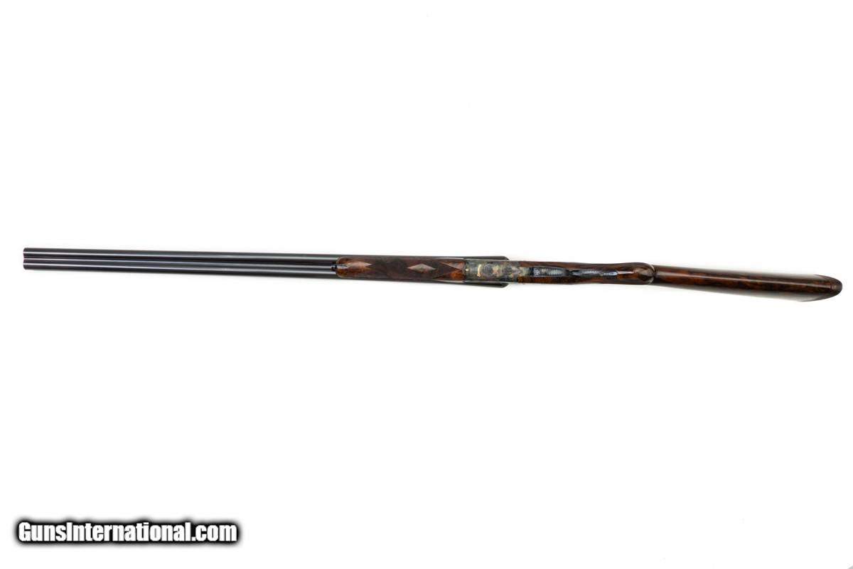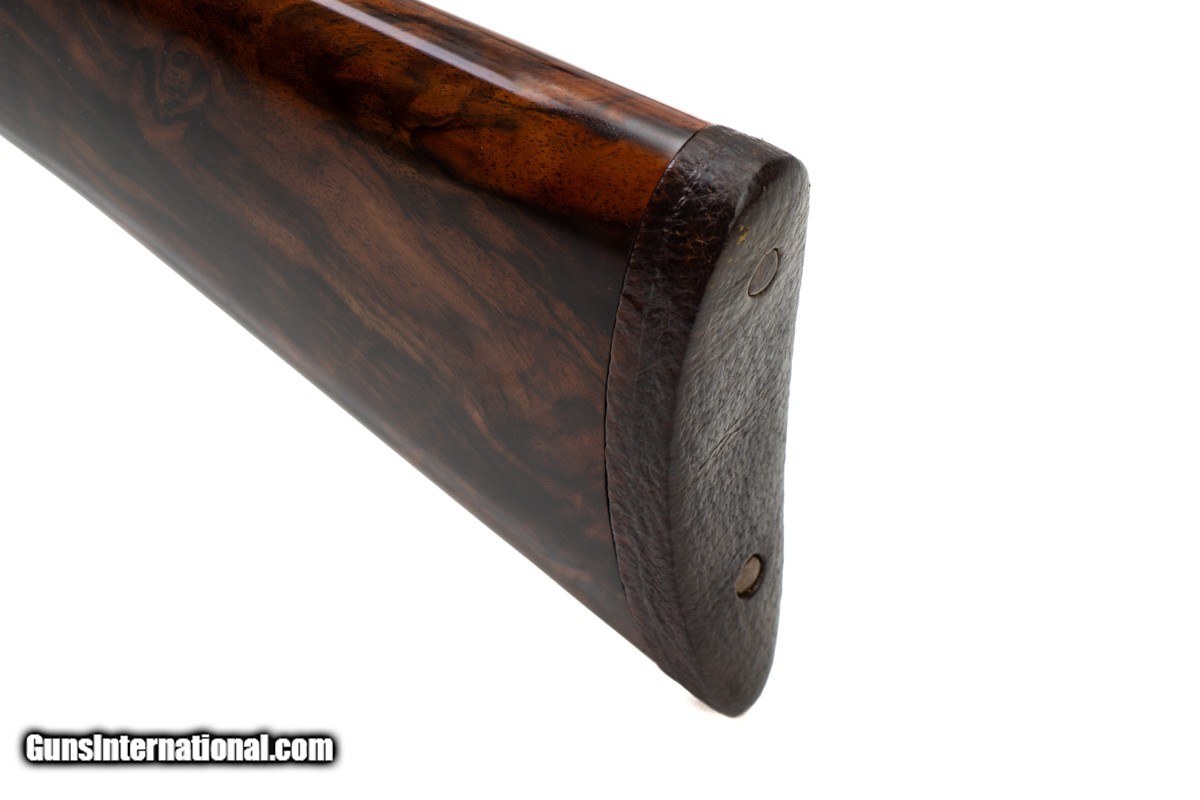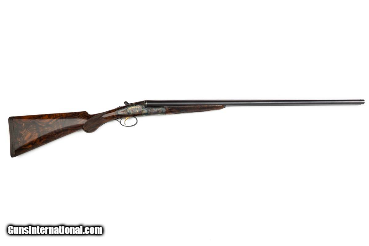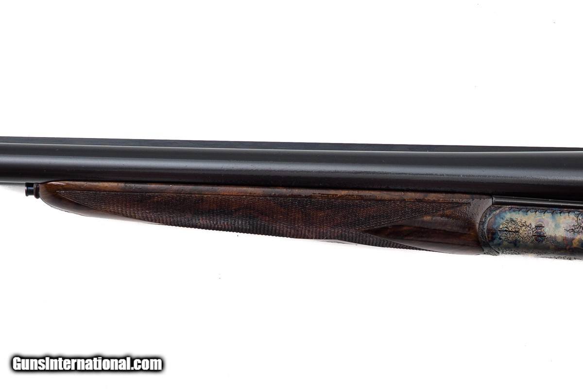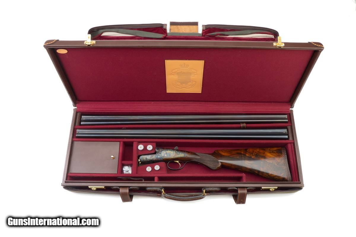 Description: MATCHED PAIR, 2 BARREL SET - 20 GAUGE: 30" BARRELS, 3", GUN #1: FULL AND FULL, GUN #2: IMPROVED MODIFIED AND FULL: 28 GUAGE: 30" BARRELS, 2-3/4", MODIFIED AND IMPROVED MODIFIED (BOTH), SINGLE INERTIA TRIGGERS, EJECTORS, CONCEALED THIRD FASTENER, DISC SET STRIKERS, GOLD-PLATED COCKING INDICATORS, NON-AUTOMATIC SAFETY, PRINCE OF WALES GRIP, SPLINTER FOREND, LEATHER PAD, GUN #1: 6 LBS 9 OZ AND GUN #2: 6 LBS 12 OZ 1-3/8" DAC, 2-1/8" DAH, 15-1/8" LOP A matched pair round body game guns with two-barrel sets in 20 and 28-gauge. The 20-gauge barrels are 30" with 3" chambers, tapered smooth concave game ribs, brass bead front sights and choked Full & Full in Gun #1 and Improved Modified & Full in Gun #2. The 28-gauge barrels are 30" with 2-3/4" chambers, tapered smooth concave game ribs, brass bead front sights and both Gun #1 and Gun #2 are choked Modified & Improved Modified. Top of the ribs on both barrels are marked "KRIEGHOFF Made in Germany". The action bodies and lockplates are adorned with English Arabesque scrolls and "KRIEGHOFF' engraved in gold on both sides of the action bodies. The bottoms of the action bodies are engraved 'Essencia' in gold script. The sidelock actions are fitted with a concealed third fastener, disc-set strikers, gold-plated cocking indicators, non-automatic checkered slide safeties and gold washed single non-selective inertia triggers that are protected by engraved double-sided rolled edge trigger guards. Gold-Inlaid "1" on top levers, rib near breeches and bottom of fore-end irons. Highly figured deluxe Turkish walnut stocks with Krieghoff's Prince-Of-Wales grip, Splinter fore-ends with Anson style push button releases, engraved center diamonds and escutcheons. 15-1/8" LOP to leather covered recoil pads. Gun #1 weighs 6 Lbs. 9 Oz. and Gun #2 weights 6 Lbs. 12 Oz. The shotguns are presented in the maker's leather trunk cases with canvas covers and accessories.
