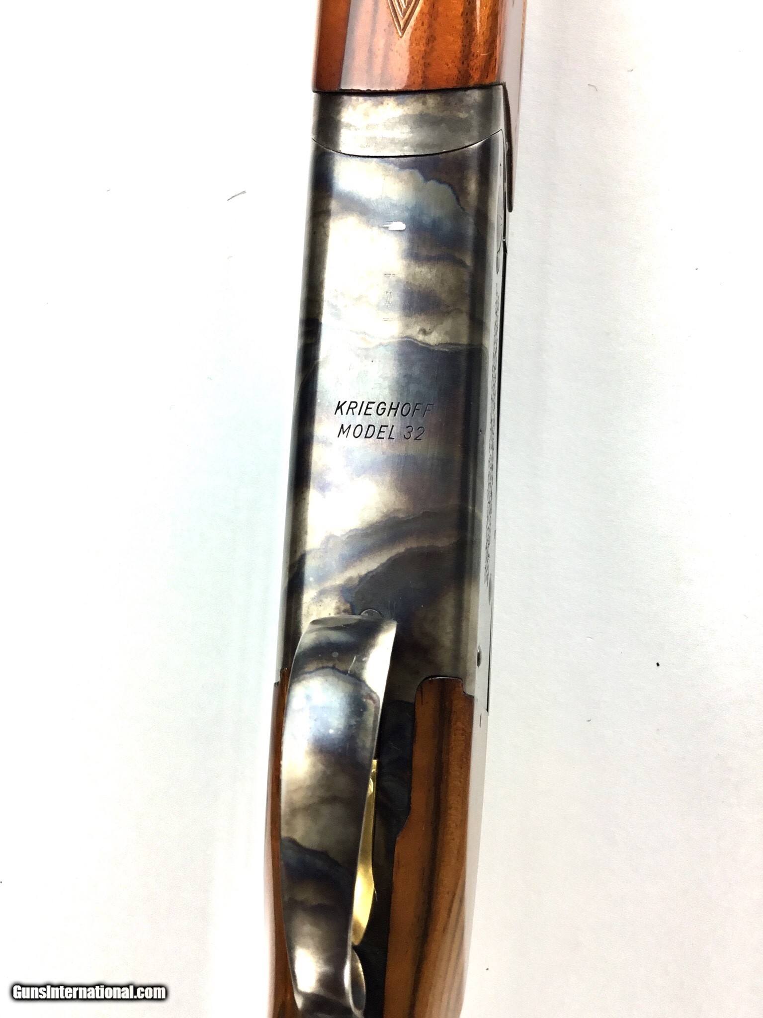 Description: KRIEGHOFF K32 SPORTING 20 GAUGE, Nicely Figured Pistol Grip Stock with Flat Knob Over Soft Recoil Pad, Adjustable Comb, Case Hardened Receiver with Light Scroll Engraving, 32” Bbls, Ventilated Rib, White front and Silver Mid-Bead, 3” Chambers, IC and Mod Screw-In Chokes, LOP: 14 1/4” with Adjustable Release Trigger, Light Handling Marks on Stock, Small Scratch on Bottom of Receiver, Bores Bright and Shiny, Opening Lever is to right of Center, Manufactured in Germany, SN-6169, #3171, $6950.00, HAMPELSGUNCO SINCE 1919. SOLD |