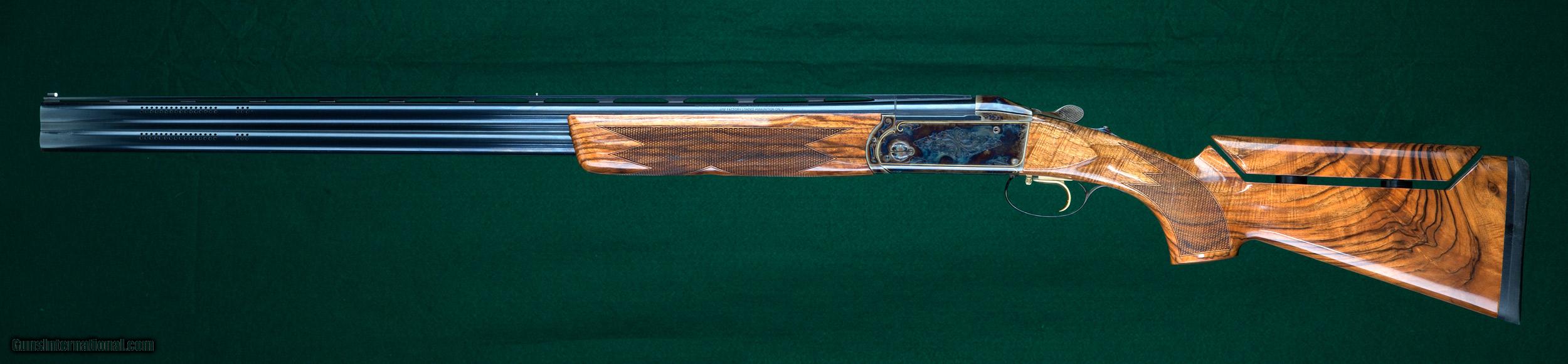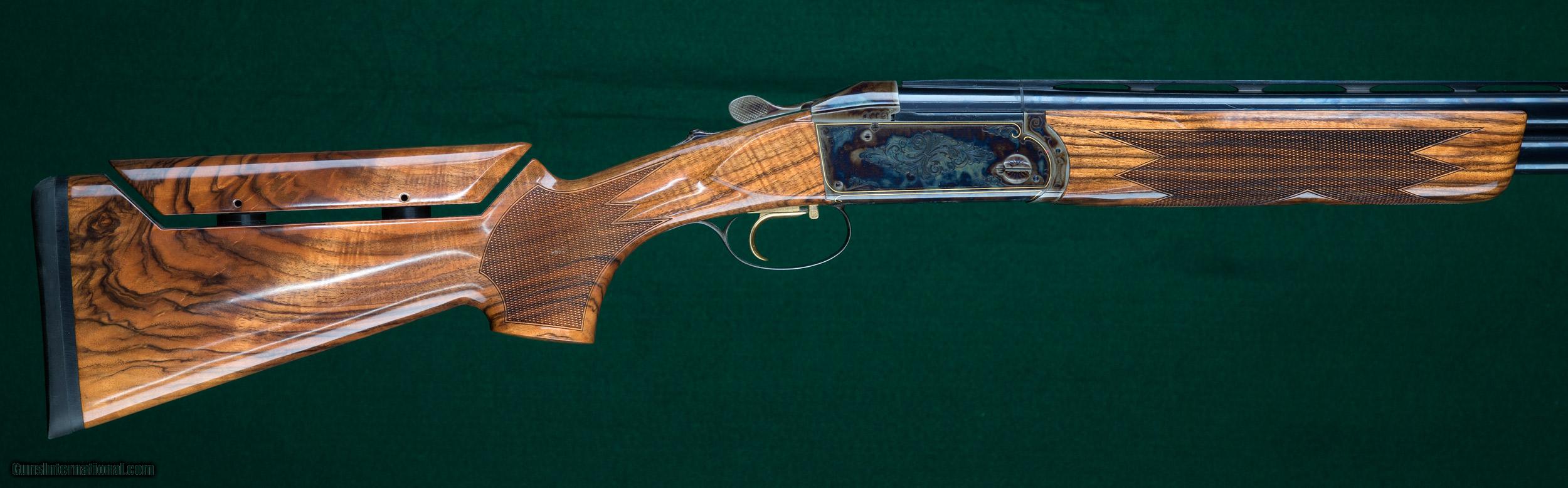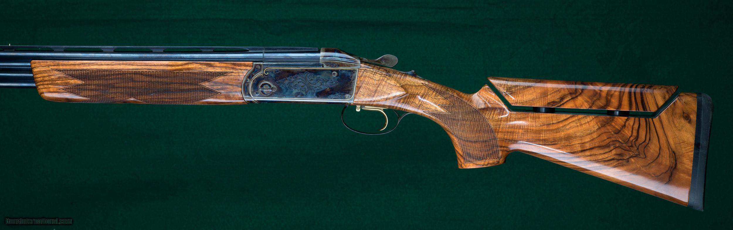 Description: 30" O/U, ported, matted-vent-rib barrels with solid side ribs (starting at the front of the forend), white front bread, steel middle bead, and a total of 18 Briley interchangeable choke tubes. Highly figured Turkish walnut stock with slender Deeley-release field forend, palmswelled pistol grip, classic point-pattern checkering, adjustable comb and thin back Kick-Eez recoil pad. Gold bordered, scroll engraved, casehardened receiver with maker's name in gold shield on the underside; gold-plated, adjustable-position single-selective trigger, automatic ejectors, and detented, manual top-tang safety. Pull: 14 5/8". Weight: 8lbs, 2oz. Built 2013. Little used, tight, and retaining 99%++ blue and case colors. In maker's leather-trimmed hard case. SOLD |
