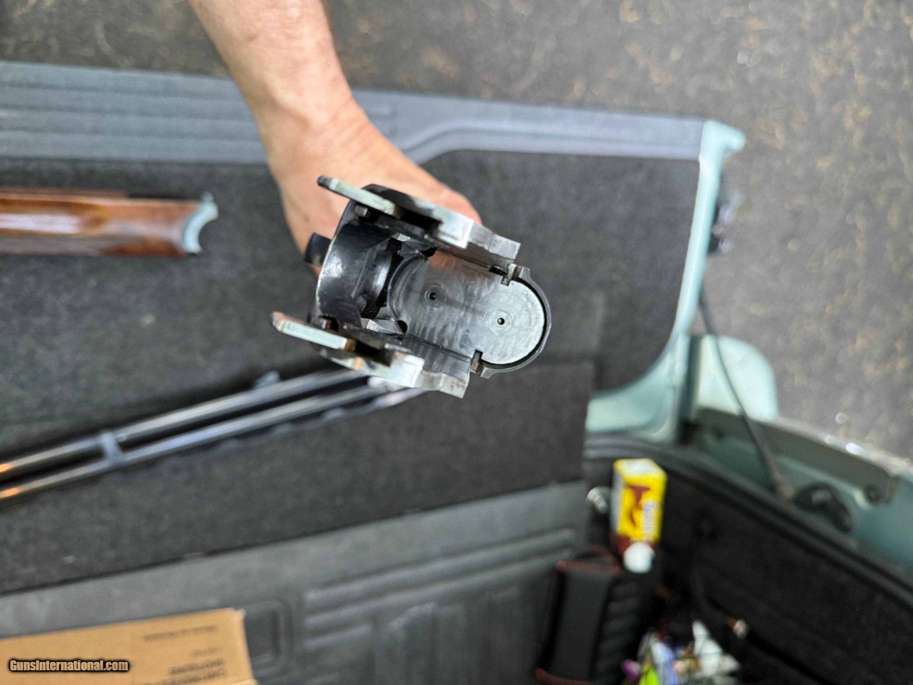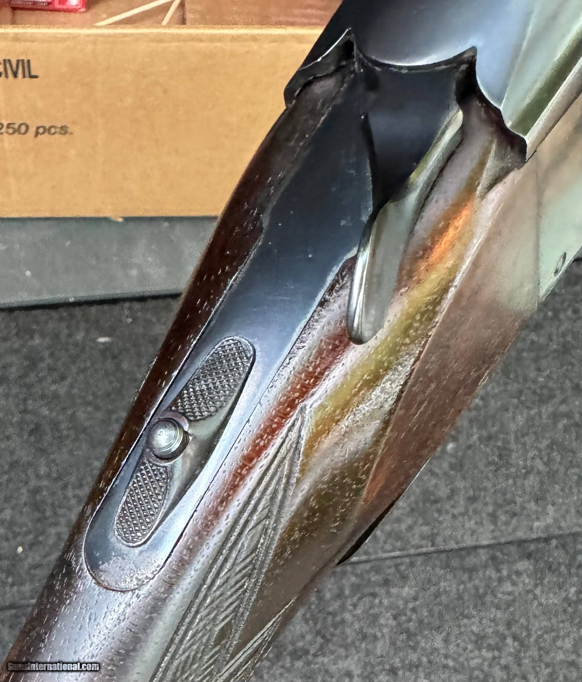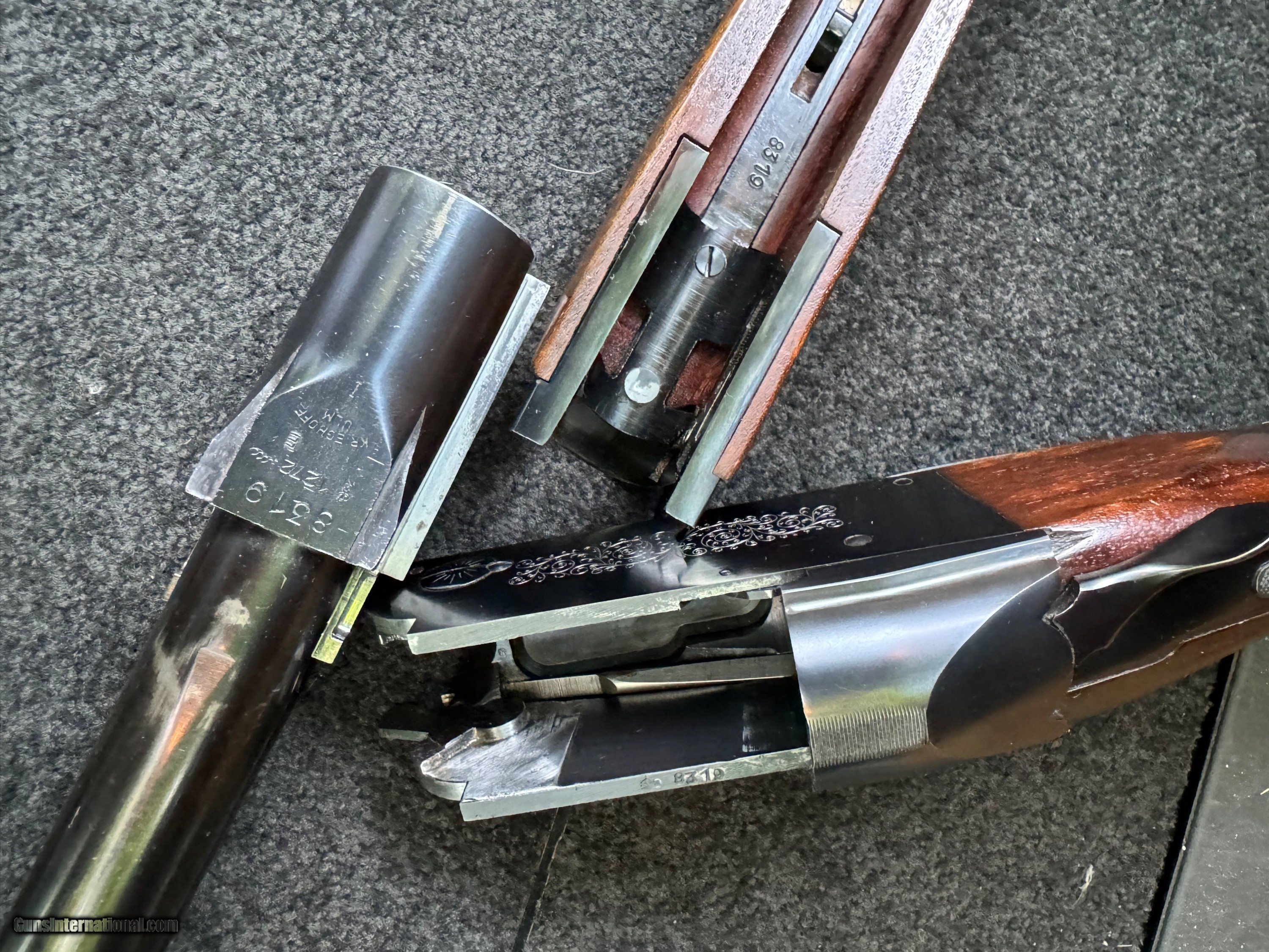 Description: ---SOLD--- Super nice early 70s K32 with 30” Vandalia rib barrels, Buhler-Laufstahl steel stamped. All metal #s match, forearm says “SILE”, 8306 is stamped in heel area of butt stock. Unmodified, .733 bores, IM/F chokes, bright and shiny bores, fantastic deep blue with exception of small pitting on end of tang. Locks up tight, plenty of life left in top latch. KI Ottsville said the receiver is a later manufacture and the trigger configuration reflects the evolution of K32 trigger as Krieghoff was getting closer to K80 updates. KI has no service records on this gun. No significant marks other than handling and shooting evidence over the years - obviously well kept. LOP is 13-7/8+, recoil pad looks original - and is marked “Krieghoff” on the shouldering end. Great candidate for restock and shoot. Terrific specimen. Buyer pays shipping to their FFL dealer. SOLD Curio/Relic: Yes Manufacturer: Krieghoff Model: 32 Serial Number: 8319 Condition: Great Metal Condition: Very good+ LOP: 13-7/8 Finish: Excellent minus Manufacture Date: 1972-73 Chokes: IM/F |