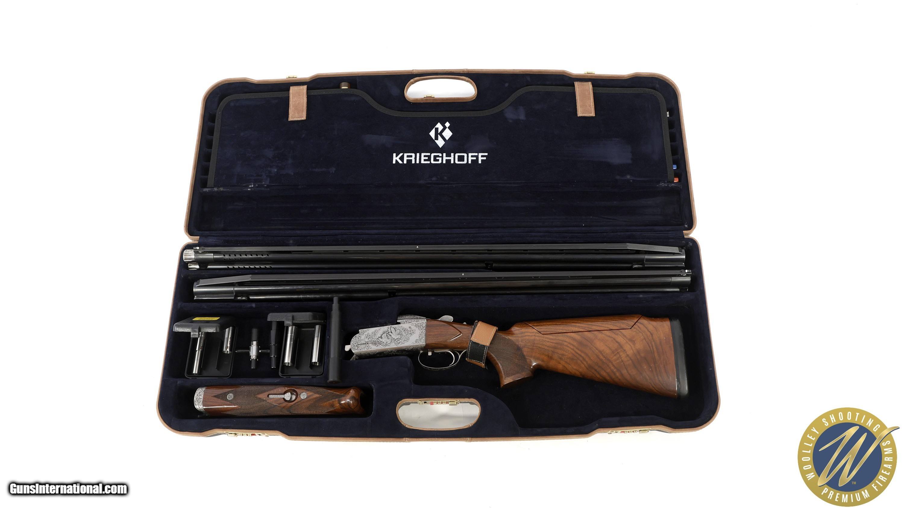 Description: Krieghoff K80 Bavaria Royale Pro Sporter 12ga 32" w/Carrier & Briley Tubes Adj RH Preowned Condition Assessment: Preowned Krieghoff K80 Bavaria Royale Pro Sporter with full Briley Ultralight tube 32" set (20ga, 28ga, .410), factory pro sporter 12ga 32" aftermarket ported barrel, extra non-ported carrier barrel, and extra dark lacquer walnut stock. This is a well-used and maintained gun with extra handling marks, one significant chip on right hand of wood near receiver, and typical wear on barrels. Bores are in good condition with minor use and no pitting. Lock-up remains tight with proper top lever right of center. All mechanical functions operate correctly. Adjustable comb functions smoothly. Round count unknown. This is a complete competition/sporting package with versatility across all sub-gauges. Hand Engraved by Kathrin Nonne Condition: Used - Good (well-used with cosmetic wear) Model: K80 Hand Engraved Bavaria Royale Pro Sporter Gauge/Caliber: 12 Gauge (with 20ga, 28ga, .410 Briley tube set) (32") Barrel Length: 32" Configuration: Pro Sporter with Briley Ultralight tube set Stock/Frame: RH Monte Carlo stock with adjustable comb, Lacquer Finish Wood/Material: Turkish Walnut Finish: Traditional Blued barrels; Hand engraved receiver (Bavaria Royale grade) Special Feature: Full Briley Ultralight tube set (20/28/.410), adjustable comb, factory ported carrier barrel, extra non-ported carrier barrel, extra dark lacquer Monte Carlo stock COMES WITH 2 STOCKS INCLUDED Included: