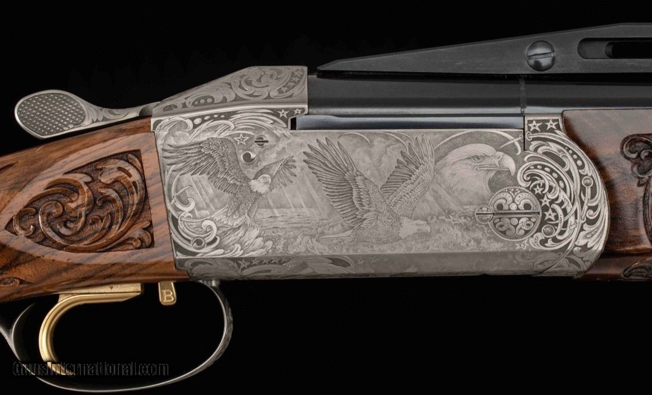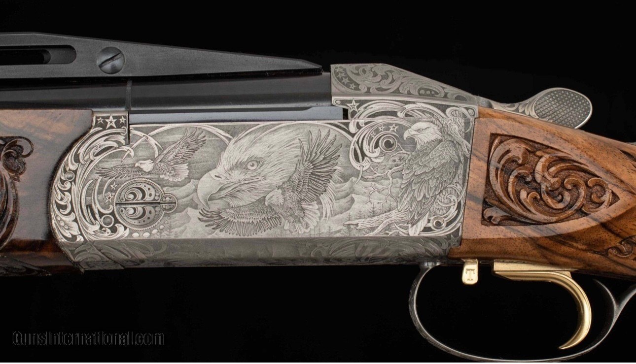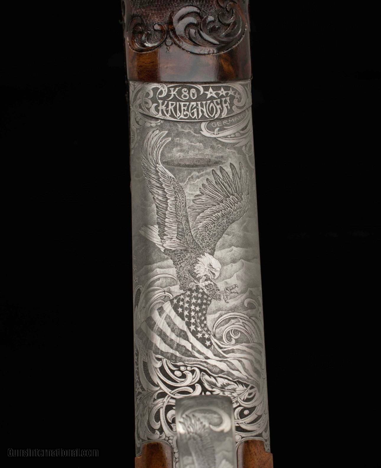 General Specs: Krieghoff K80 30" Pro Sporter Barrel Length: 30″ Chokes: Factory titanium Bores: mirror Bore Diameter: .732/.732 % Blue: 100% Chambers: 3″ Ribs: Adjustable, vent-tight Beads: front white, mid brass Action: Nitride finished Receiver Condition: 100% engraved one of a kind engraved Engraving: Eagle/American Flag theme – Dassa Brothers Trigger Type: Mechanical Trigger Guard: 100% engraved