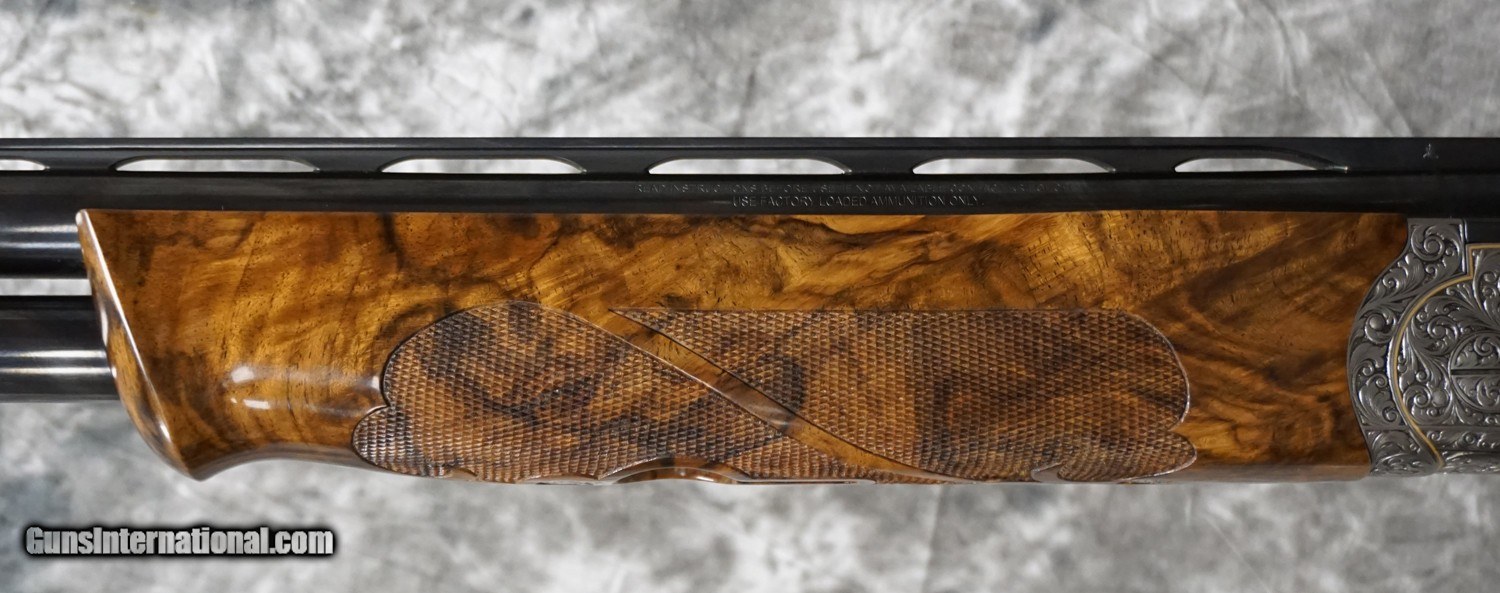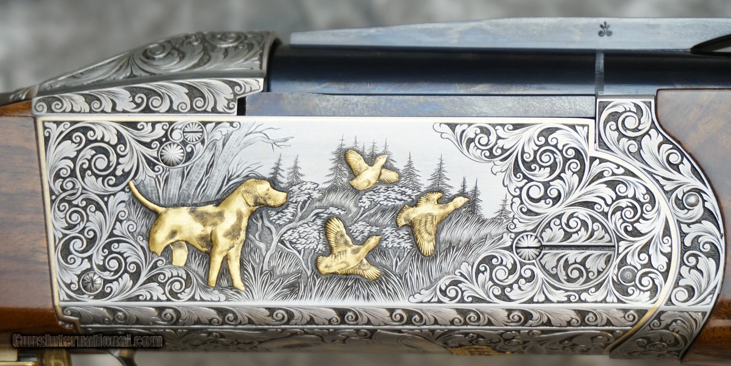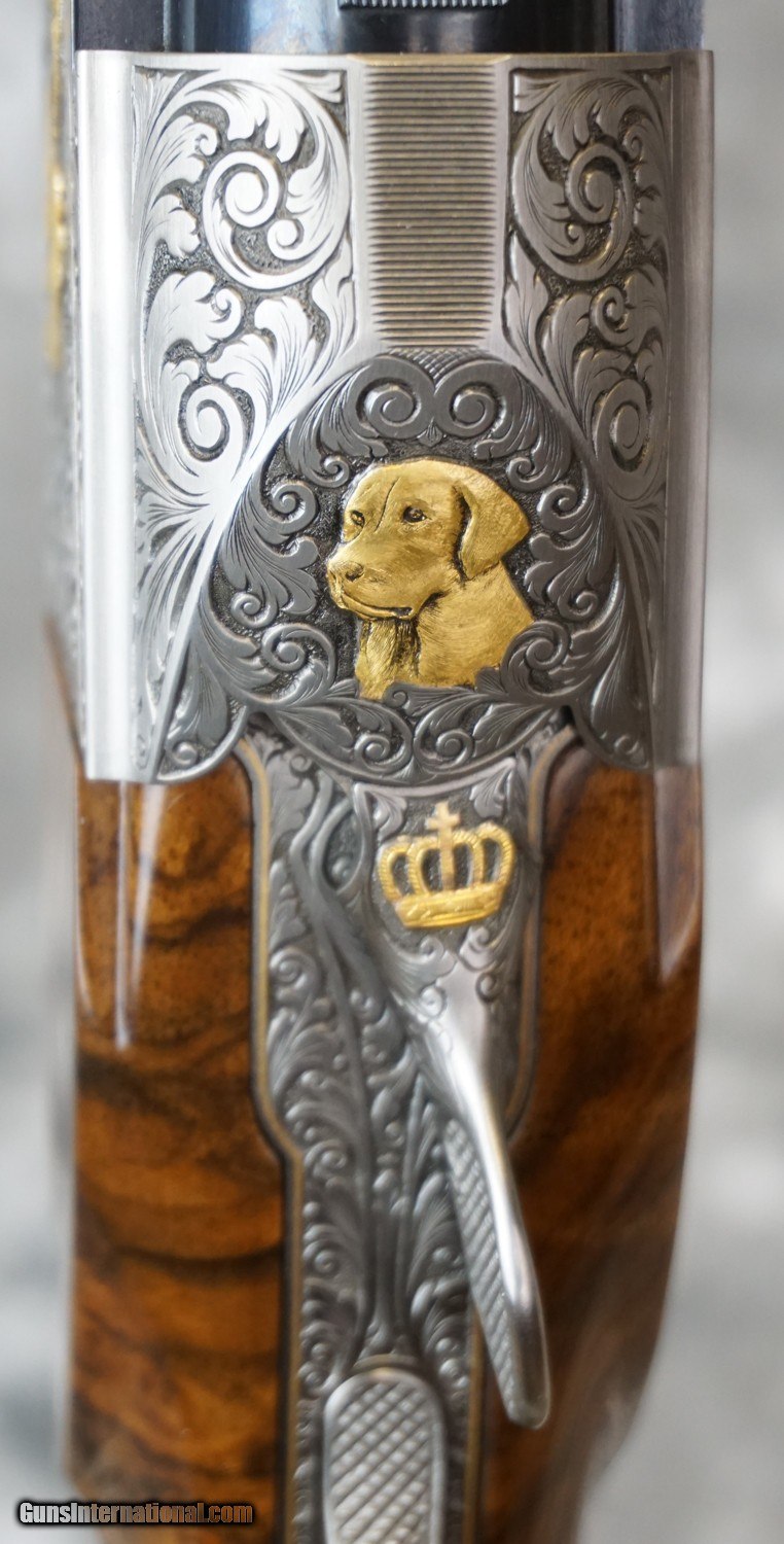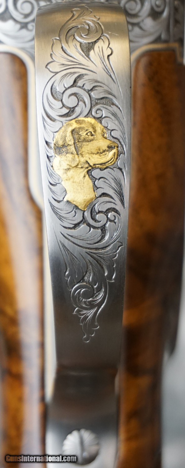 Description: As-New Pacific Sporting Arms commissioned, in-house factory one-of-a-kind Enhanced Crown by Master Engraver Stubler, with an 18 month wait time, this Nitride finished action features highly detailed scrolls, Gold borders with extra deep gold game scenes set against bulino engraved background. Factory upgrades include deeply engraved gold top-lever latch and trigger guard. Factory hand checkered 24 lines-per-inch Fleur-Di-Lis pattern, exhibition grade Turkish walnut No.3 stock with factory adj. comb and schnabel forearm. This completes the one-of-a-kind masterpiece. Includes factory case, chokes and tools. Consignment, ineligible for trade-ins. SOLD Shotgun Gauge: 12 Gauge |