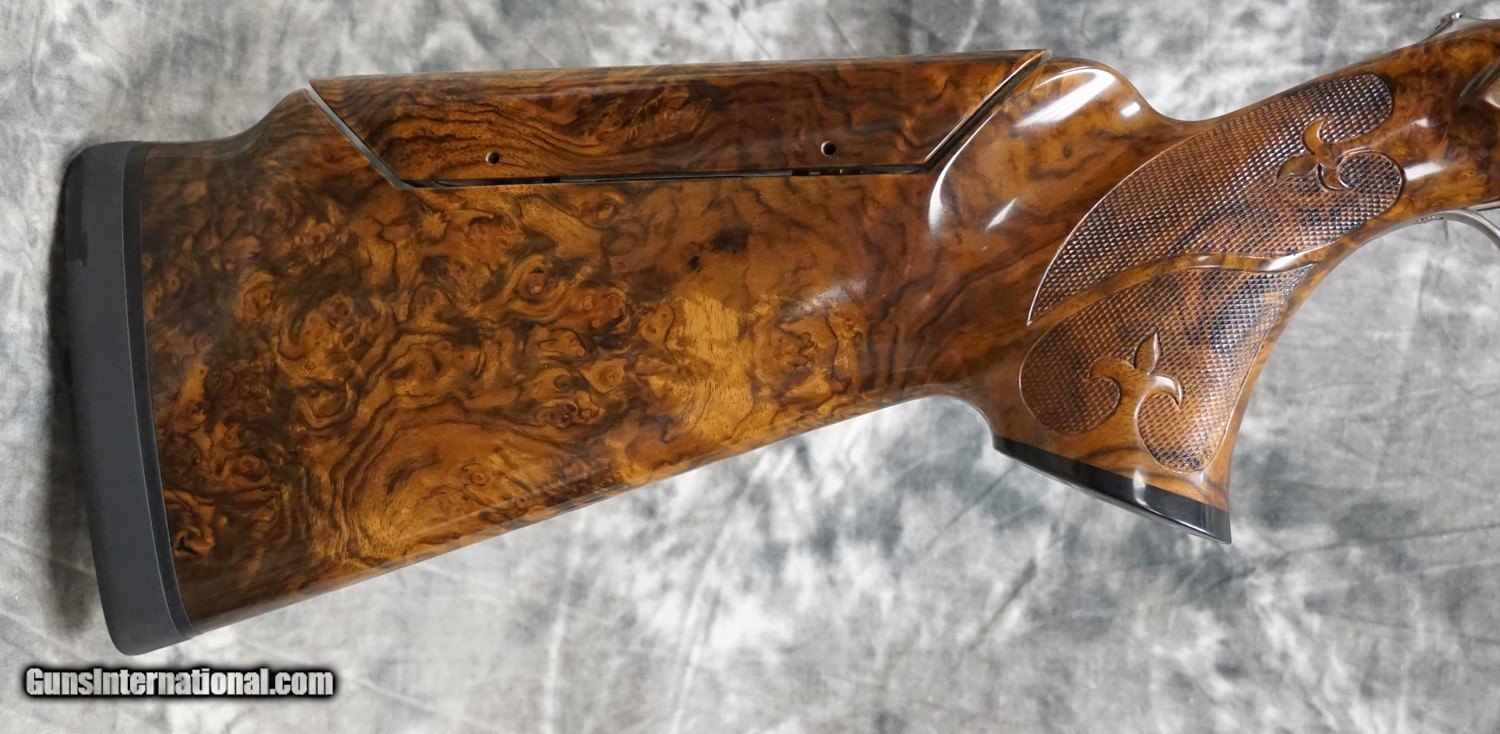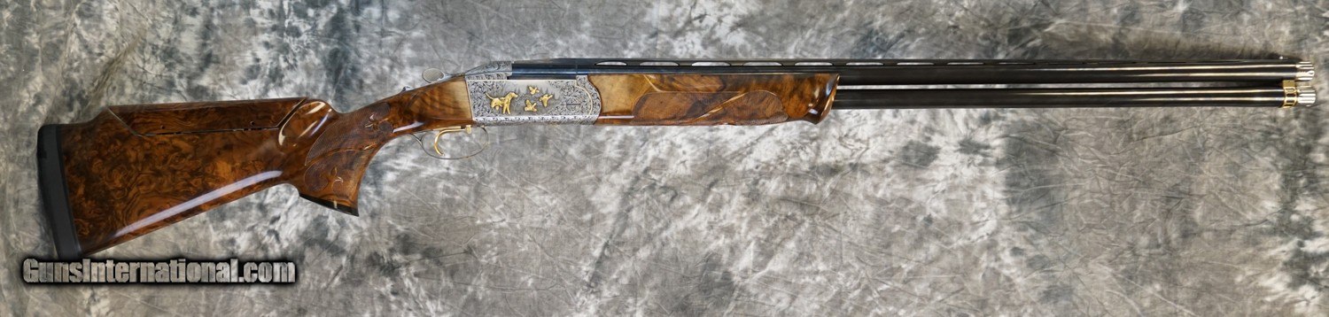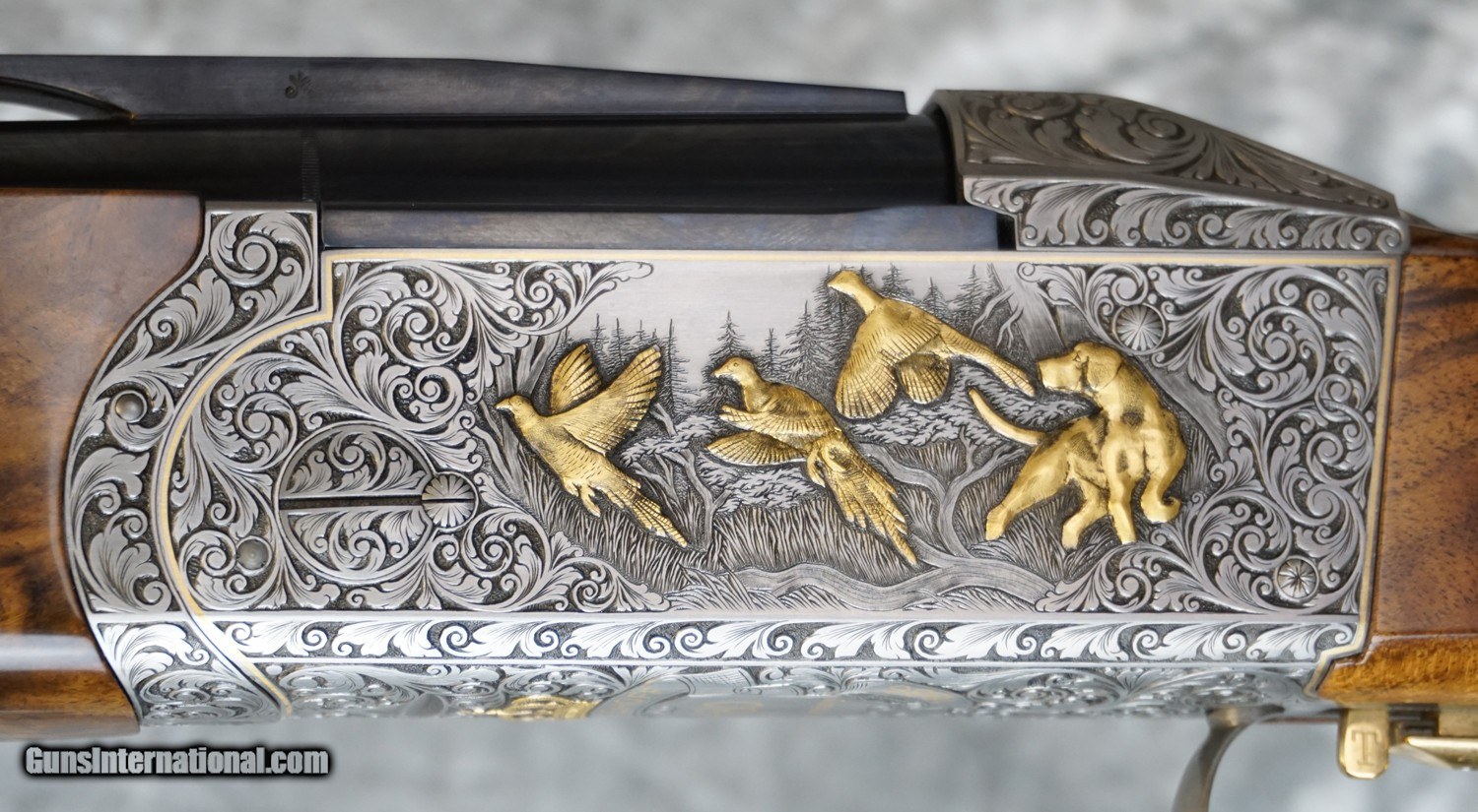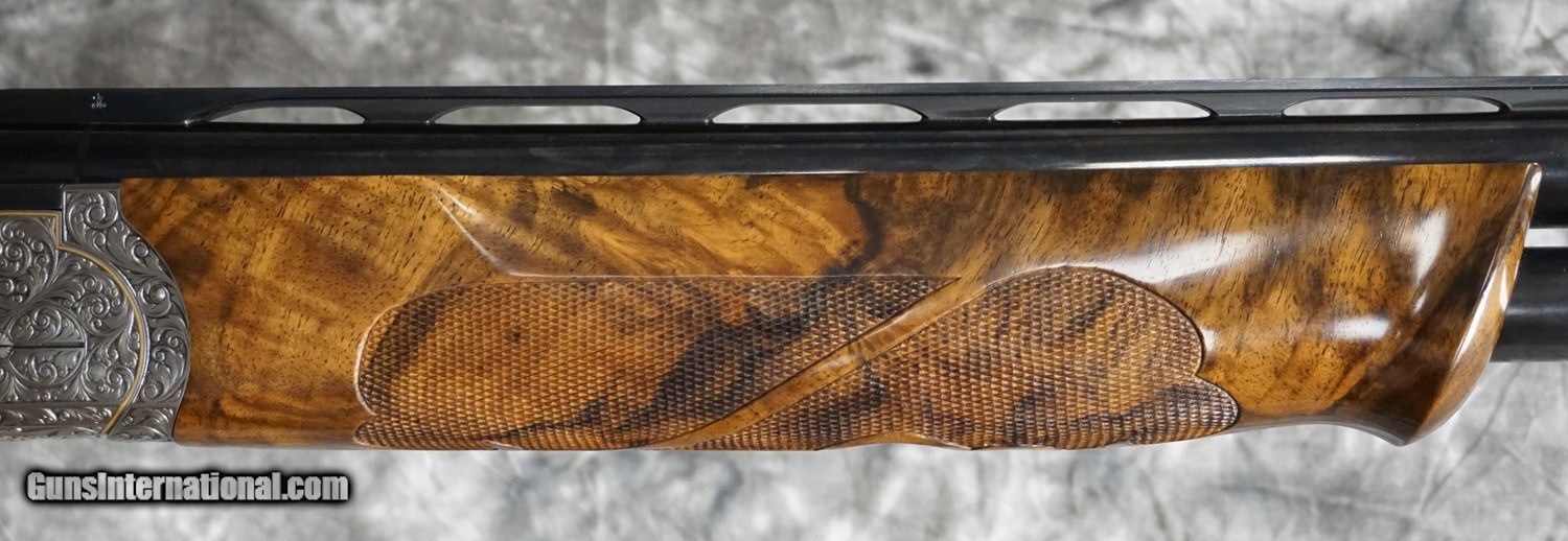 Description: As-New Pacific Sporting Arms commissioned, in-house factory one-of-a-kind Enhanced Crown by Master Engraver Stubler, with an 18 month wait time, this Nitride finished action features highly detailed scrolls, Gold borders with extra deep gold game scenes set against bulino engraved background. Factory upgrades include deeply engraved gold top-lever latch and trigger guard. Factory hand checkered 24 lines-per-inch Fleur-Di-Lis pattern, exhibition grade Turkish walnut No.3 stock with factory adj. comb and schnabel forearm. This completes the one-of-a-kind masterpiece. Includes factory case, chokes and tools. Consignment, ineligible for trade-ins. SOLD Shotgun Gauge: 12 Gauge |