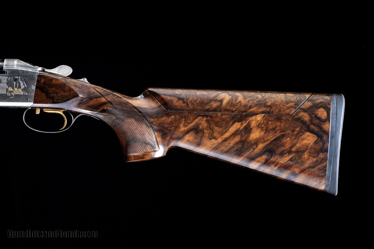 Description: K80 Parcours featuring extremely fine First Thaw motif, completely hand-engraved by Diego Bonsi, with tasteful inlaid gold highlights. Engraving coverage extends to the top surfaces of the forearm iron, all outside surfaces of trigger guard and top lever, the entire top tang, plus forearm rosettes and release lever. Wood is Exhibition Grade, the highest offered by the Krieghoff factory. Chokes are fixed at IM over Mod, the most versatile combination for most sporting clays target presentations. Top rib tapers from 8mm at the rear to 6mm at the front, featuring a brass mid bead and Bradley style front bead. Trigger blade and comb are both adjustable. Comes complete in factory case with all accessories. SOLD Manufacturer: Krieghoff Caliber Info: 12 Gauge Barrels: 32 Action: Over / Under Triggers: Single Selective Gauge Info: 12 Gauge Stock Comb: 1 1/2 Stock Heel: 2 1/4 Stock Cast: 1/4" off LOP: 14 5/8 Rib: Vented Weight: 8.07 Chokes: Interchangable |