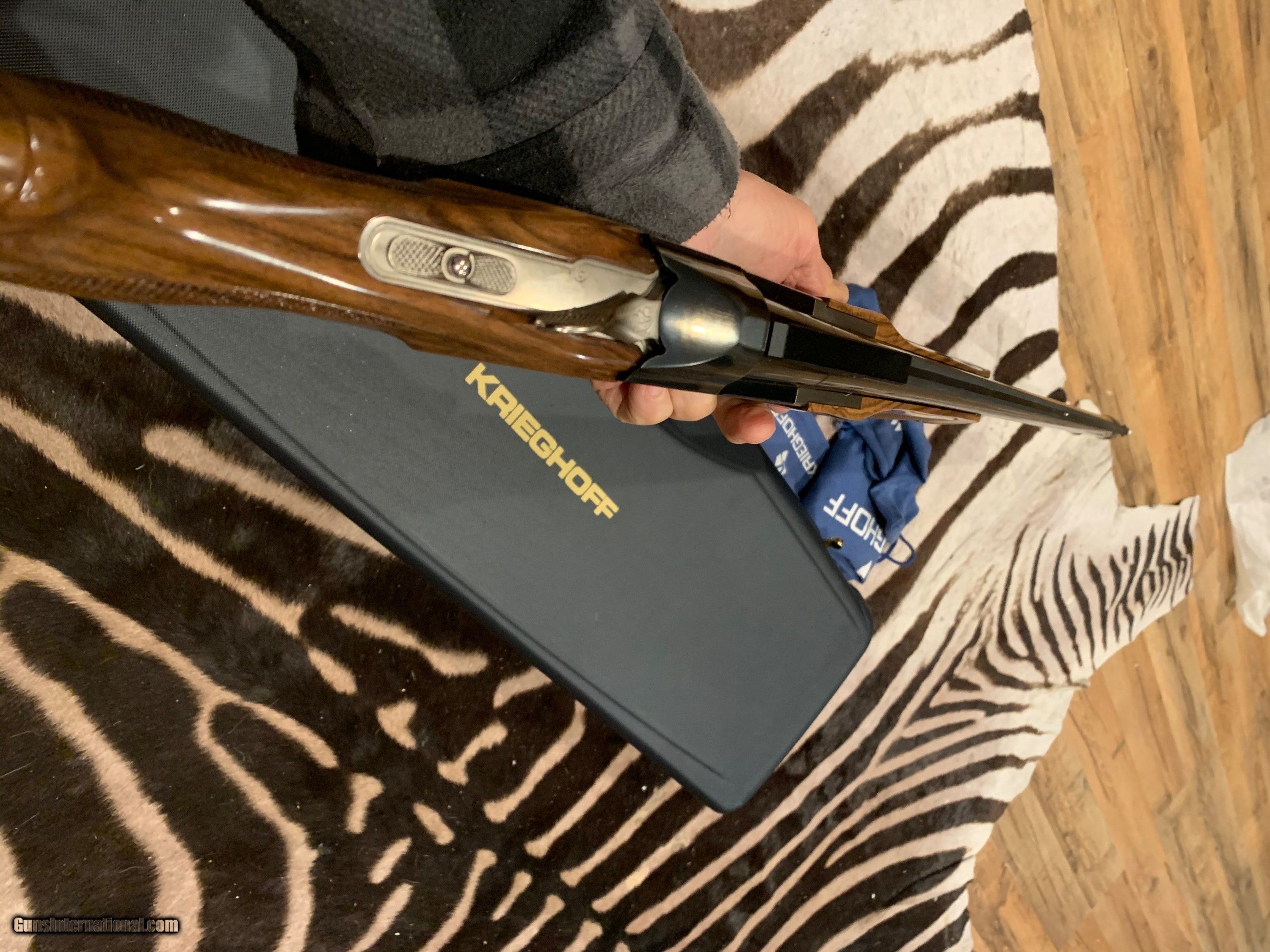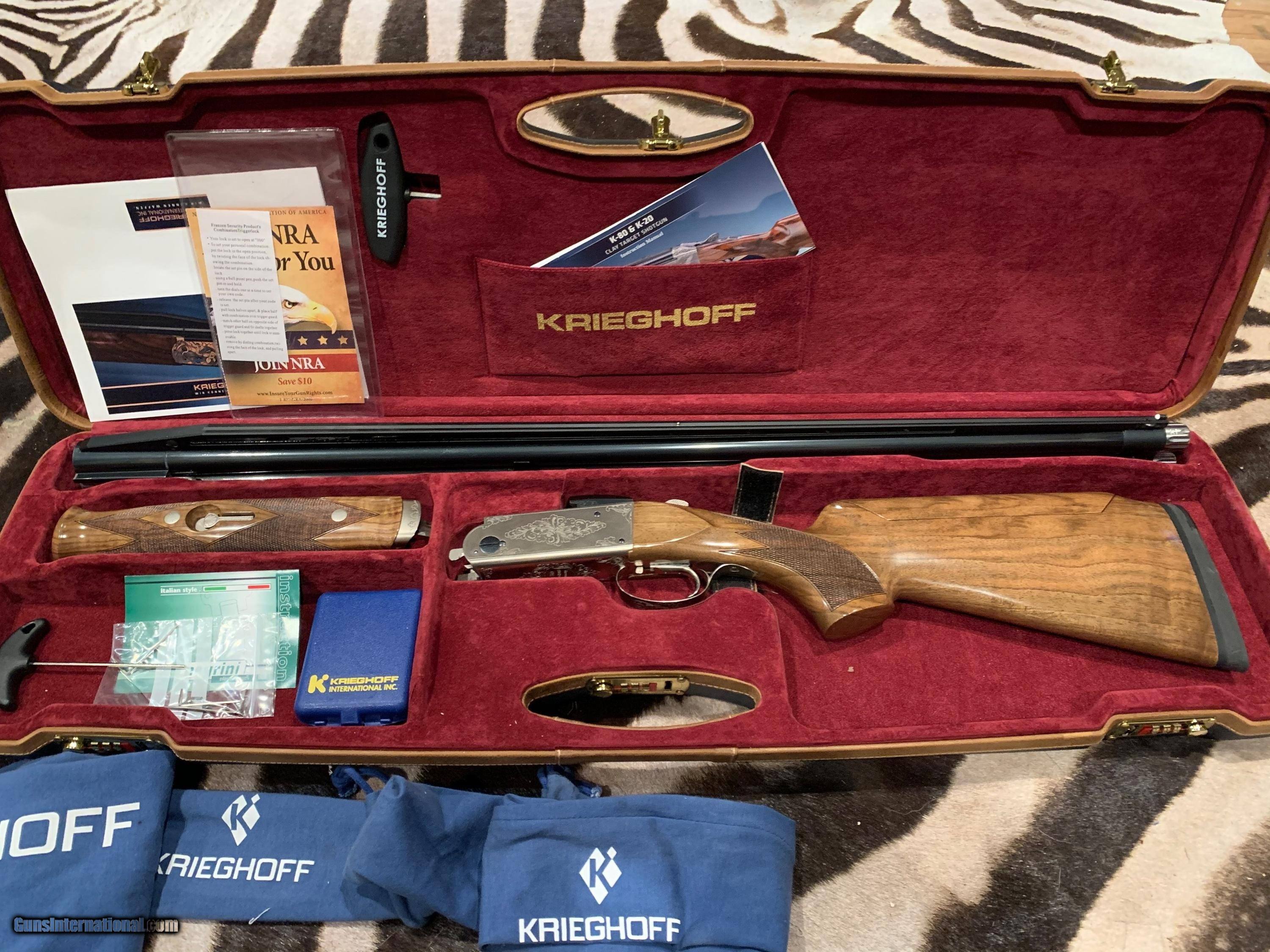 Description: K80 pro sporter in pristine condition, level two adjustable stock with ambidextrous palm swell in 100% condition, 32" barrel with adjustable rib and nickel receiver with no sign of use, five titanium chokes original Negrini leather trimmed case with paper, stock and comb wrench, socks and spare kit. SOLD SOLD Shotgun Gauge: 12 Gauge Manufacturer: Krieghoff Model: K80 Pro Sporter Barrel Length: 32” Bore: 100% Chambers: 3” Ejectors: Yes Condition: Like new Metal Condition: 99% plus Wood Condition: 100 Bore Condition: 100% Stock: Adjustable standard Butt Pad: Original LOP: 14-1/2” Rib: Adjustable Chokes: Removable Engraving: Standard scroll Case: Yes Item Location: North Carolina |