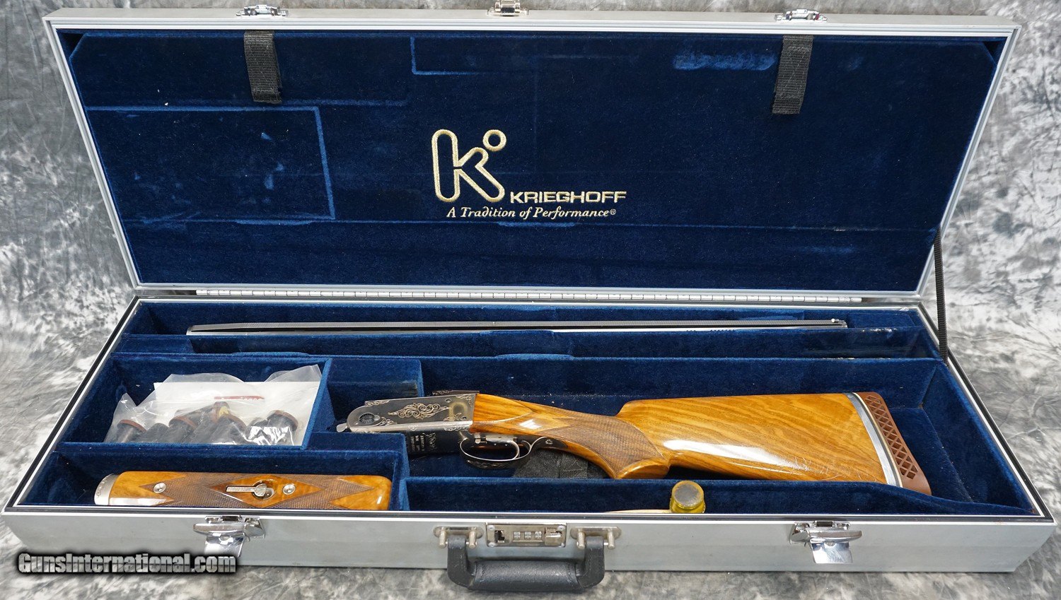 Description: Pre-Owned Krieghoff K-80 Standard Skeet 12GA with 28" factory choke tubed barrels, ported and full set of Kolar AAA Sub-Gauge Tubes (20/28/.410) included. Factory nickel finished action with standard scroll engraving, nickel has been polished, blued pins and top-lever latch showing bluing wear. Minor bluing wear on barrels. Factory No. 5 American Skeet Ambi stock with Jones style adj. butt plate and beavertail forearm. Checkering wear, handling marks and minor finish wear on stock/forearm. Includes Americase. Consignment, ineligible for trade-ins. SOLD Shotgun Gauge: 12 Gauge, 20 Gauge, 28 Gauge, .410 Gauge |
