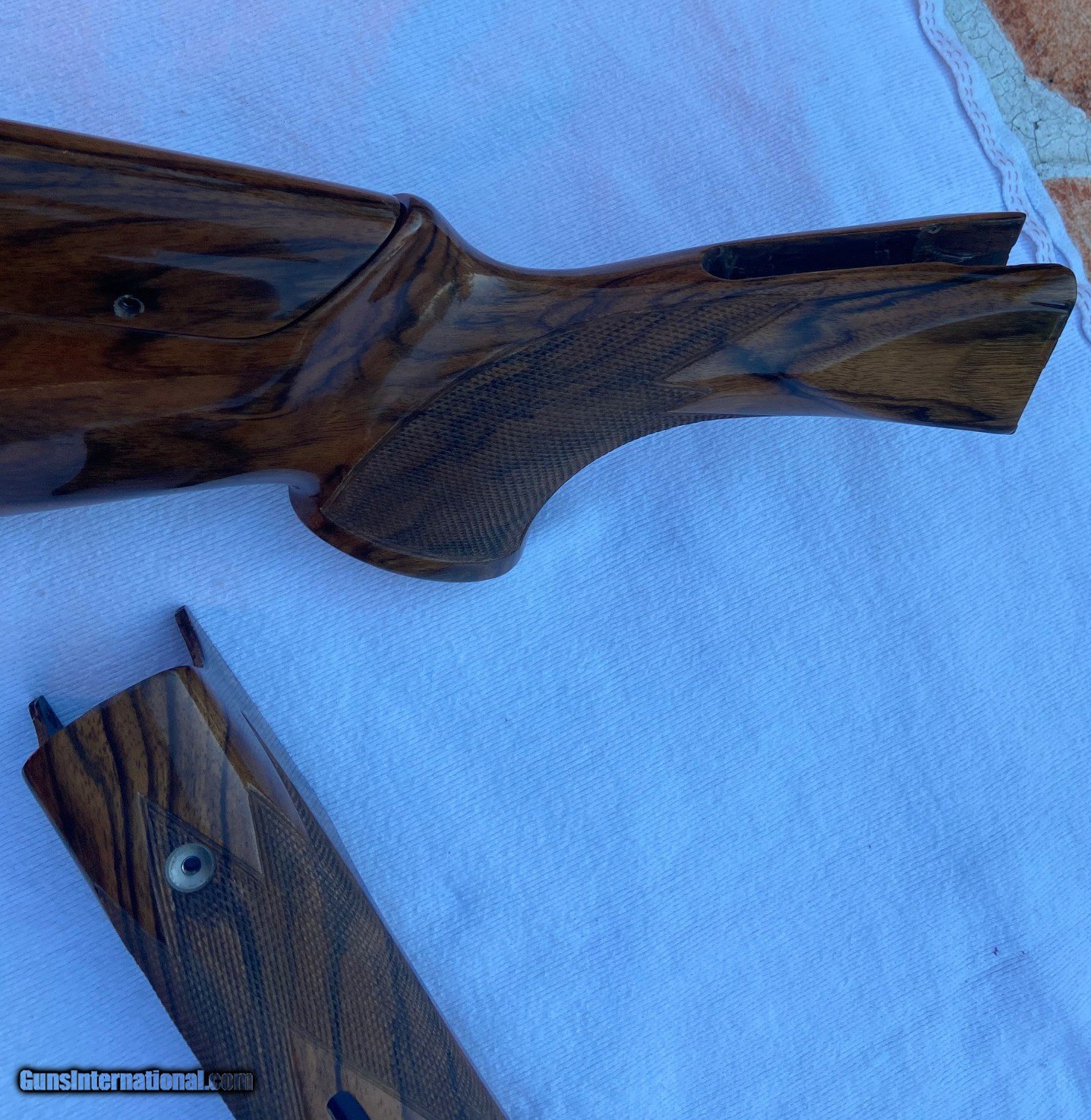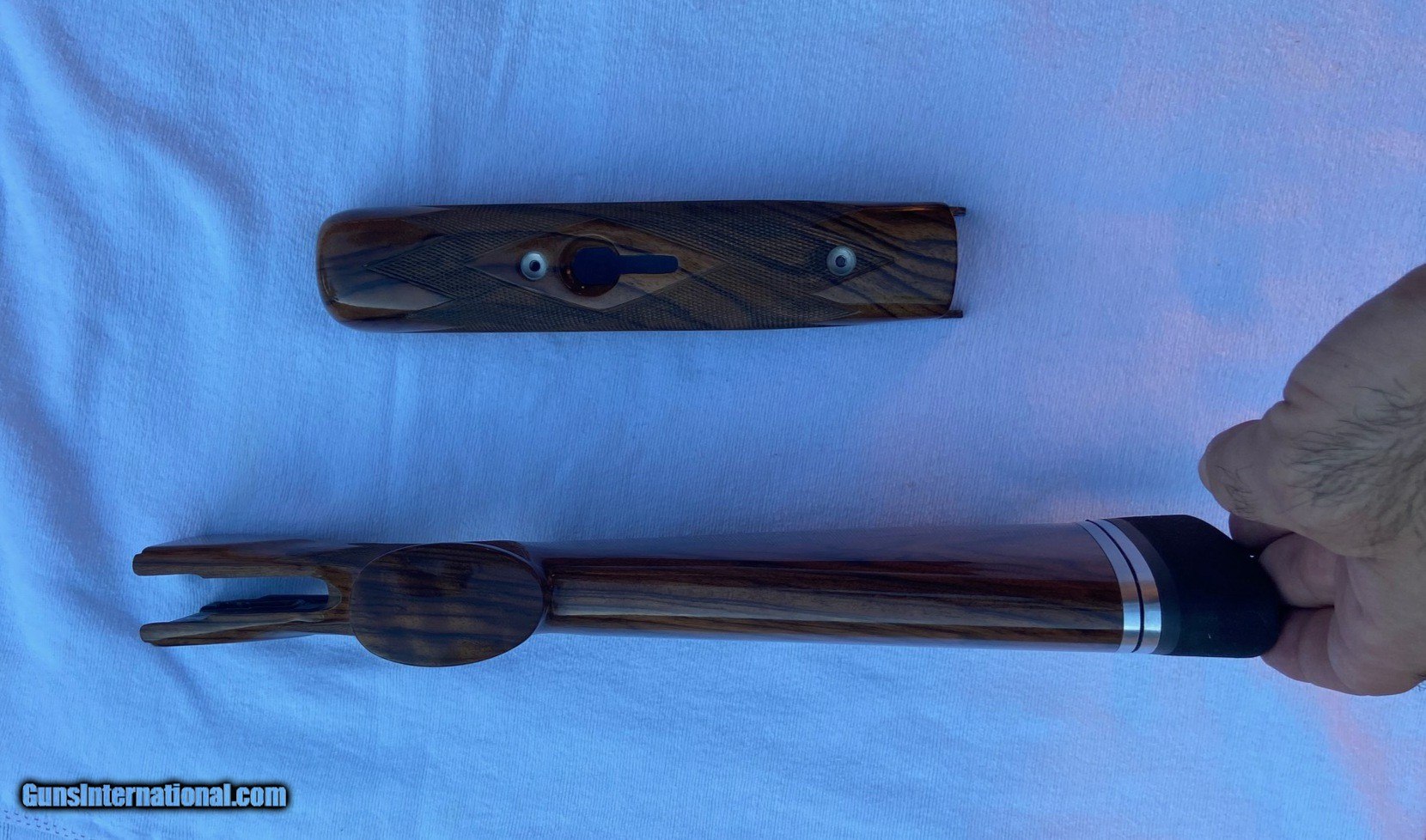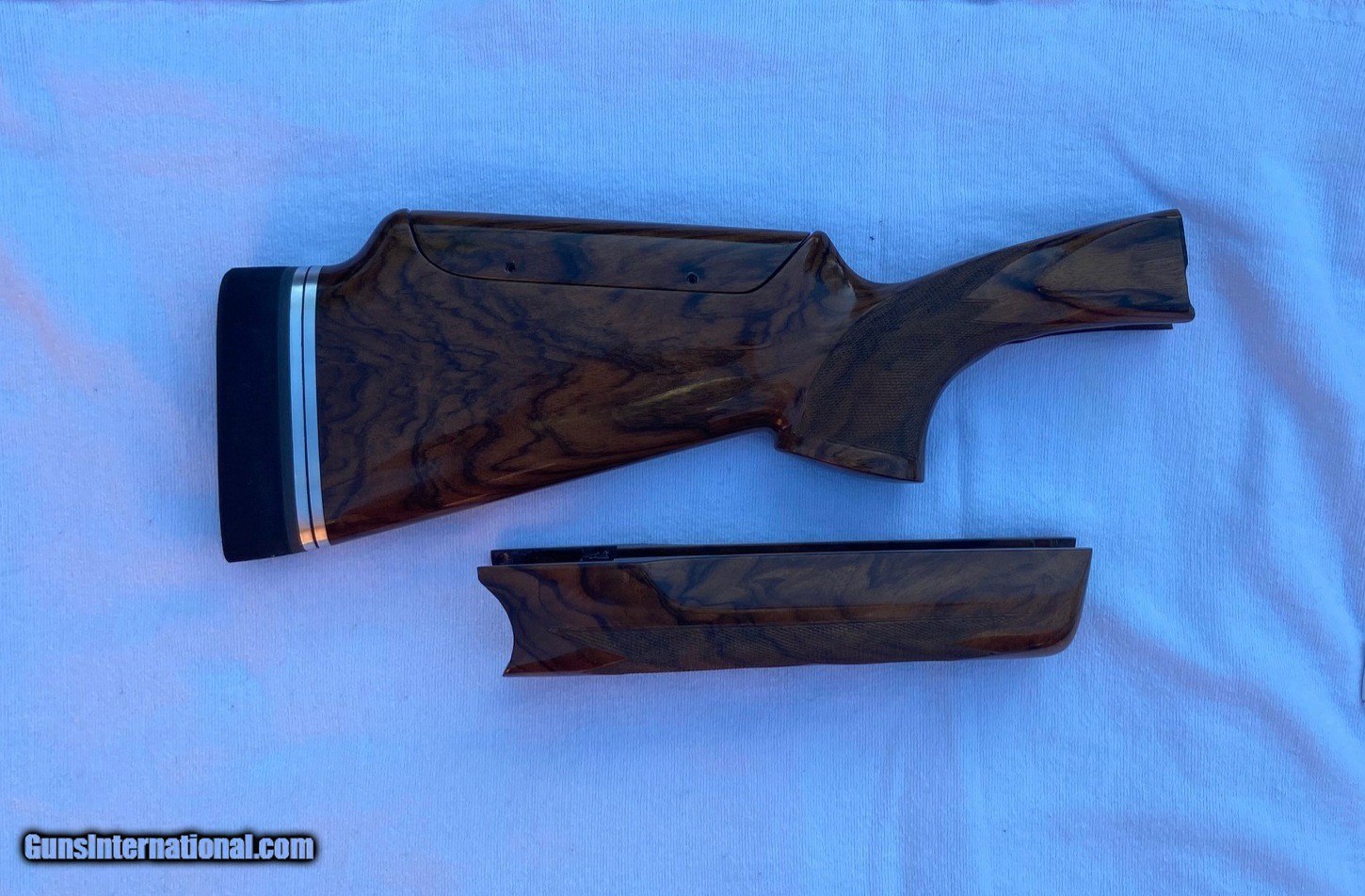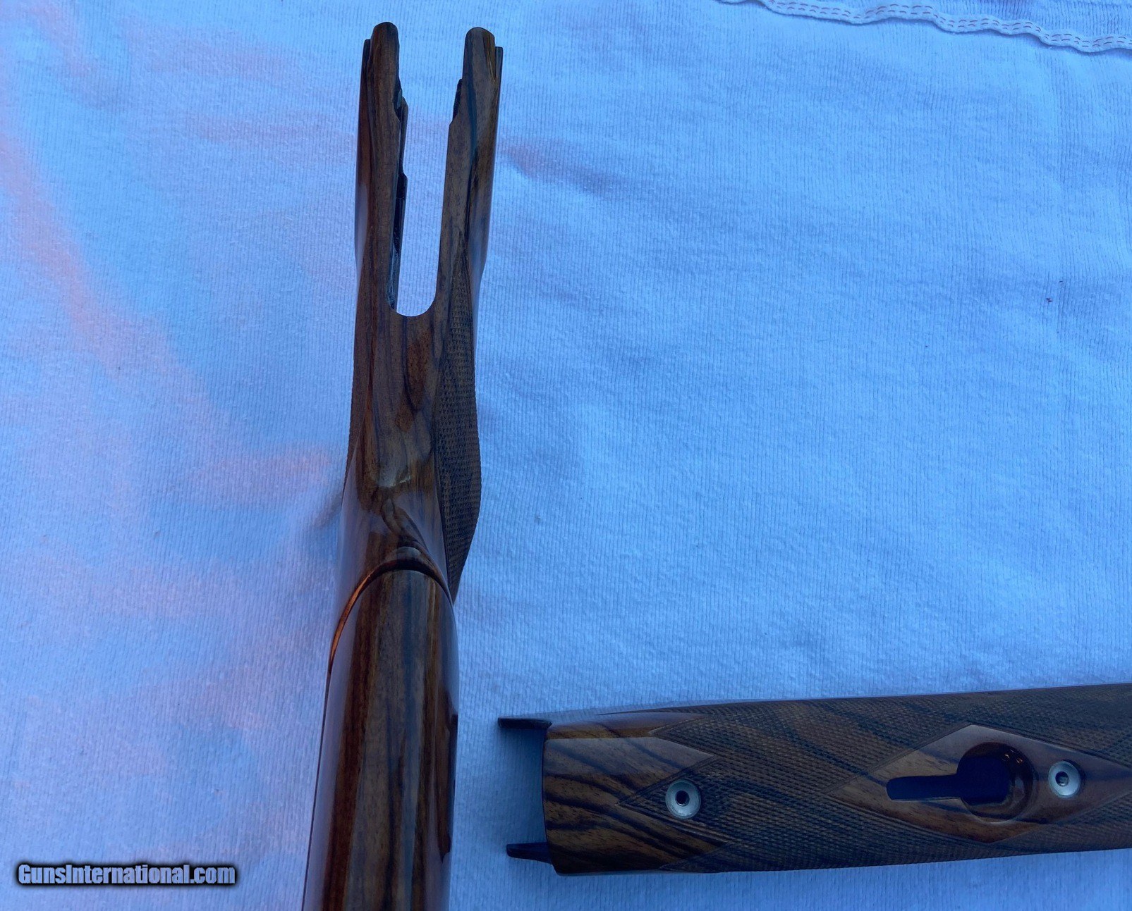 Description: Wenig New American Style Exhibition grade stock set. Right hand cast, offset, grip with palm swell. Off standard rib barrel dimensions are 1.5 x 1.5 x 2.5 x 14 & 5/8” LOP (trigger in center position) with single point adjustable pad plate and Cervellati Microcell recoil pad for that perfect fit. Includes stock bolt, forend rosettes and adjusting wrenches. Over 5K to duplicate. You can have this one for $2950 and no wait time. Flawless, absolutely pristine condition. Thanks and good shooting, Rey SOLD |