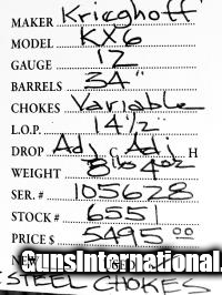 Description: Krieghoff KX6 12 gauge, steel chokes SOLD Serial Number: 105628 Barrels: 34 Stock Comb: Adj Stock Heel: Adj LOP: 14 1/2 Weight: 8 lbs 4 oz Chokes: Variable |