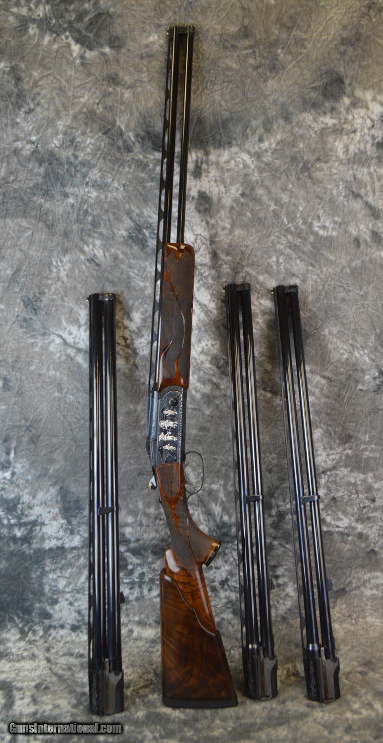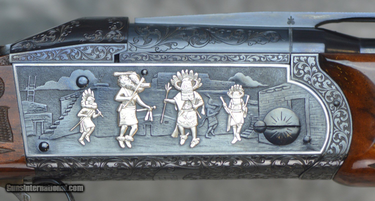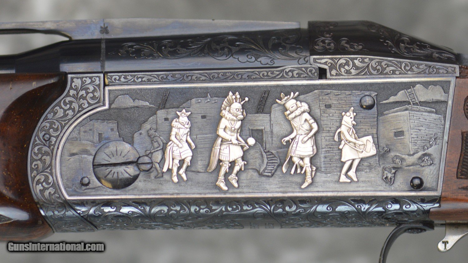 Description: Pre-Owned Krieghoff Model 32 Four Barrel Skeet 12/20/28/.410 with 28" fixed chokes (SKT/SKT) in all four barrels, additional full set of Kolar AAA Sub-Gauge Tubes (20/28/.410). Blued action featuring custom engraved "Anasazi" tribal scenes by unknown engraver in silver with silver borders, chambers of barrels scroll engraved; four barrels are matched to action. JS Air Cushion recoil reduction stock with handling marks and minor finish wear, original K32 trigger system, overall in good mechanical condition. Includes Americases. CONSIGNMENT, INELIGIBLE FOR TRADE-INS. SOLD Shotgun Gauge: 12 Gauge, 20 Gauge, 28 Gauge, .410 Gauge |