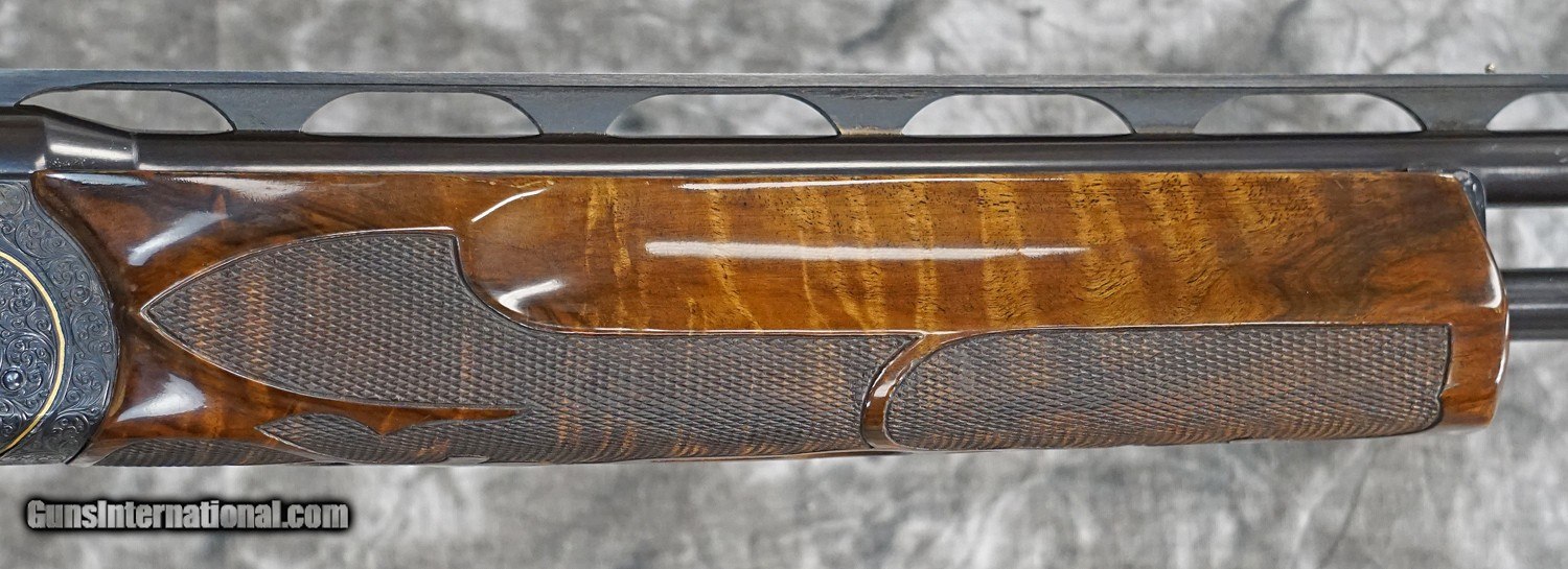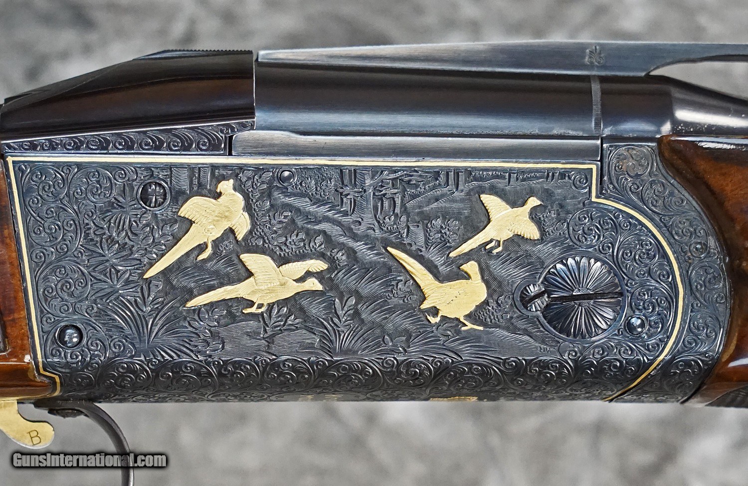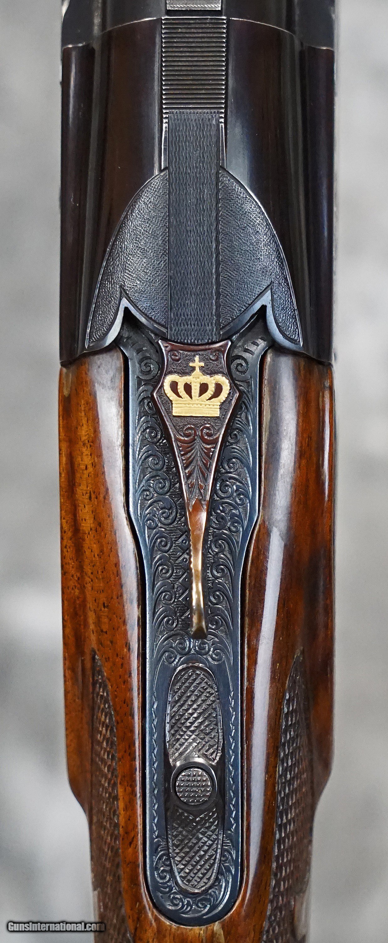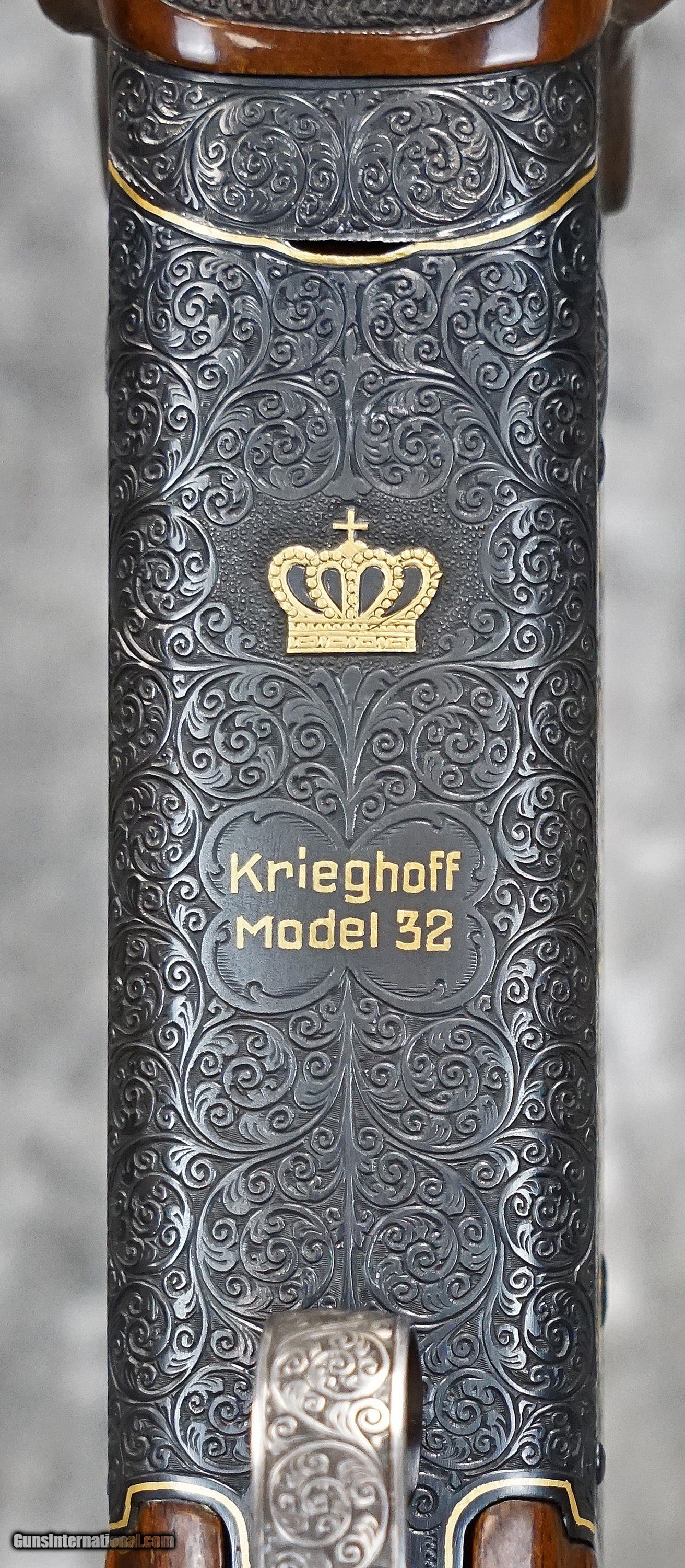 Description: Pre-Owned Krieghoff Model 32 Crown Four Barrel Skeet 12/20/28/.410 with 28" fixed choke (SKT/SKT) barrels. Blued action with deeply engraved scrolls and gold inlaid game scenes, hand-engraved and signed "H.V." (engraver unknown). Early model 32 action, unlikely factory Crown Grade. Barrels are not original and the 4 barrel set is composed. Monte Carlo pistol grip stock by unknown maker with beavertail forearm. Barrels have minor bluing wear, minor handling marks on stock and forearm. Includes case. Consignment, ineligible for trade-ins. SOLD Shotgun Gauge: 12 Gauge, 20 Gauge, 28 Gauge, .410 Gauge |