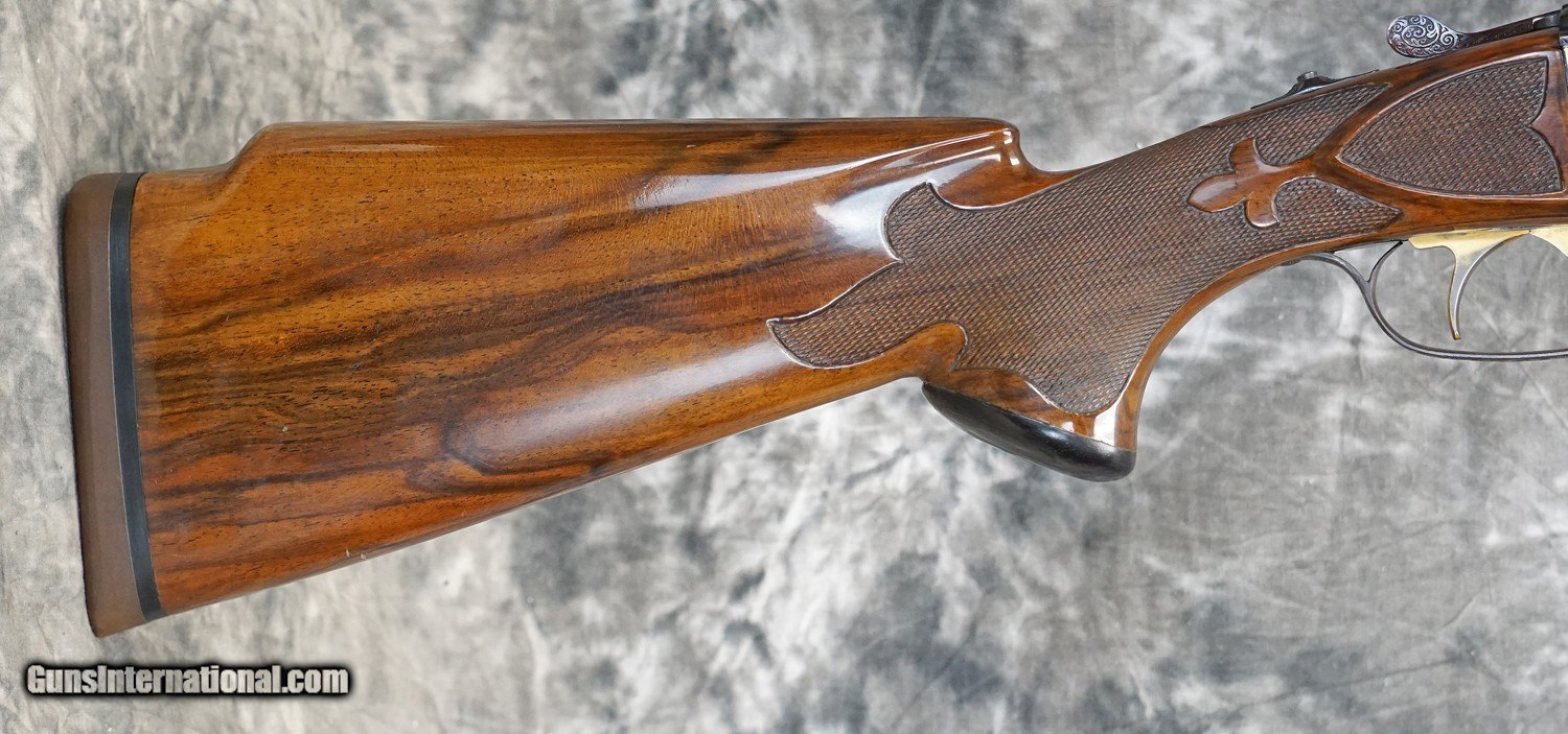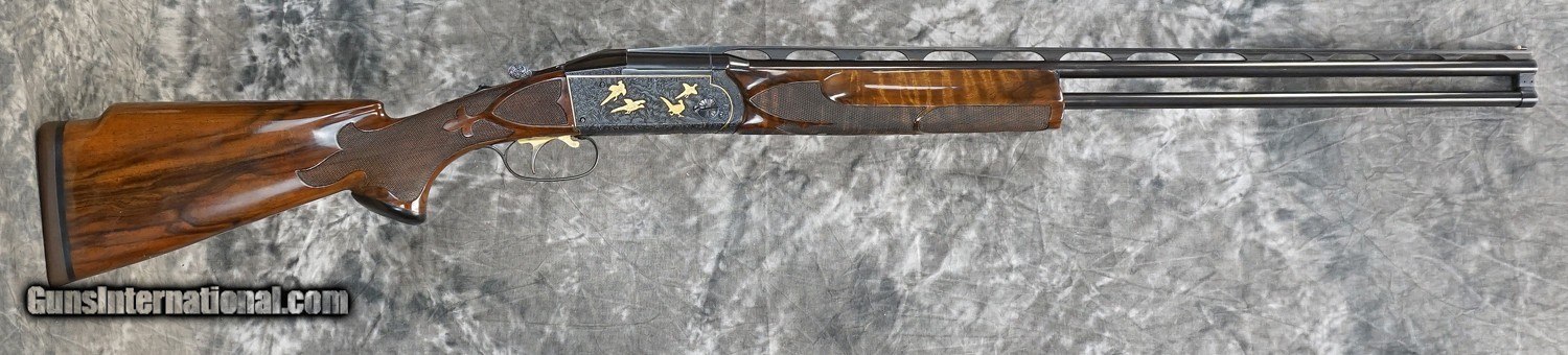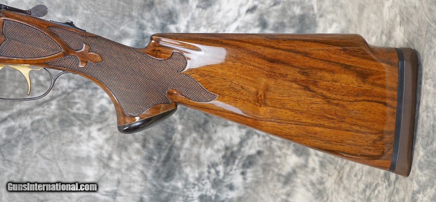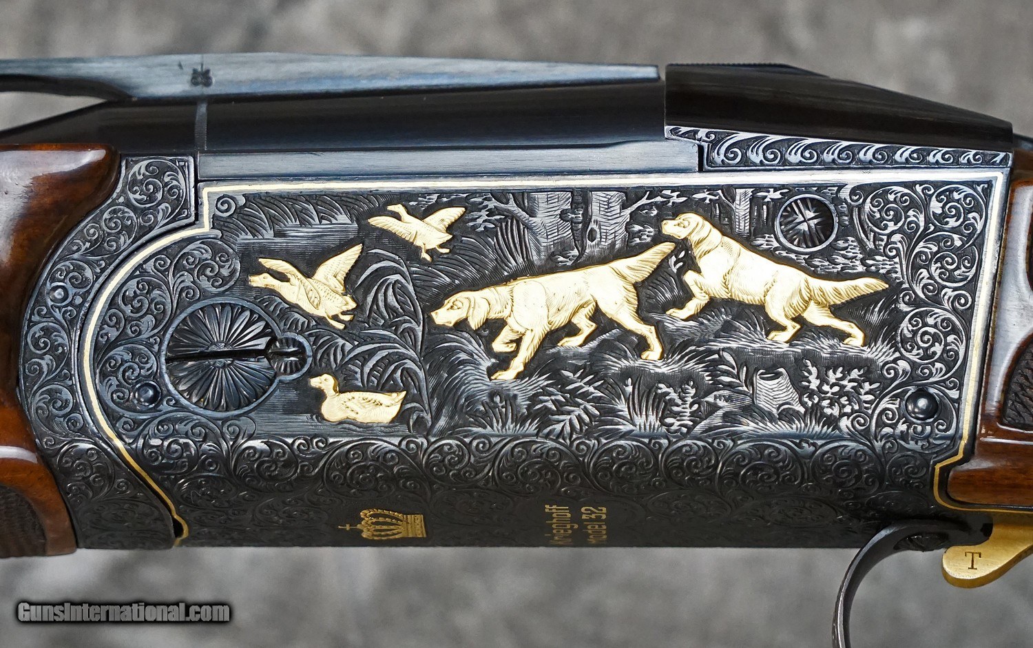 Description: Pre-Owned Krieghoff Model 32 Crown Four Barrel Skeet 12/20/28/.410 with 28" fixed choke (SKT/SKT) barrels. Blued action with deeply engraved scrolls and gold inlaid game scenes, hand-engraved and signed "H.V." (engraver unknown). Early model 32 action, unlikely factory Crown Grade. Barrels are not original and the 4 barrel set is composed. Monte Carlo pistol grip stock by unknown maker with beavertail forearm. Barrels have minor bluing wear, minor handling marks on stock and forearm. Includes case. Consignment, ineligible for trade-ins. SOLD Shotgun Gauge: 12 Gauge, 20 Gauge, 28 Gauge, .410 Gauge |