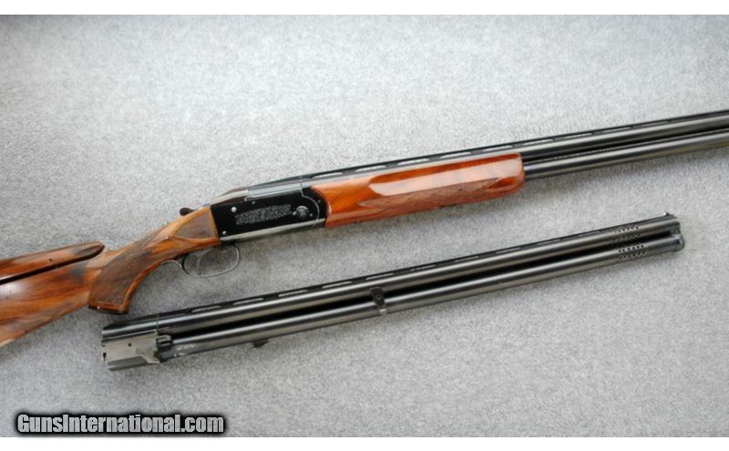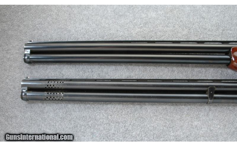 Description: The action shows wear and is reasonable tight, the barrels are on face. The top lever is at center. SOLD Manufacturer: 1969 Caliber Info: 12 & 20 Gauge original barrels with extra 20, 28 & .410 gauge barrels not serial numbered to gun but do fit properly and a 20, 28 .410 gauge Briley Tube set Chambers: Original barrel 12 and 20 gauge set are 2 3/4 inch chambers. The other set are chambered 3 inches Metal Condition: Fair, with wear on the frame and scattered scratches through out Wood Condition: Fair, scratches and dents. There is crack in the wrist by the top tang. Bore Condition: Very good, bright Barrels: 30 inch and 28 inch barrels Triggers: Single selective trigger Stock: Checkered walnut pistol grip stock with adjustable comb Stock Dimensions: 14 1/2 inch LOP Fore End: Checkered walnut Butt Pad: Kick-Eez pad Weight: 8 lbs. 6 oz. with 30 inch barrels Sights: Vent rib with double beads Chokes: Full and Full 30 inch barrel all others Skeet and Skeet. Briley tube set has screw in choke tubes Extras: Aluminum luggage case Item Location: Lehi, UT |