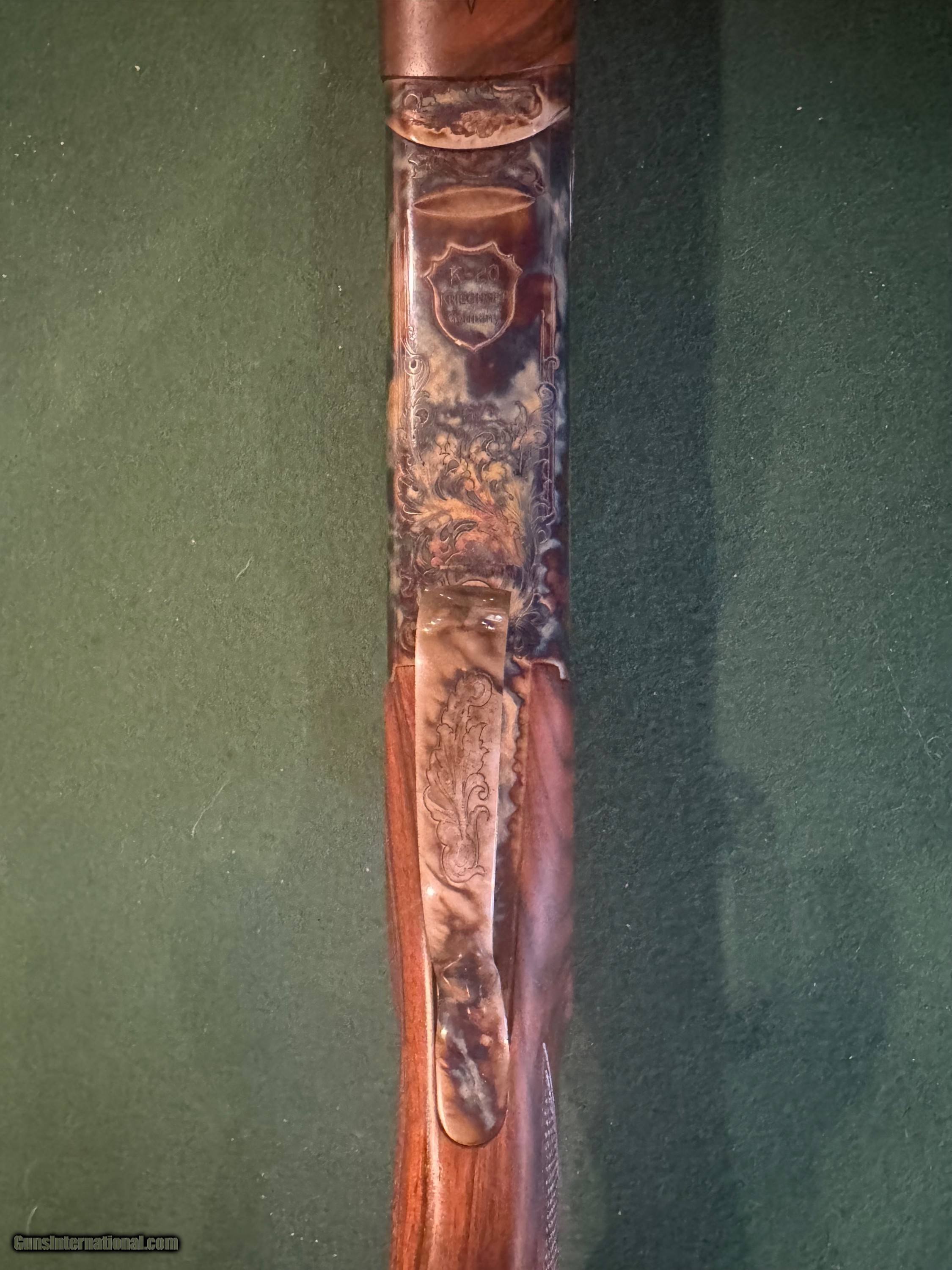 Description: This custom orderd K-20, 28 gauge Parcours model includes beautifully executed case coloring, enhancing Krieghoff's Vintage Scroll Type engraving pattern (an upgrade from the standard Krieghoff patterns). The barrels are Rust Blued and the highly figured wood is oil rubbed, both part of the special order. The gun has seen little use from the original owner as well as myself. Condition is overall excellent. The gun functions flawlessly and does exactly what it is told to do...even when I tell it to miss!!! The barrels are fitted with Briley screw in chokes- SKT SKT IC MOD IMOD for various clay and hunting applications. The trigger is selective. The sale includes a standard Krighoff case. Shotgun Gauge: 28 Gauge Manufacturer: Krieghoff Model: K-20 Serial Number: 110356 Barrel Length: 30 Bore Info: 28g Ejectors: yes Condition: Excellent Metal Condition: Excellent Wood Condition: Excellent Bore Condition: Excellent Barrels: o/u Barrel Type: Rust Blued Triggers: single, selective Stock: oil rubbed Stock Comb: 1 1/12 Stock Heel: 1 7/8 LOP: 14 3/4 Chokes: Briley screw in Engraving: yes Case: yes Price: $15,995.00 Contact Seller |