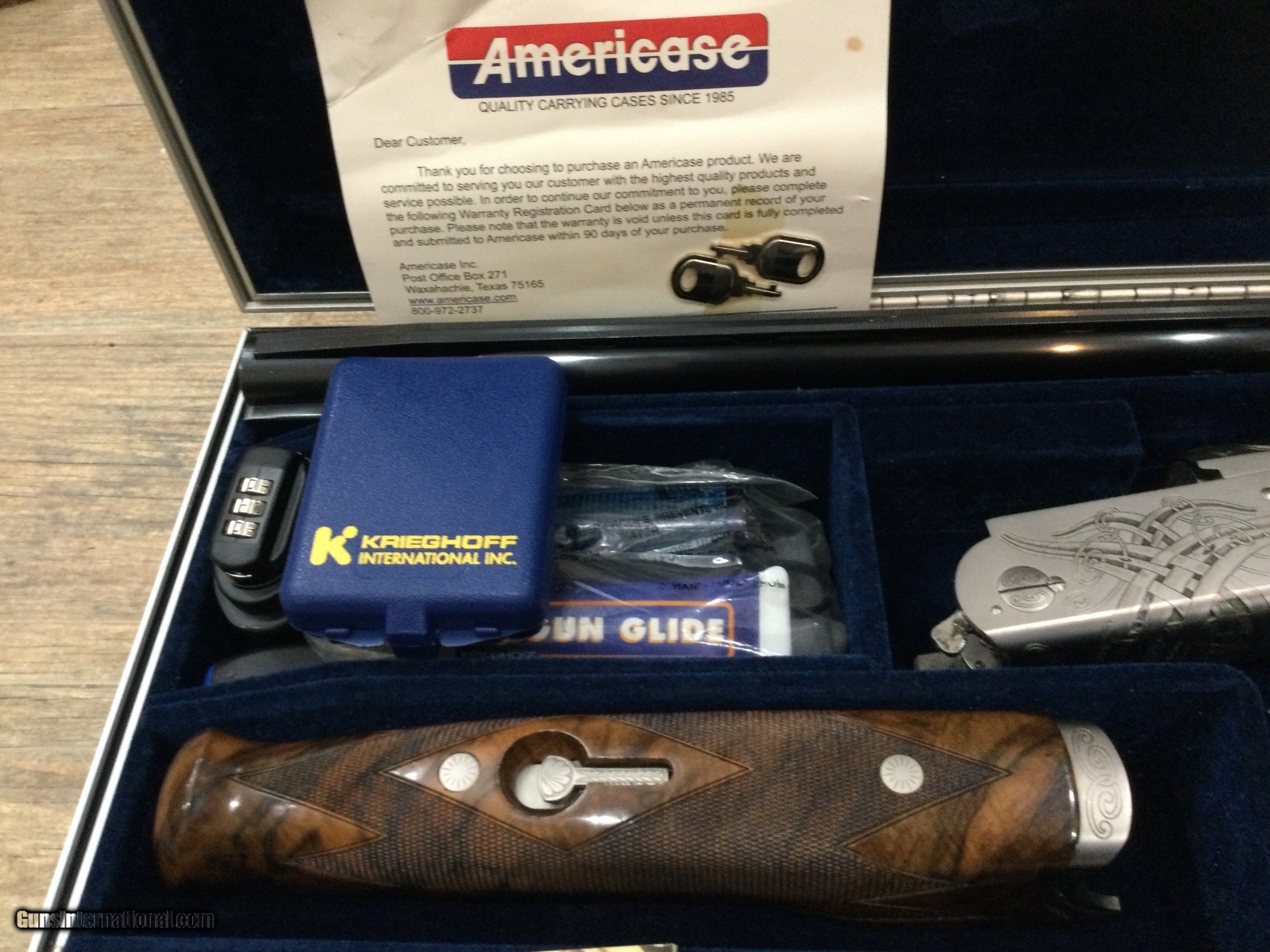 Description: Bought this Krieghoff K80 Sporting Celtic model in 2019 new unfired from Pacific Sporting Arms, shot it less then 100 rounds. The gun sports a 32" barrel with five Titanium original chokes. Factory Celtic engravings with Bavarian upgrade ambidextrous wood factory adjustable comb and double palm swell. Today replacement cost would be $16,500. Condition is as new in the box with tools chokes and paper work. Beautifull gun but I've been shooting Perazzis for forty years. SOLD SOLD Shotgun Gauge: 12 Gauge Manufacturer: Krieghoff Model: Celtic Sporting Barrel Length: 32” Bore: 100% Ejectors: Yes Condition: 100% Metal Condition: 100% Wood Condition: 100% Bore Condition: 100% Barrel Type: Ventilated Action: Over & under Triggers: Selectable Stock: Adjustable Butt Pad: Original LOP: 14-5/8” Rib: Ventilated Finish: Nickel/blue Chokes: Removable Engraving: Yes Celtic Extras: Chokes, tools Case: Yes Item Location: North Carolina |