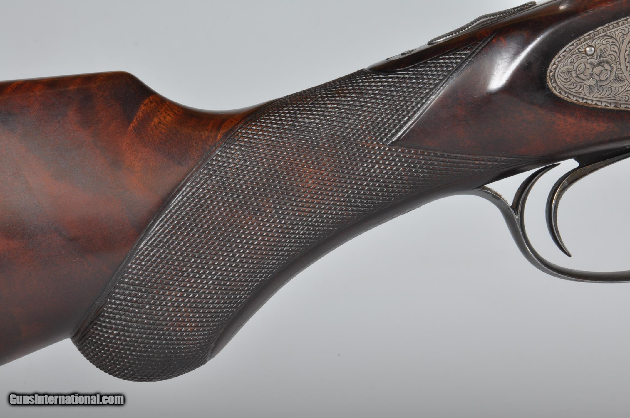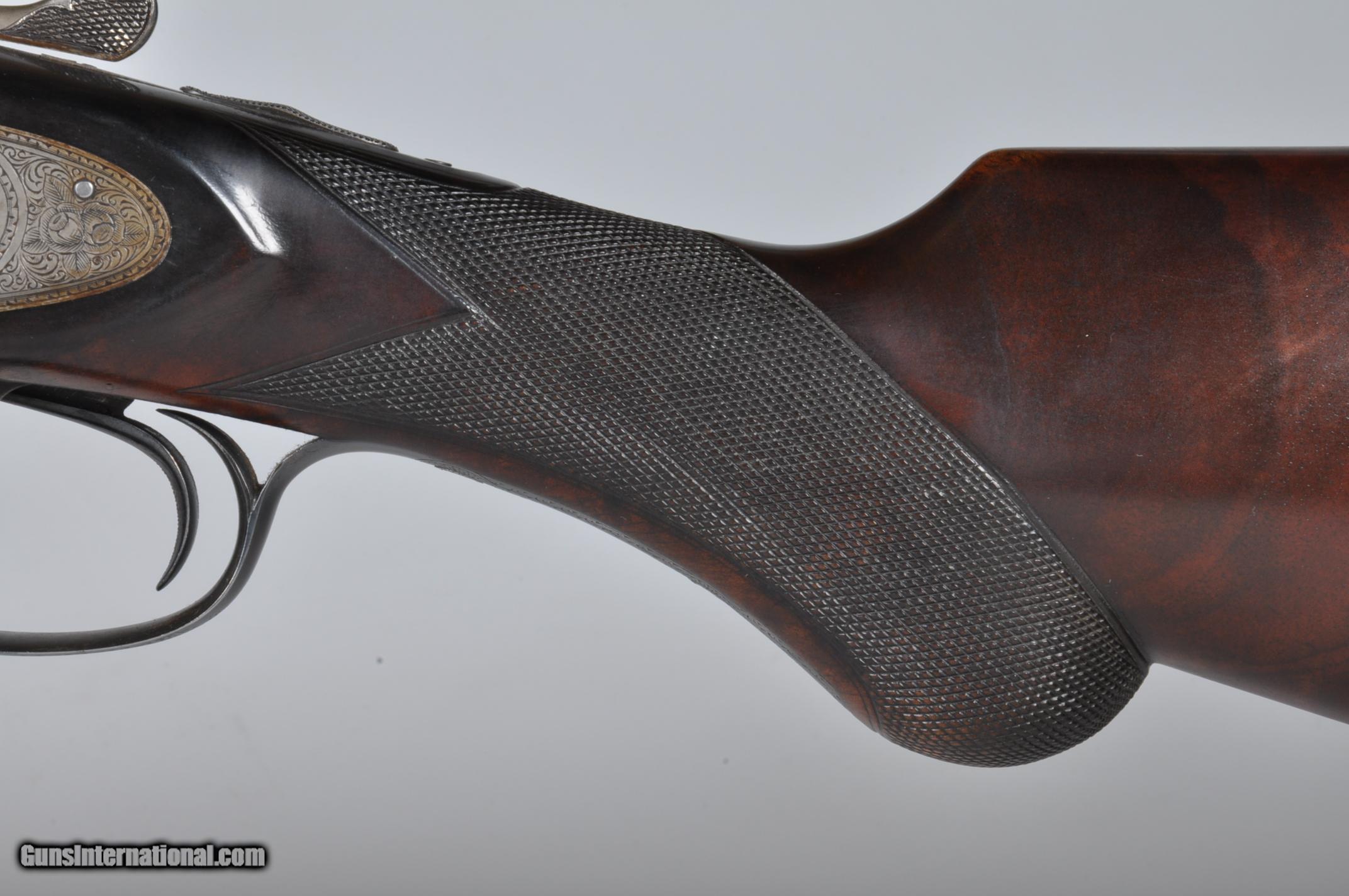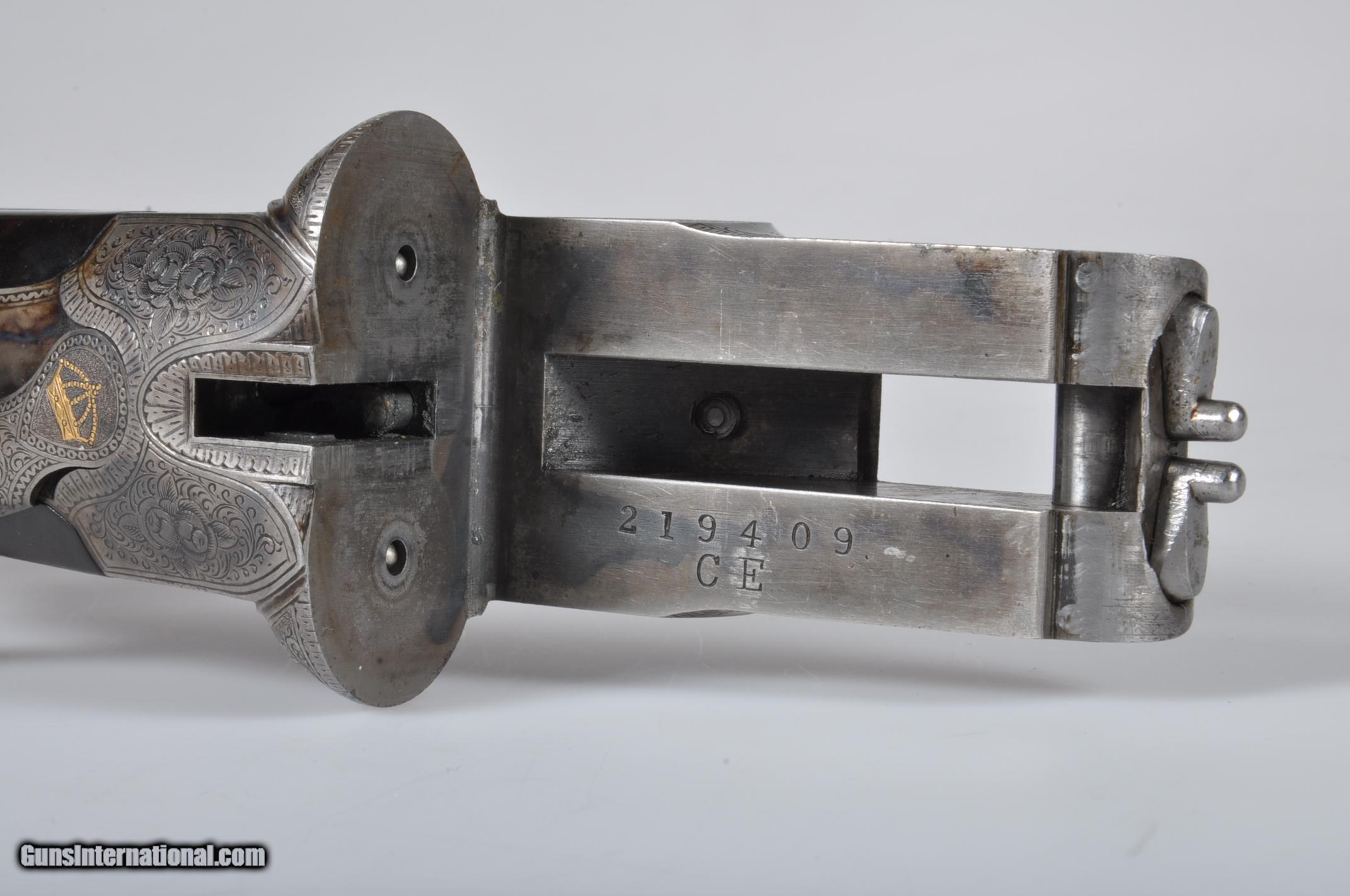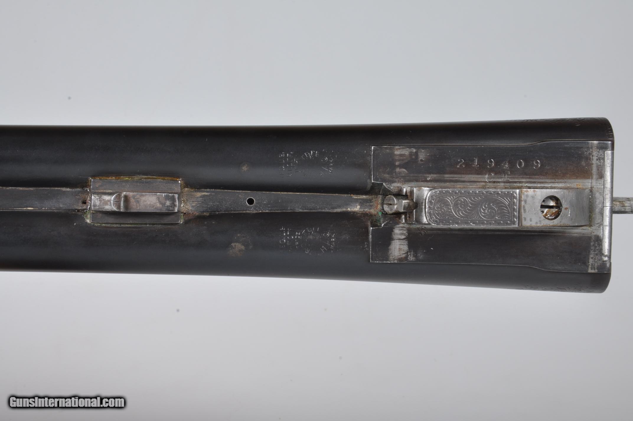 Description: 30” Nitro steel barrels with 2 ¾” chambers, choked .038 right and .024 left. Full length concave matte rib with dual white beads and a gold line 2” in front of breech. Right barrel is marked L.C. SMITH CROWN GRADE and the left is marked MADE TO ORDER BY THE HUNTER ARMS CO. FULTON, N.Y. The barrels have been refinished and retain 98% bluing. Bores are bright and shiny. Hunting dog scenes are engraved on both side plates with floral and scroll patterns. The receiver and trigger guard are engraved with a floral and scroll pattern. A gold crown is inlaid on the top lever. The receiver retains 20% case color while the sideplates and forend iron retain little case color. The trigger retains 70% original bluing. Dual triggers with the front trigger firing the left barrel, automatic safety and ejectors. The pistol grip stock is two point checkered and wraps over the grip and around the round knob pistol grip. It has been refinished and has a few light handling marks. The forearm is three point checkered and has also been refinished. Length of pull is 14 1/2” over a red recoil pad. Drop at comb: 1 5/8”, Drop at heel: 2 3/4”. Weight: 8.2 lbs. Mechanics are good. California Sales OK PLEASE NOTE! My office hours are 7am-5pm CST Monday through Wednesday. Emails or phone calls received after hours and on the weekend will be answered on the following business day. SOLD Manufacturer: L.C. Smith Model: Crown Grade Serial Number: 219409 Chambers: 2 3/4 Ejectors: Yes Barrels: 30 Triggers: Double Gauge Info: 12 Stock: Pistol Grip Fore End: Beavertail LOP: 14 1/2 |