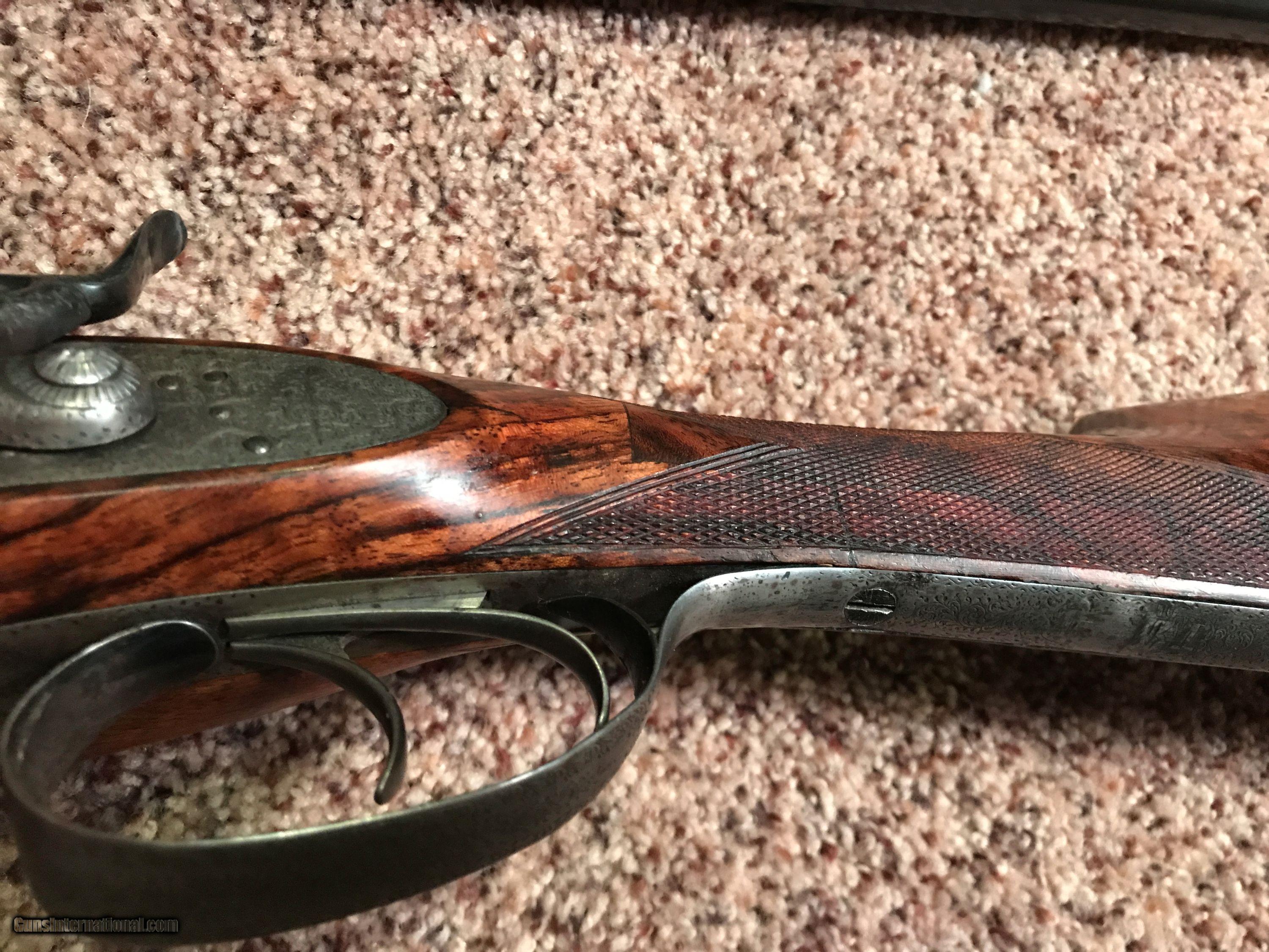 Description: This is a rare gun, indeed. Almost as rare as the pair of Woodwards that I recently listed. It's a Best Quality Sidelock Hammer Bar In Wood Pigeon Gun made by James Lang in 1891. James Lang sold his interest in Joseph Lang and Sons and started on his own for a brief period in the early 1880s. I don't think that he made more than a couple of hundred guns but the few that I have seen have all been very nice. This gun is no exception. It has original 30 inch barrels with a high pigeon rib. The hammers on the lgun disappear from the line of sight when they are cocked. I purchased the gun from Australia and the stock was broken and had two steel side bolsters holding it together. I was planning to have it restocked but the wood was just too nice. I sent it to my favorite stocker and he was able to bring it back to life. It took two pieces of maple, a lot of fiberglass, and recheckering but is now very strong and the wood is absolutely beautiful. I was also able to find a period Westley Richards hammer gun case that was lovingly refurbished by a gentleman in England that is the perfect compliment to the gun. At about 7 lbs 8 ounces it balances like a much lighter gun and is a joy to shoot! SOLD Curio/Relic: Yes Antique: Yes Manufacturer: James Lang Model: Best Bar In Wood Hammer Gun Bore: 12 Chambers: 2 3/4 Ejectors: Non Condition: Very good Metal Condition: Very good Wood Condition: Very good Bore Condition: Excellent Barrels: 30 Barrel Type: Side by Side Action: Bar in Wood Triggers: Doube Gauge Info: 12 Stock: Walnut LOP: 15 1/2 Rib: Pigeon Manufacture Date: ~1883 Choke Left: Full Choke Right: Full Engraving: Best scroll Case: Westley Richards Item Location: Colorado |