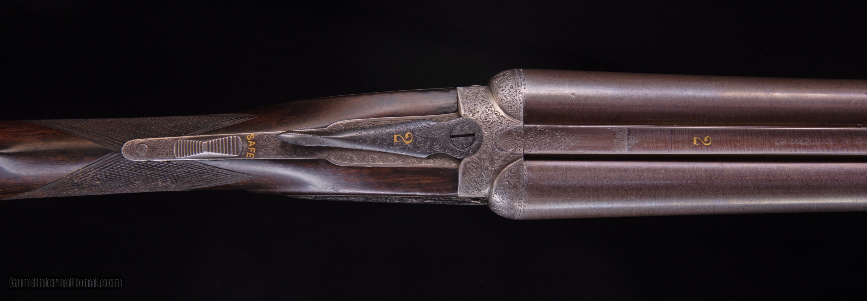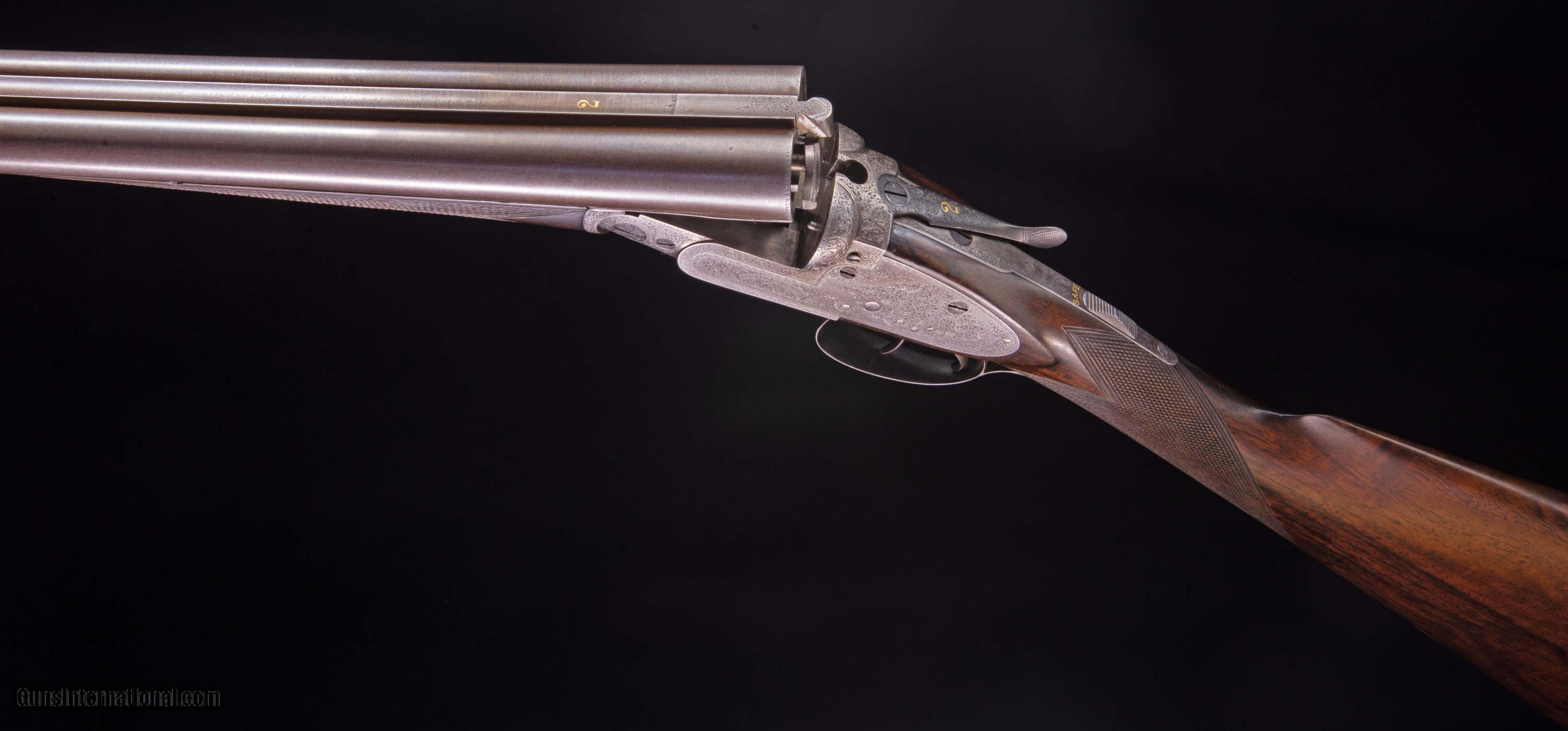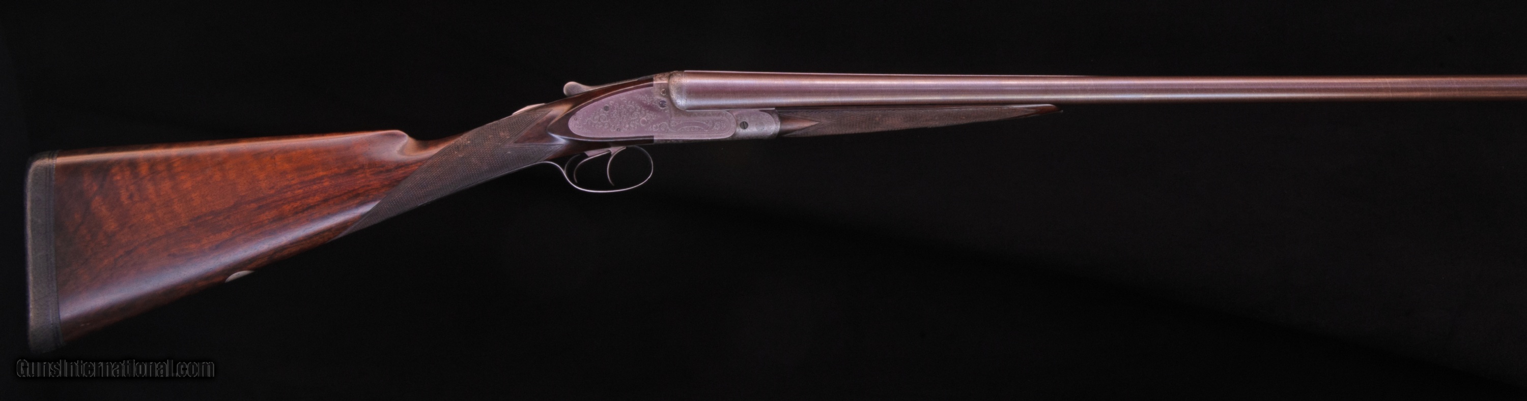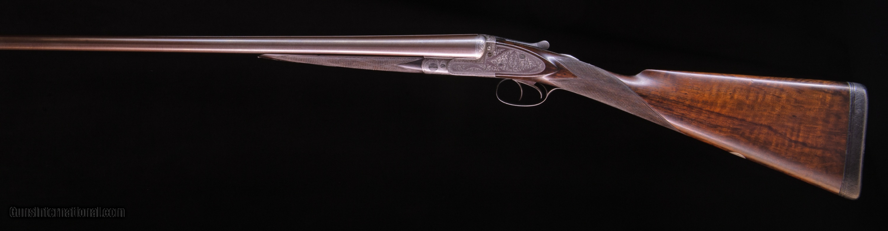 Description: Hammerless Sidelocks - A very nice sidelock 16 with well-balanced 30"nitro proofed Damascus barrels. Antique so we can ship direct, no ffl needed. *The thin minimum walls are way out forward in these long barrels where there is little pressure. *** Note: To see this gun with high resolution photos and a zoom-in feature, go to the vintagedoubles main site and search for the gun ID: 5998 or browse the main site to see our full gun collection. SOLD Manufacturer: Joseph Lang and Son, 22 Cockspur Street, Pall Mall London ~ 16g. London sidelock with 30"nitro proofed barrels Model: None Serial Number: 7554 Ejectors: No Barrels: 30 Barrel Type: Damascus Gauge Info: 16 gauge Stock Comb: 1 5/8 Stock Heel: 2 1/8 Stock Cast: 0 LOP: 14 3/4" with pa Weight: 5 lbs 13.5 ozs Choke Left: .004 skeet Choke Right: Cyl Proof:Nitro: 2 1/2 Minimum Wall Thickness Left: .020 Minimum Wall Thickness Right: .018" along bot |