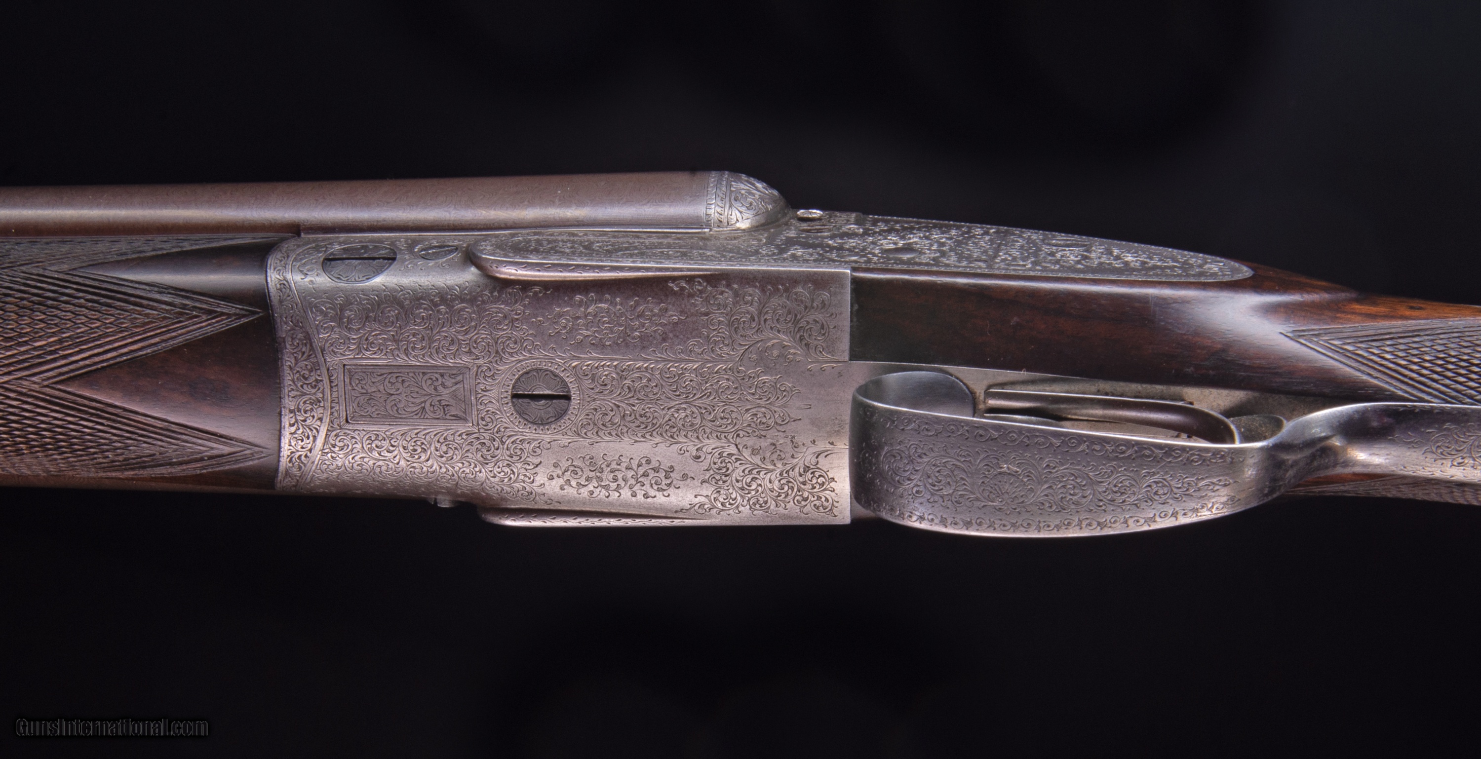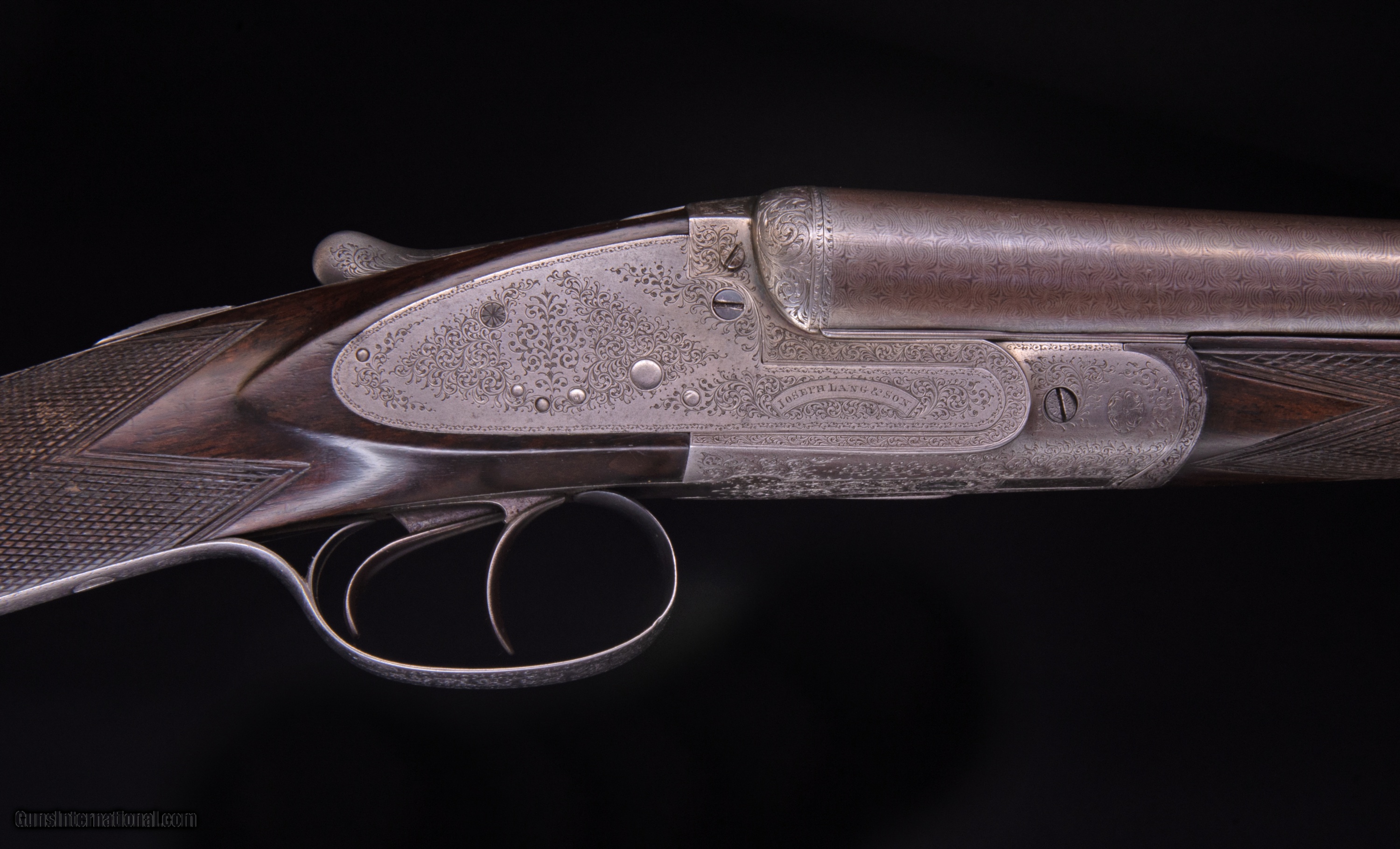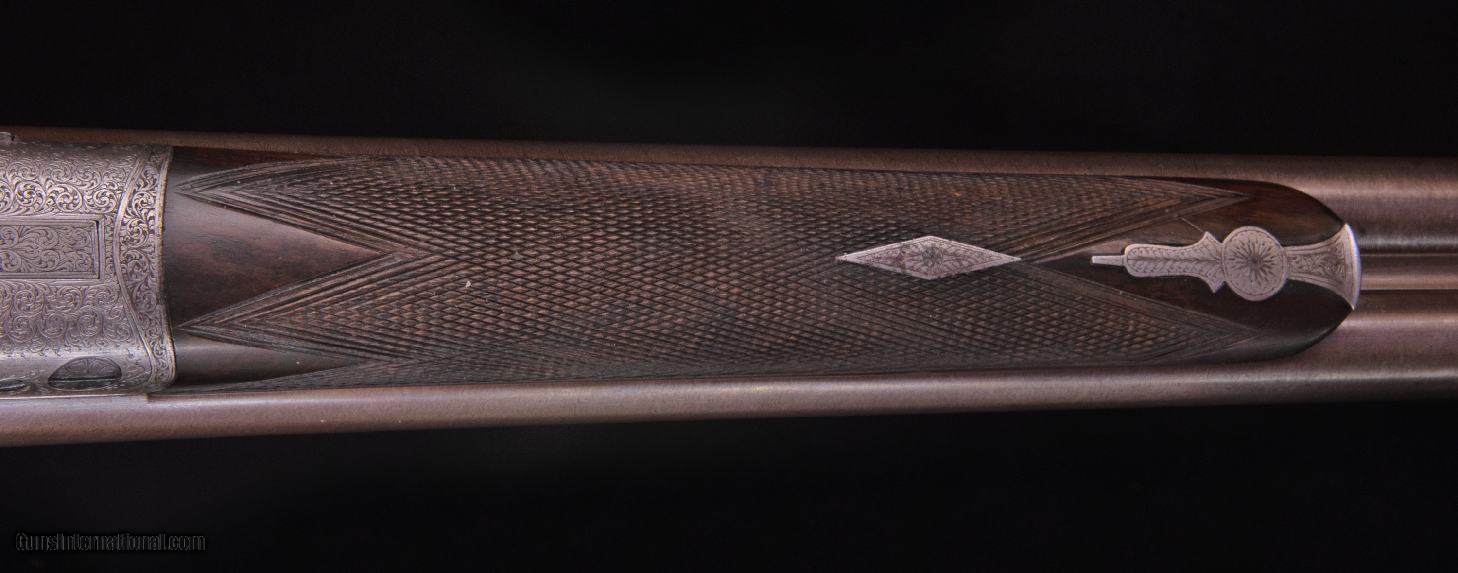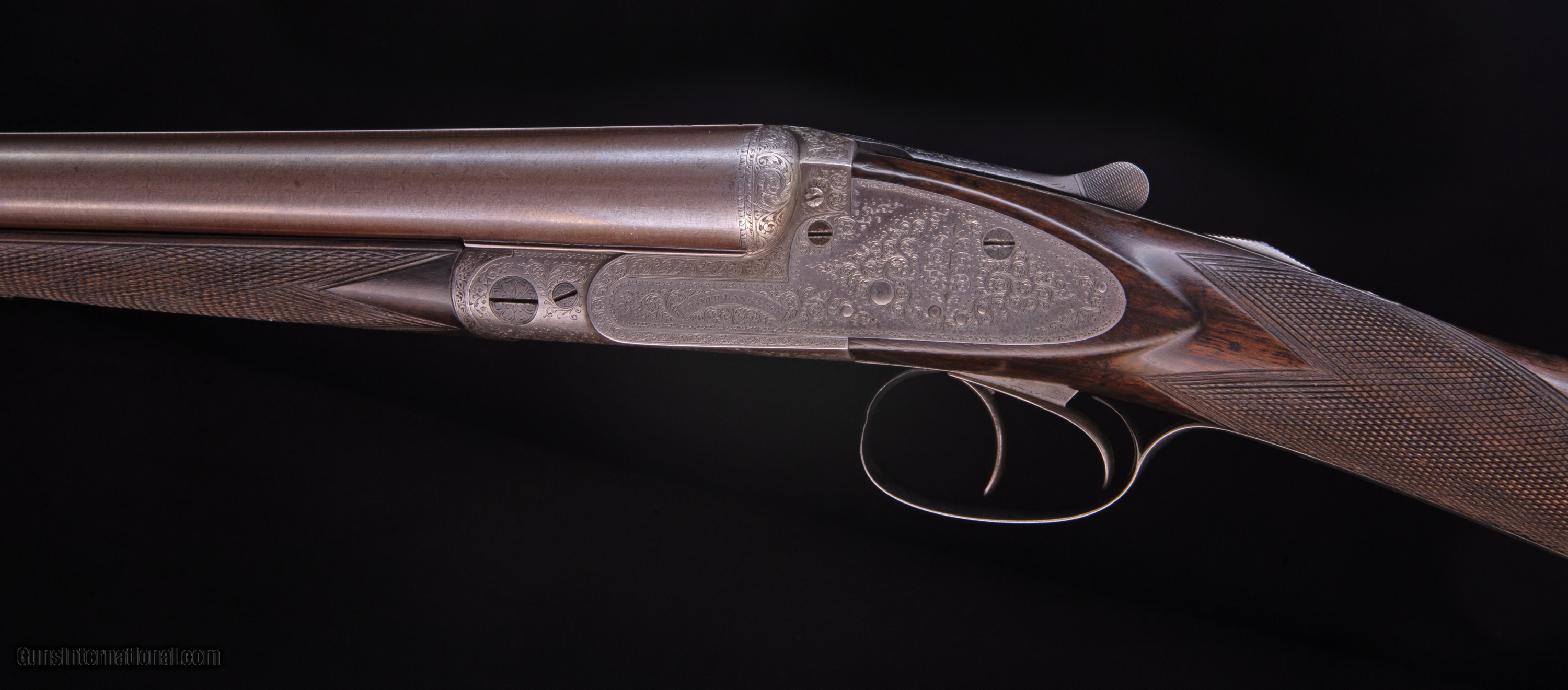 Description: Hammerless Sidelocks - A very nice sidelock 16 with well-balanced 30"nitro proofed Damascus barrels. Antique so we can ship direct, no ffl needed. *The thin minimum walls are way out forward in these long barrels where there is little pressure. *** Note: To see this gun with high resolution photos and a zoom-in feature, go to the vintagedoubles main site and search for the gun ID: 5998 or browse the main site to see our full gun collection. SOLD Manufacturer: Joseph Lang and Son, 22 Cockspur Street, Pall Mall London ~ 16g. London sidelock with 30"nitro proofed barrels Model: None Serial Number: 7554 Ejectors: No Barrels: 30 Barrel Type: Damascus Gauge Info: 16 gauge Stock Comb: 1 5/8 Stock Heel: 2 1/8 Stock Cast: 0 LOP: 14 3/4" with pa Weight: 5 lbs 13.5 ozs Choke Left: .004 skeet Choke Right: Cyl Proof:Nitro: 2 1/2 Minimum Wall Thickness Left: .020 Minimum Wall Thickness Right: .018" along bot |