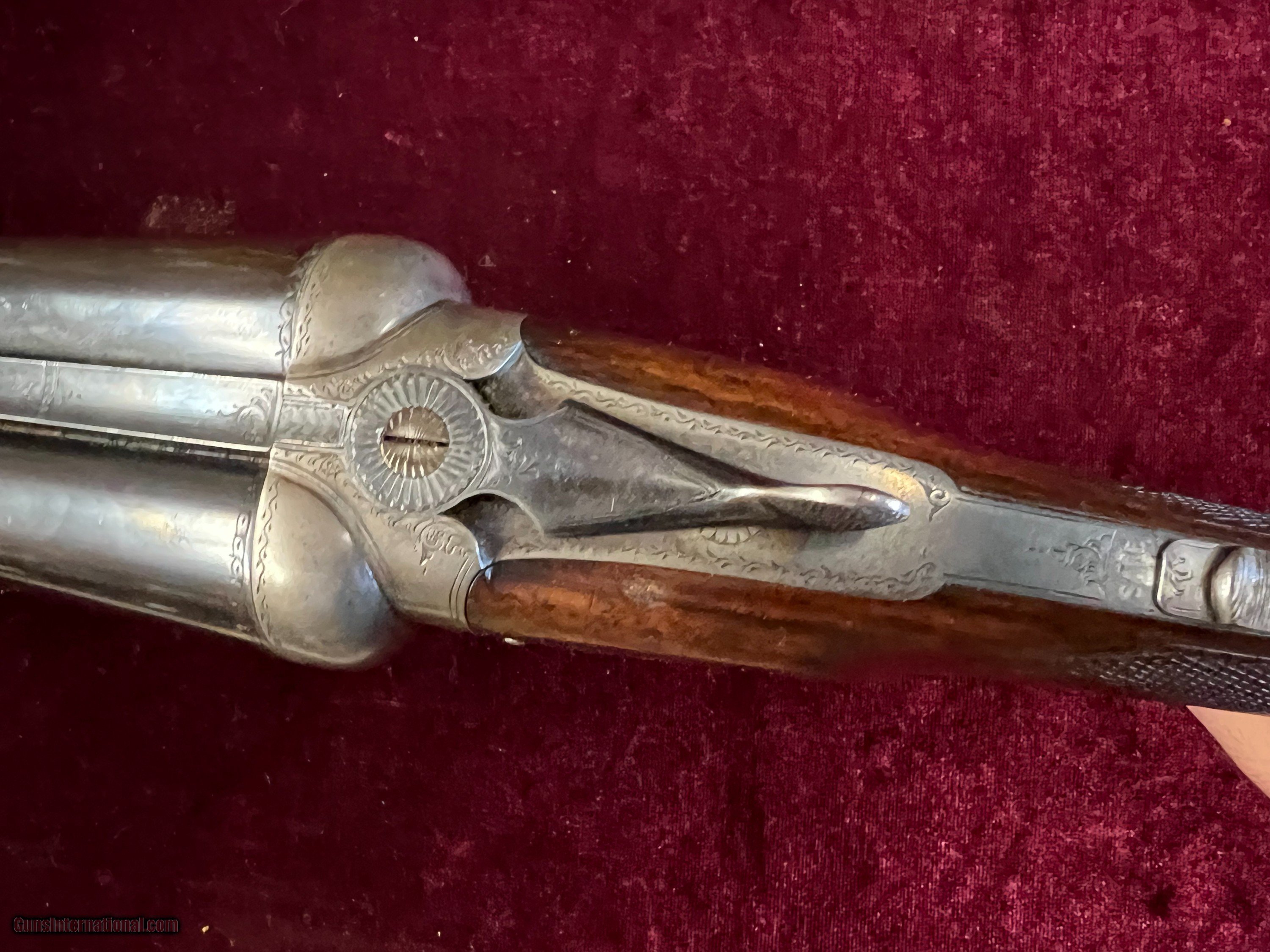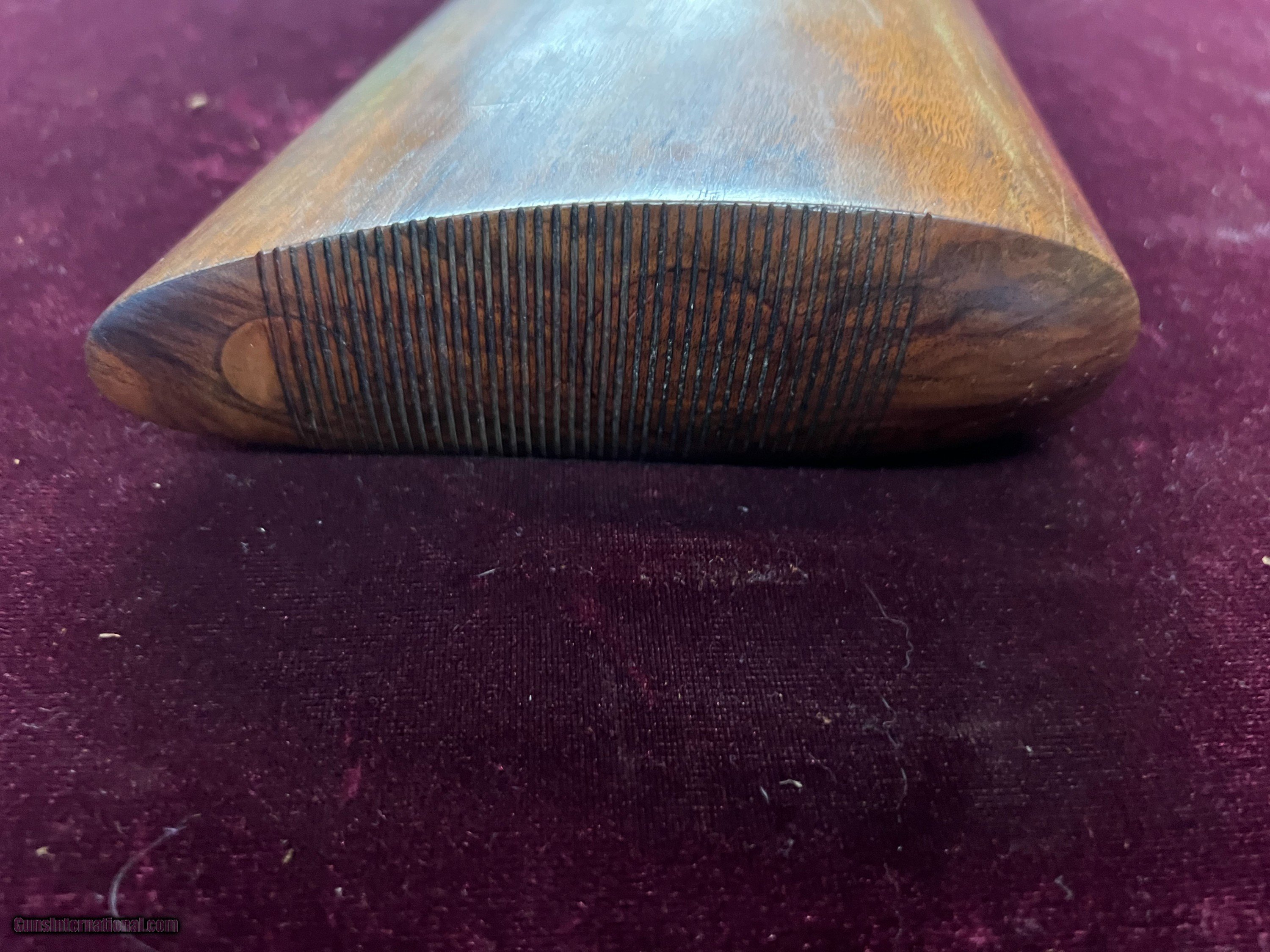 Description: Hello all. In this listing we are selling a very nice Joseph Land Boxlock Ejector. This Side by Side shotgun is chambered in 12ga, sporting 28" barrels with Improved Cylinder and 3/4 choke. The length of pull is 14 1/8", weighing 6lbs 10oz, with the drop at comb measuring 2" and the drop at toe measuring 2 1/4". The gun has been nitro proofed at 1 1/8, and the chambers are 2 1/2". The gun is 100% original in every way. The bores are mint, and the action is tight on face. The blue is 95% original, with 50% original case coloros, and the wood is 90% with crisp checkering. This double barrel is very clean and a tight lang in every way. The serial number is 16833. If you have any questions or would like additional photos, please feel free to contact us. Buyer pays shipping. We are selling this one at the very cheap price of $1595 SOLD Shotgun Gauge: 12 Gauge Manufacturer: Joseph Lang Model: BLE Serial Number: 16833 Barrel Length: 28 LOP: 14 1/8 Weight: 6lbs 10oz |
