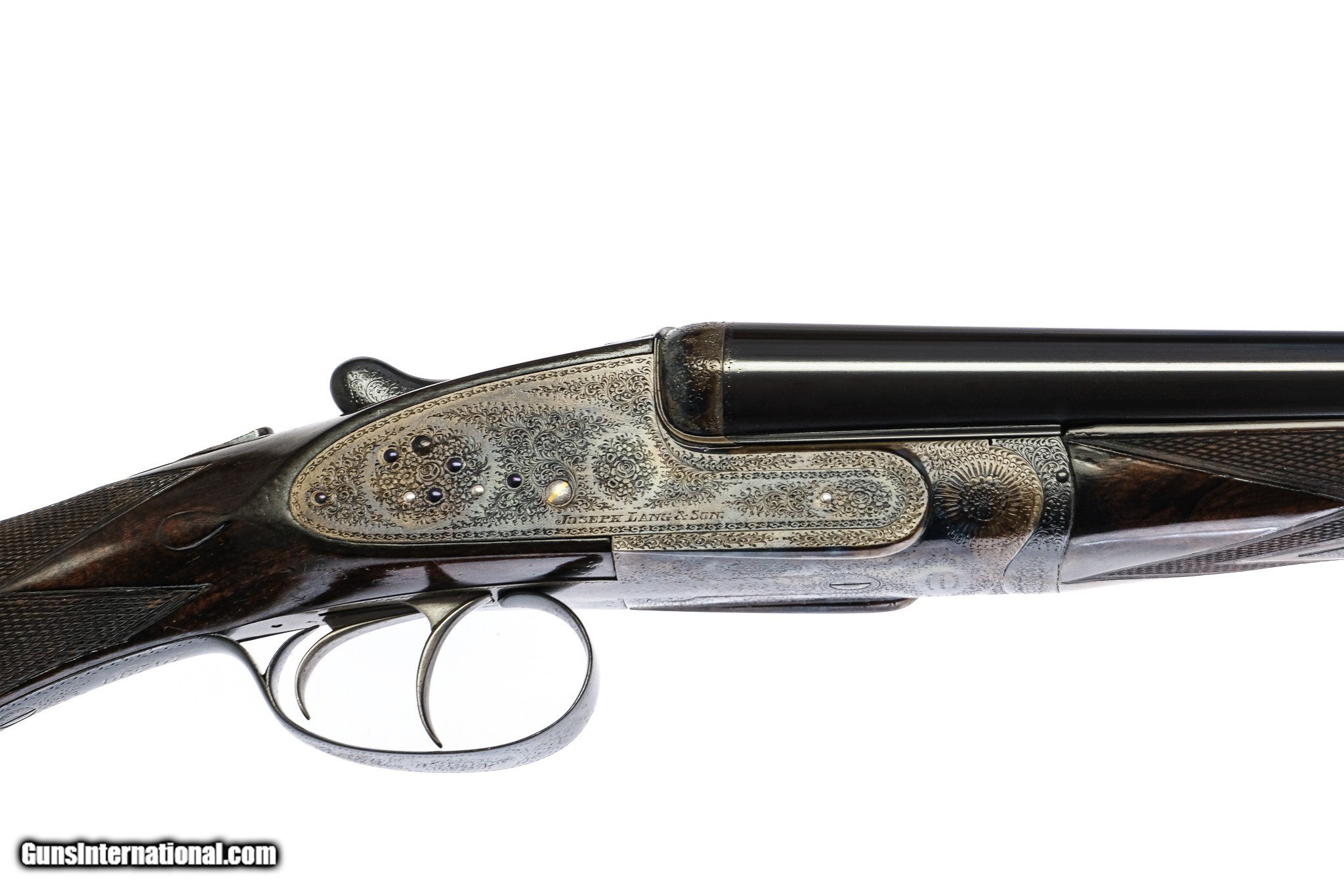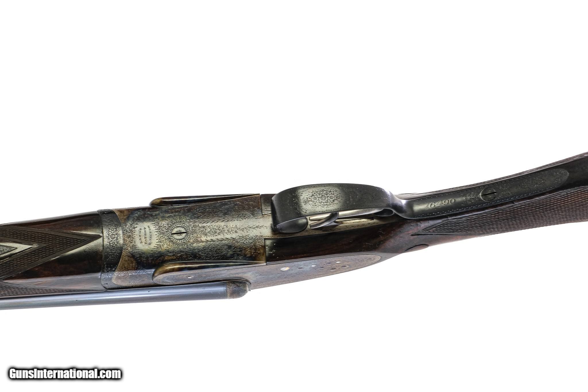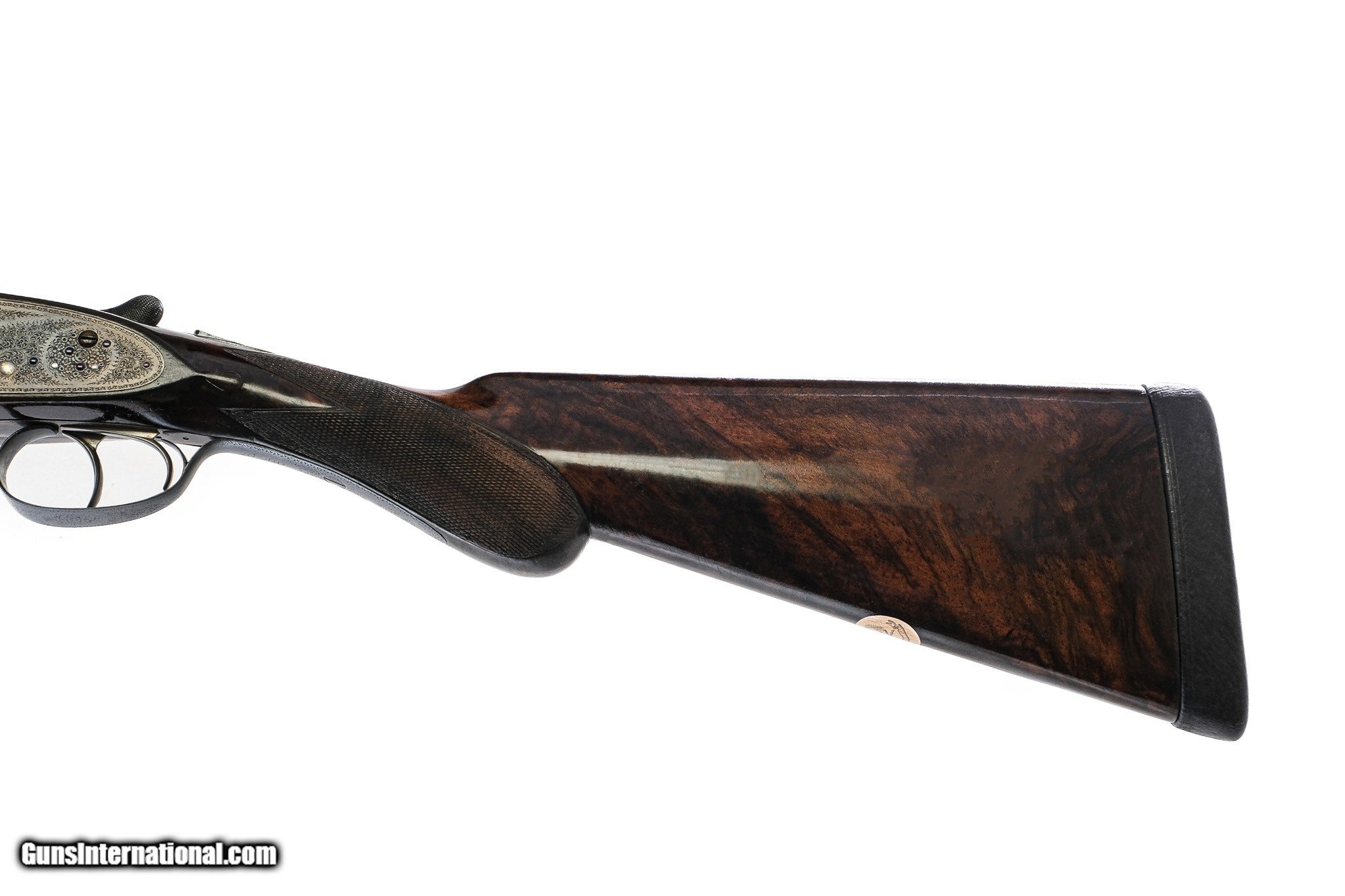 Description: Joseph Lang & Son - Full Sidelock, SxS, 20ga. 28 1/2" Barrels Choked CYL/M. Made in 1923, 28 1/2" semi pistol grip. Finest English leather covered pad. 2 3/4" chamber. Originally #2 of a pair. This gun has been completely restored at no expense spared. Perfect screws, perfect barrel blue, checkering. The engraving on this gun is superb. The gun is tight as new. Double trigger, automatic ejector. Gold oval has a crest on it. Cartouche has lang patent ejector. This is a very high quality gun that looks like the day as it was made. Neutral Cast. Choked Cylinder/Modified. This is a very high quality London sidelock side bore. Inv: 76237 5 lbs. 14 oz. 14 3/4" x 1 1/2" x 2 3/8" $8,995.00 SOLD |